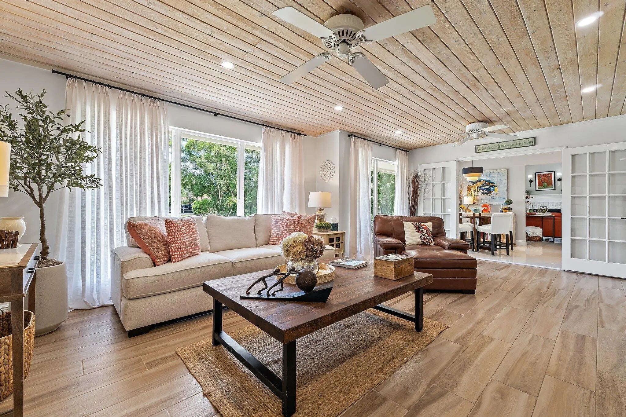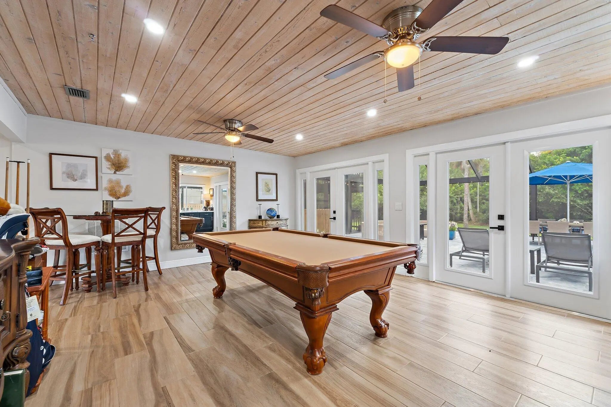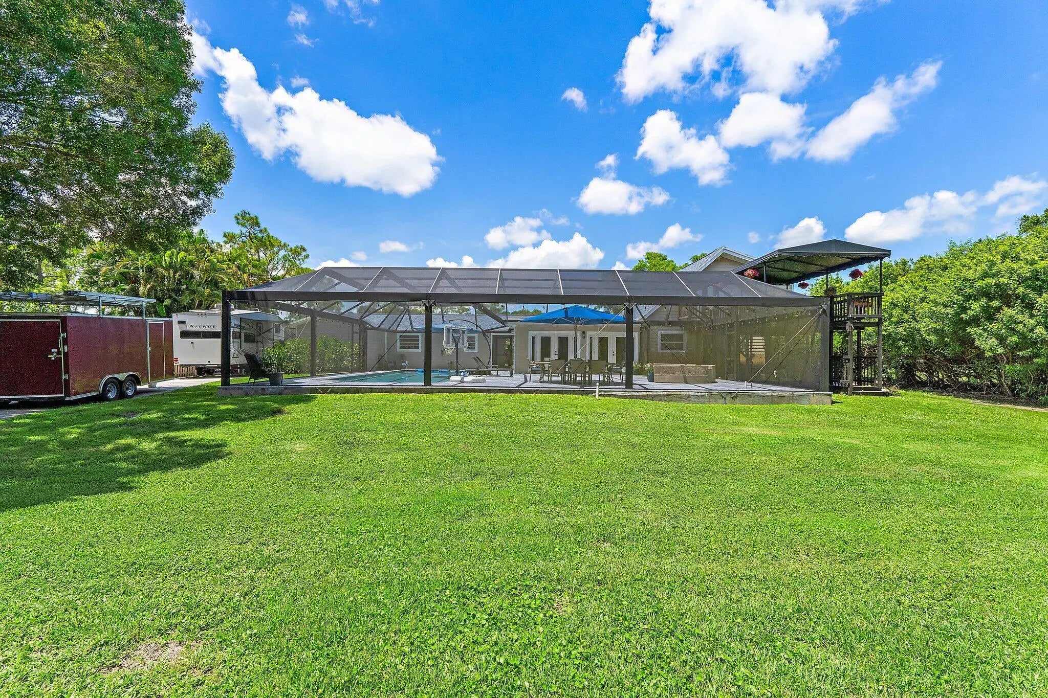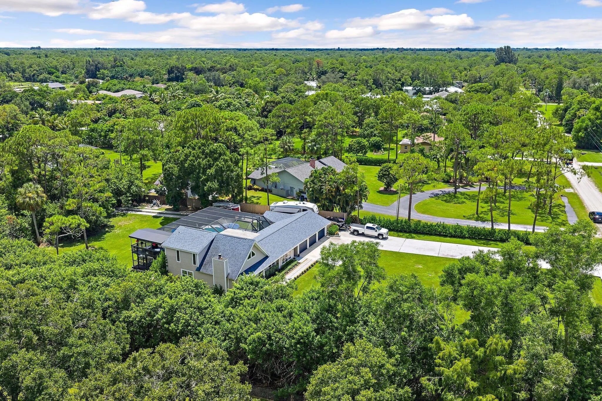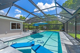 Jupiter Farms lifestyle in this beautifully updated 3BR/3BA pool home on 1.25 private acres with no HOA and plenty of room for RVs, boats, horses, and extra vehicles. This property blends farmhouse charm with modern upgrades: 2022 roof, partial impact windows, and a 2023 hurricane-rated panoramic pool enclosure. Inside, you'll love the spacious family room with custom built-ins, solid oak loft, and a remodeled kitchen with quartz countertops, appliance garage, stainless hood, island seating, and under-cabinet lighting. All three bathrooms have been completely renovated with quartz, seamless glass, upgraded lighting, and custom cabinetry. Flooring includes large-format porcelain tile, engineered wood, and solid oak stairs. The private upstairs primary suite features a sunny deck overlook the property. The 3rd bedroom doubles as a home office with custom built-ins. Outside is where this home shinesa 30-ft screened patio, saltwater pool with heater + chiller, lush landscaping, and summer kitchen hookups already in place. A rare 3.5-bay garage offers exceptional storage or workshop potential. Newer mechanicals: Roof 2022, Pool Heater/Chiller 2022, A/C units 2016 & 2022, Kitchen 2021, Bathrooms 2021-22. Enjoy unmatched privacy, quiet, and the feel of true Jupiter Farms livingyet minutes to Publix, restaurants, I-95, the turnpike, and A-rated schools.