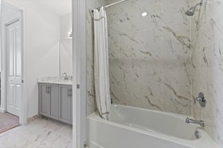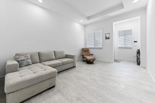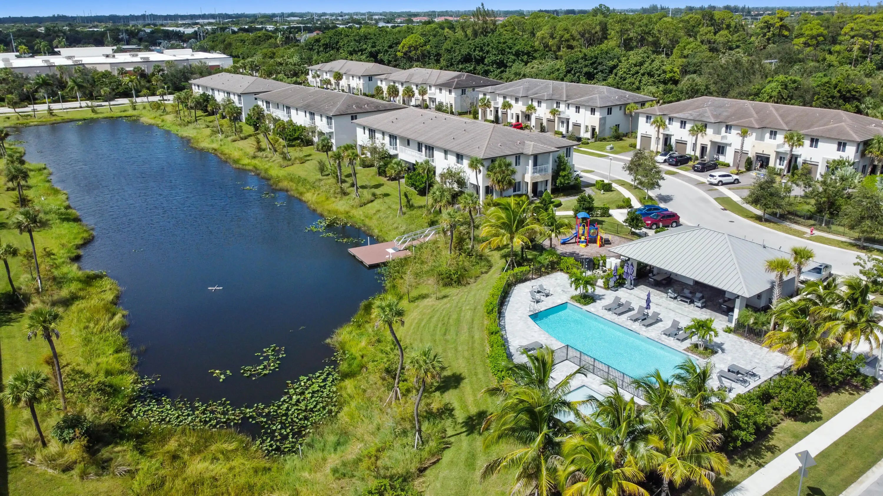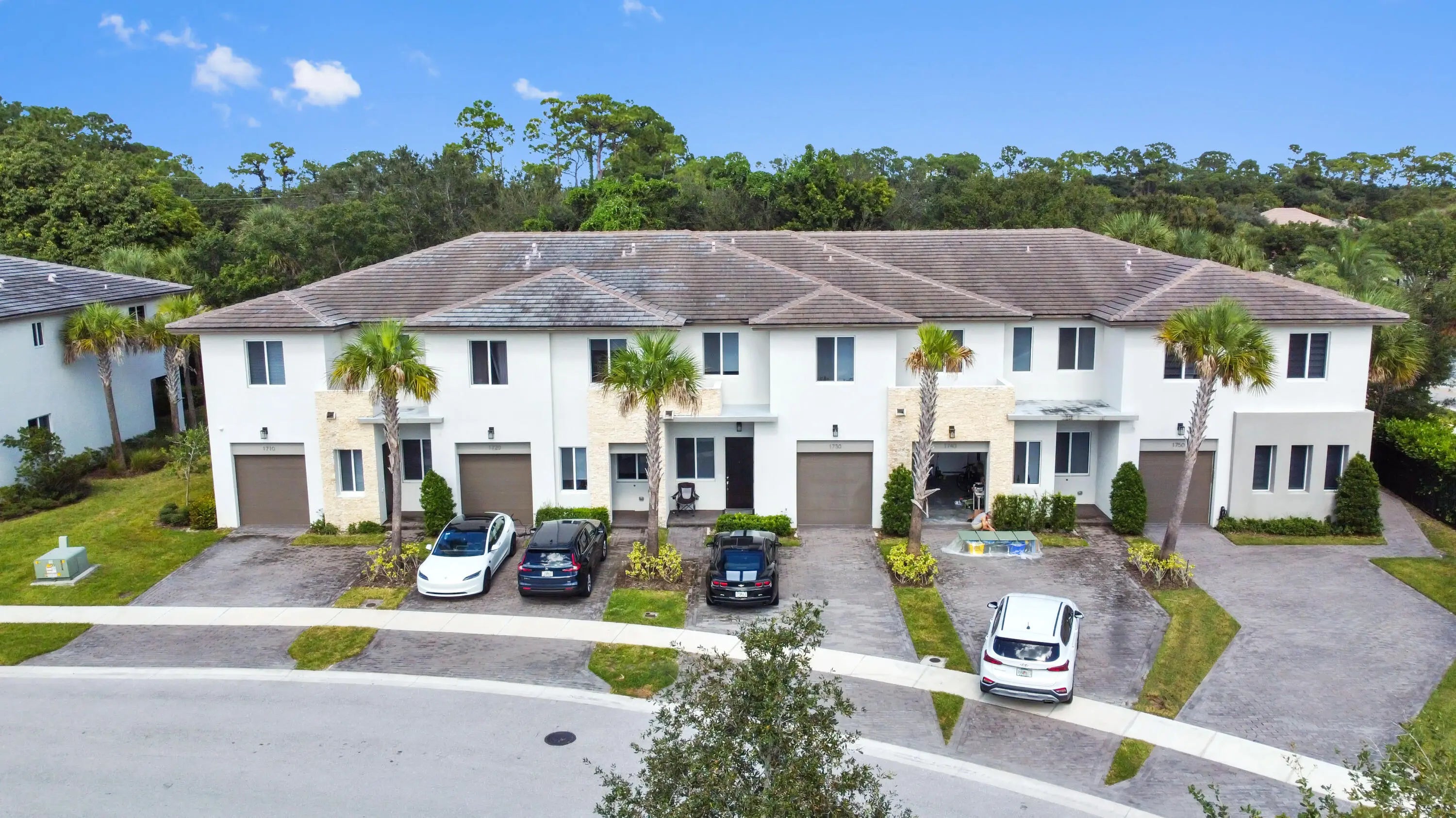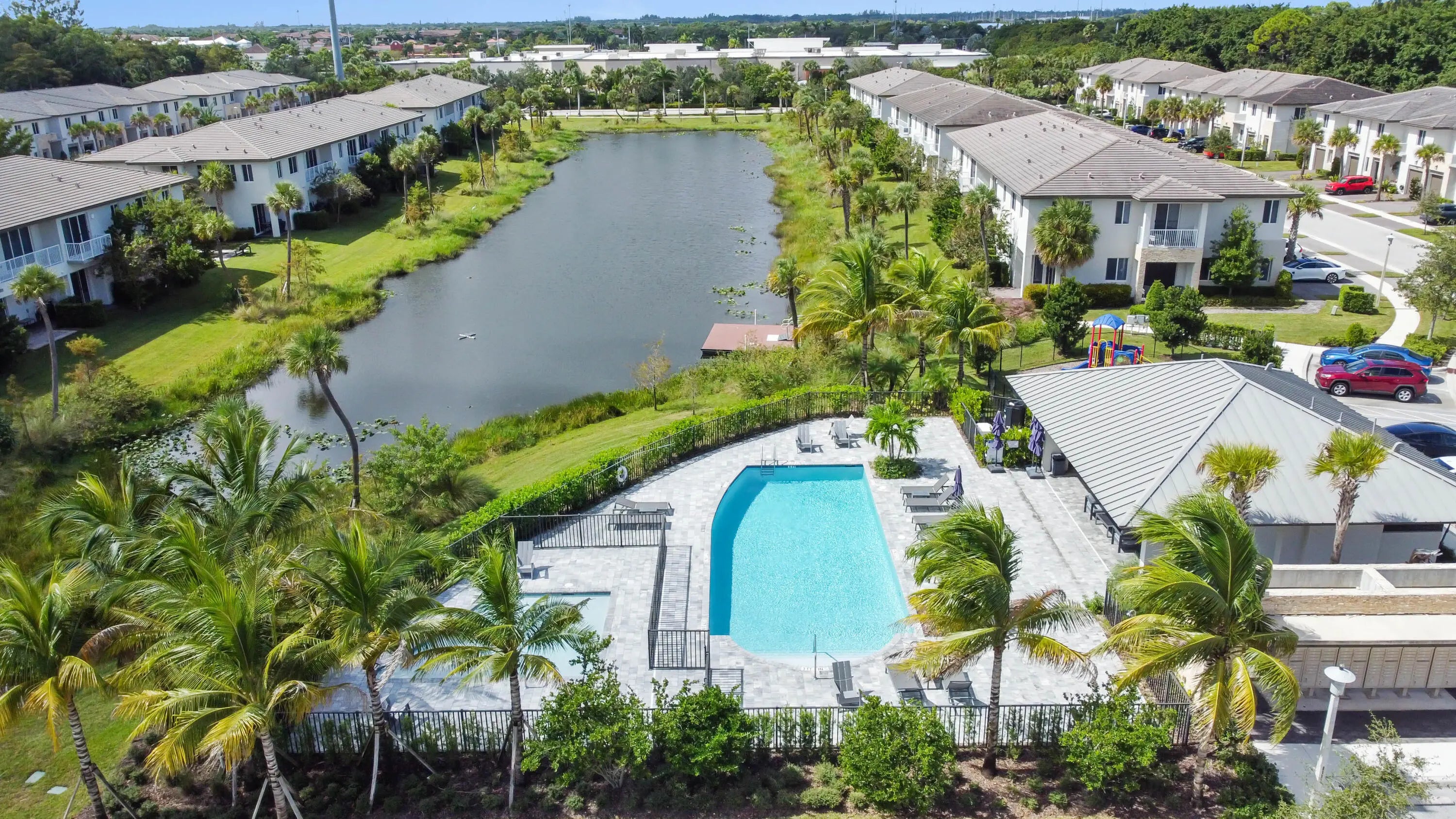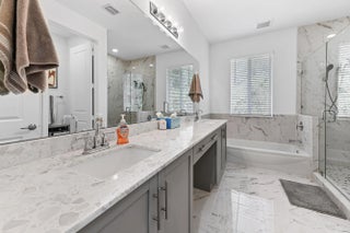 Welcome to this spectacular, modern two-story townhome, where contemporary style and a high-end finishes define the living experience in a beautifully maintained property and community. The entire residence is finished with elegant flooring and a pristine white and gray color palette. The master suite is a luxurious sanctuary, featuring a private balcony and a relaxing master bath that is like a spa. This bath boasts a stunning extended dual-sink vanity topped with white marble-look quartz, providing exceptional storage and counter space. The shower is a masterpiece, offering a separate soaking tub and a large glass-enclosed walk-in shower fully finished with high-end, continuous marble-look tile and a river rock floor. The outdoor living spaces are designed for private relaxation. The upper level features a private balcony with classic white railings and a tropical tree view. On the ground level, a covered, paver patio extends off the main living area, creating a perfect spot for grilling and outdoor seating, with a small, private lawn area framed by lush greenery. The entire community is set around a picturesque central lake and features clean lines and uniform architecture, as seen in the aerial views. This home offers ultimate convenience, including a large walk-in closet with custom shelving and drawers in the primary suite. The property's rear exterior is clean white stucco, featuring impact-resistant sliding doors that connect the indoor and outdoor living. This home represents a rare opportunity to own a contemporary sanctuary with a luxurious multiple living areas, open concept kitchen, living and dining rooms with a wet bar and beautiful outdoor spaces in a highly desirable, well-maintained community.