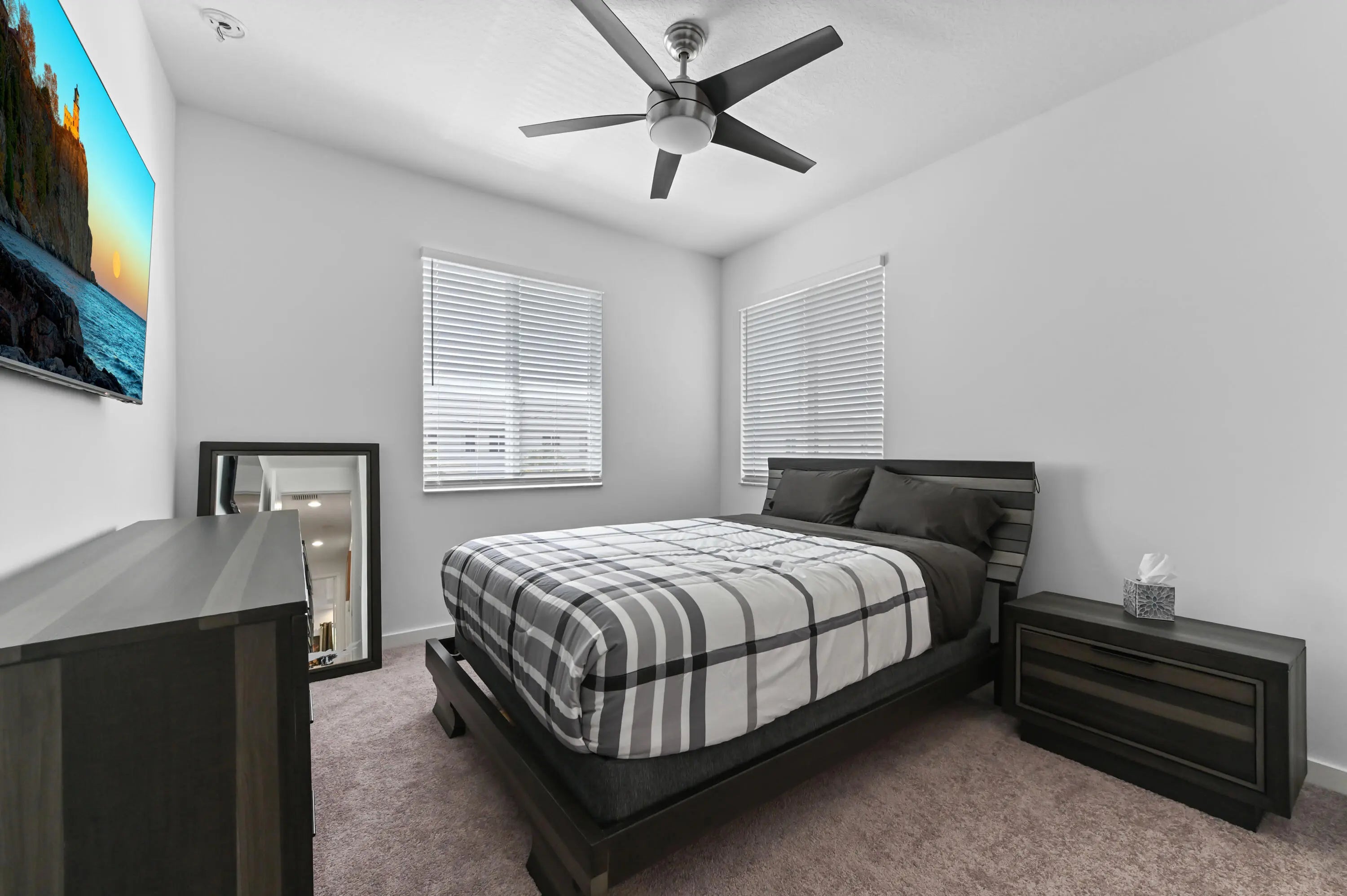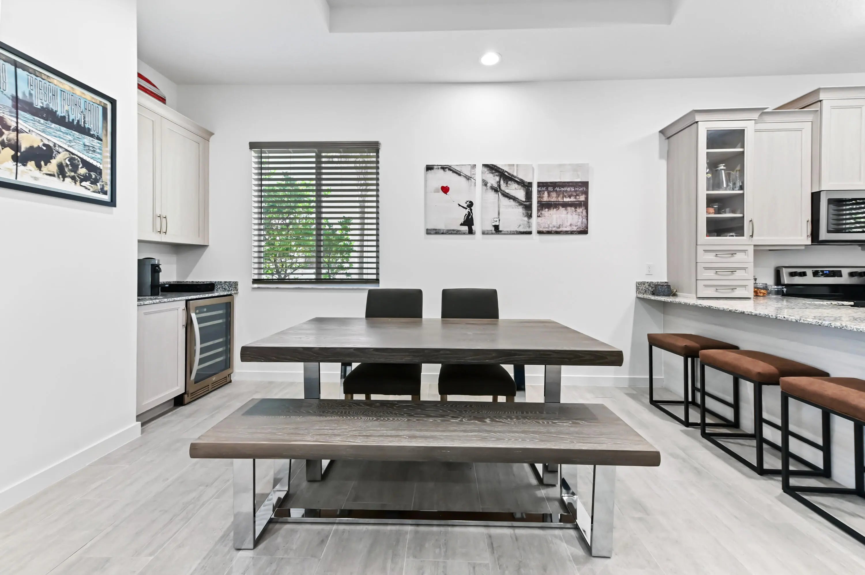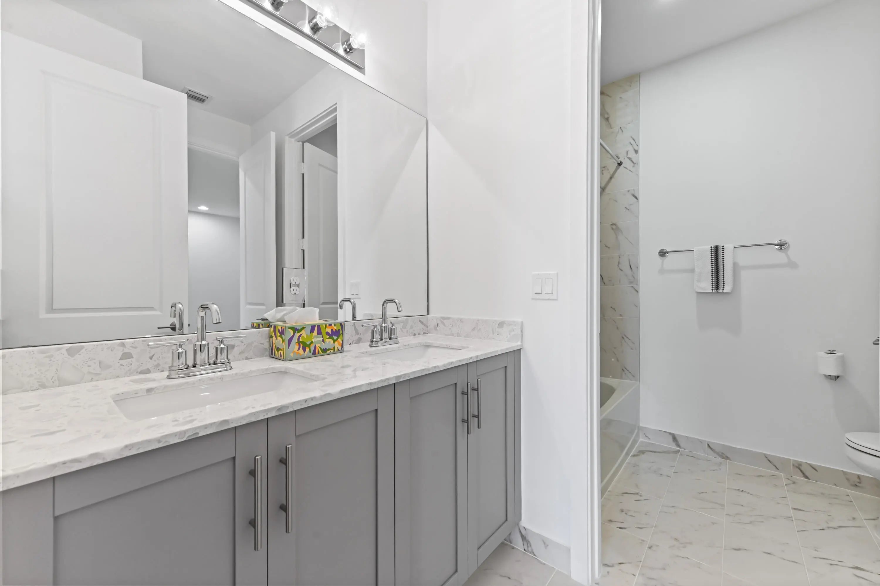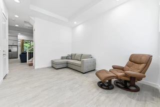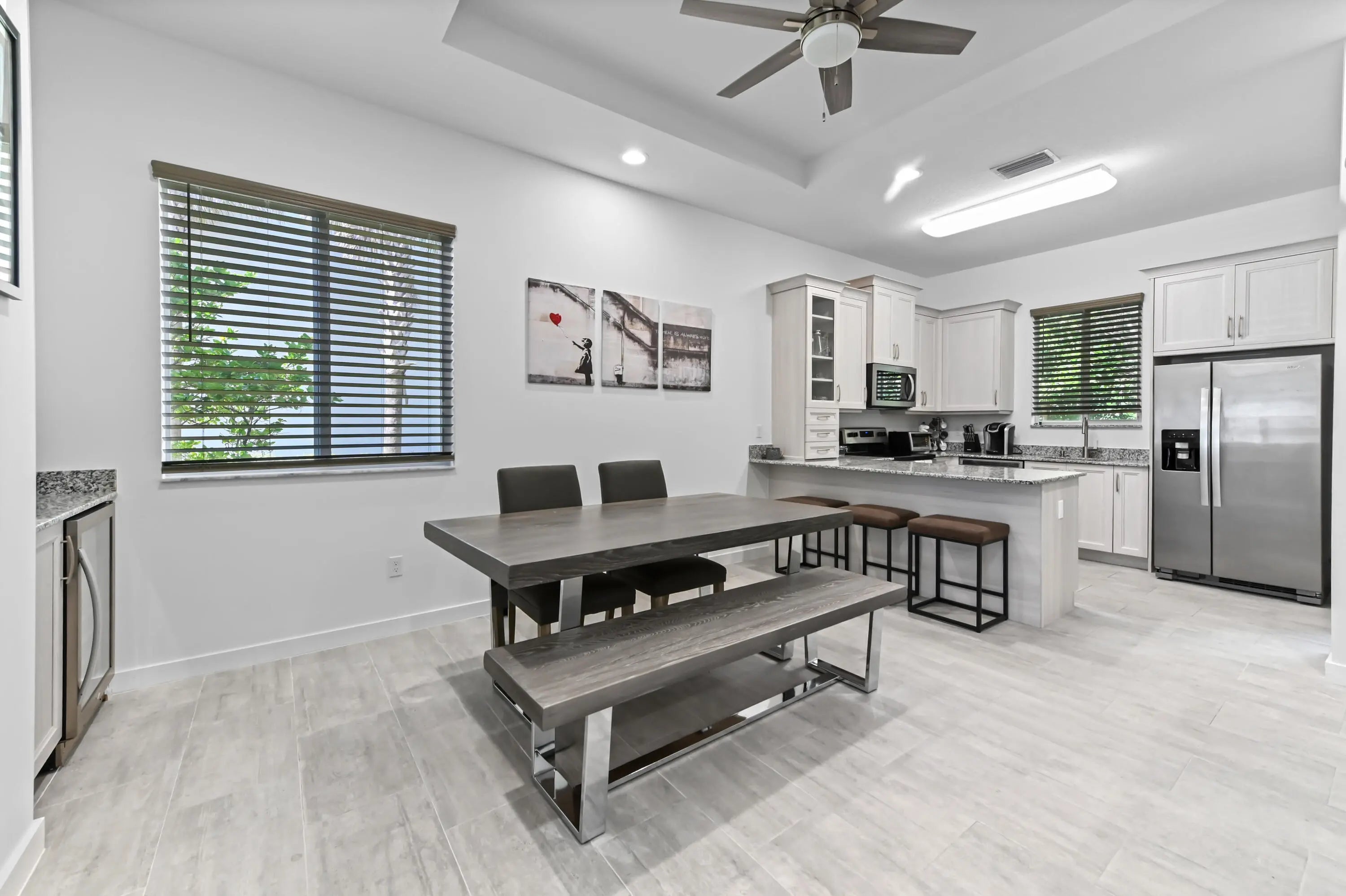 Welcome to this spectacular, modern two-story townhome, where contemporary style and a high-end finishes define the living experience in a beautifully maintained property and community. The entire residence is finished with elegant flooring and a pristine white and gray color palette. The master suite is a luxurious sanctuary, featuring a private balcony and a relaxing master bath that is like a spa. This bath boasts a stunning extended dual-sink vanity topped with white marble-look quartz, providing exceptional storage and counter space. The shower is a masterpiece, offering a separate soaking tub and a large glass-enclosed walk-in shower fully finished with high-end, continuous marble-look tile and a river rock floor. The outdoor living spaces are designed for private relaxation. The upper level features a private balcony with classic white railings and a tropical tree view. On the ground level, a covered, paver patio extends off the main living area, creating a perfect spot for grilling and outdoor seating, with a small, private lawn area framed by lush greenery. The entire community is set around a picturesque central lake and features clean lines and uniform architecture, as seen in the aerial views. This home offers ultimate convenience, including a large walk-in closet with custom shelving and drawers in the primary suite. The property's rear exterior is clean white stucco, featuring impact-resistant sliding doors that connect the indoor and outdoor living. This home represents a rare opportunity to own a contemporary sanctuary with a luxurious multiple living areas, open concept kitchen, living and dining rooms with a wet bar and beautiful outdoor spaces in a highly desirable, well-maintained community.
