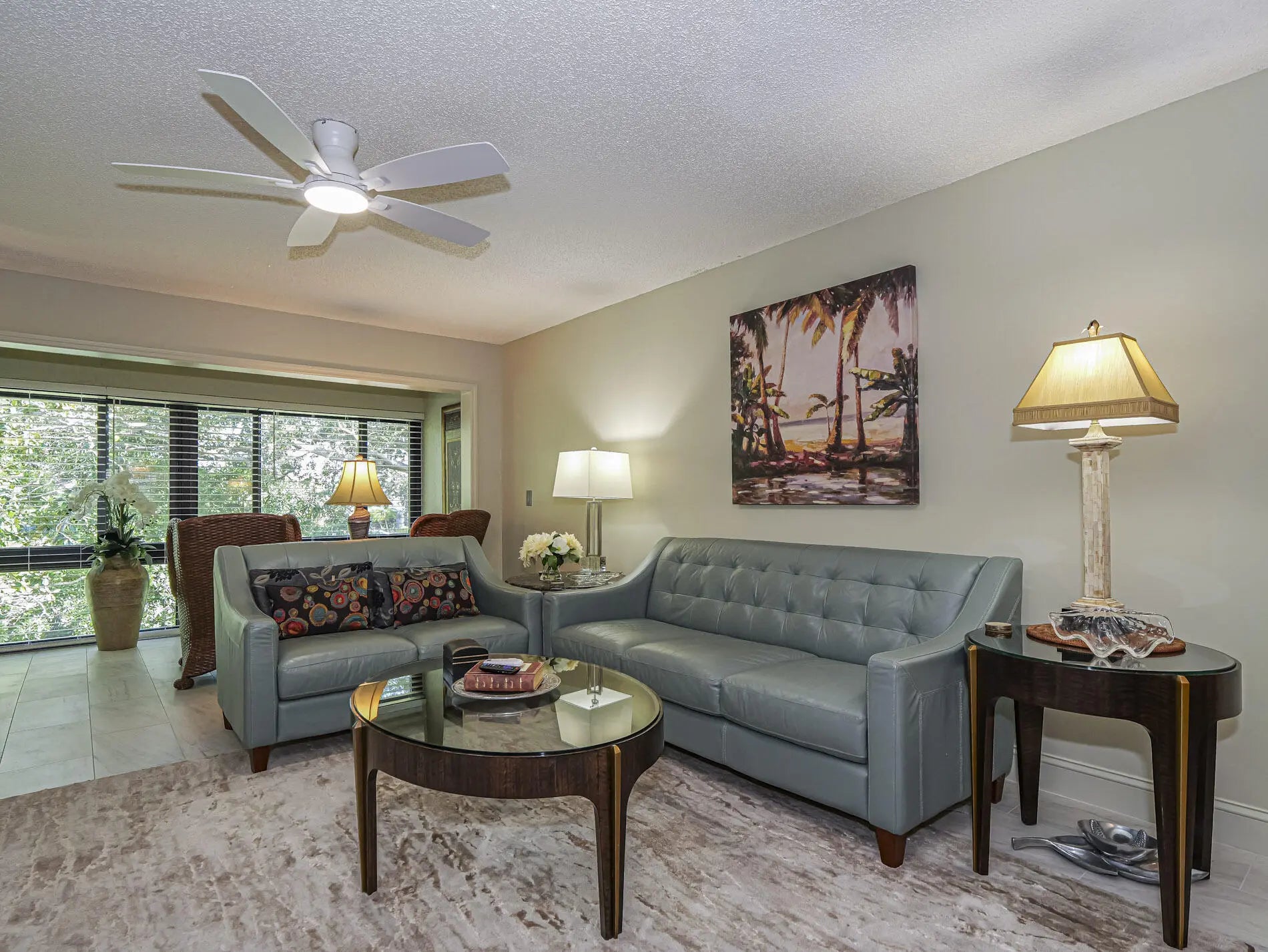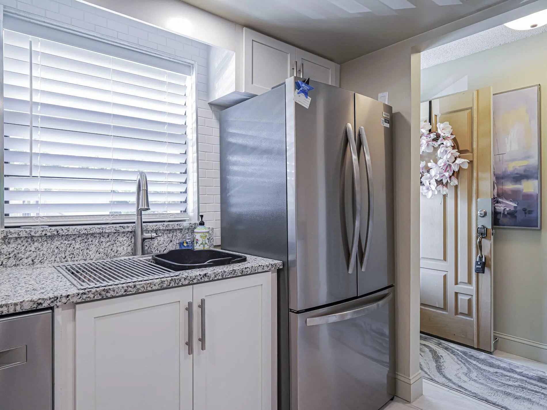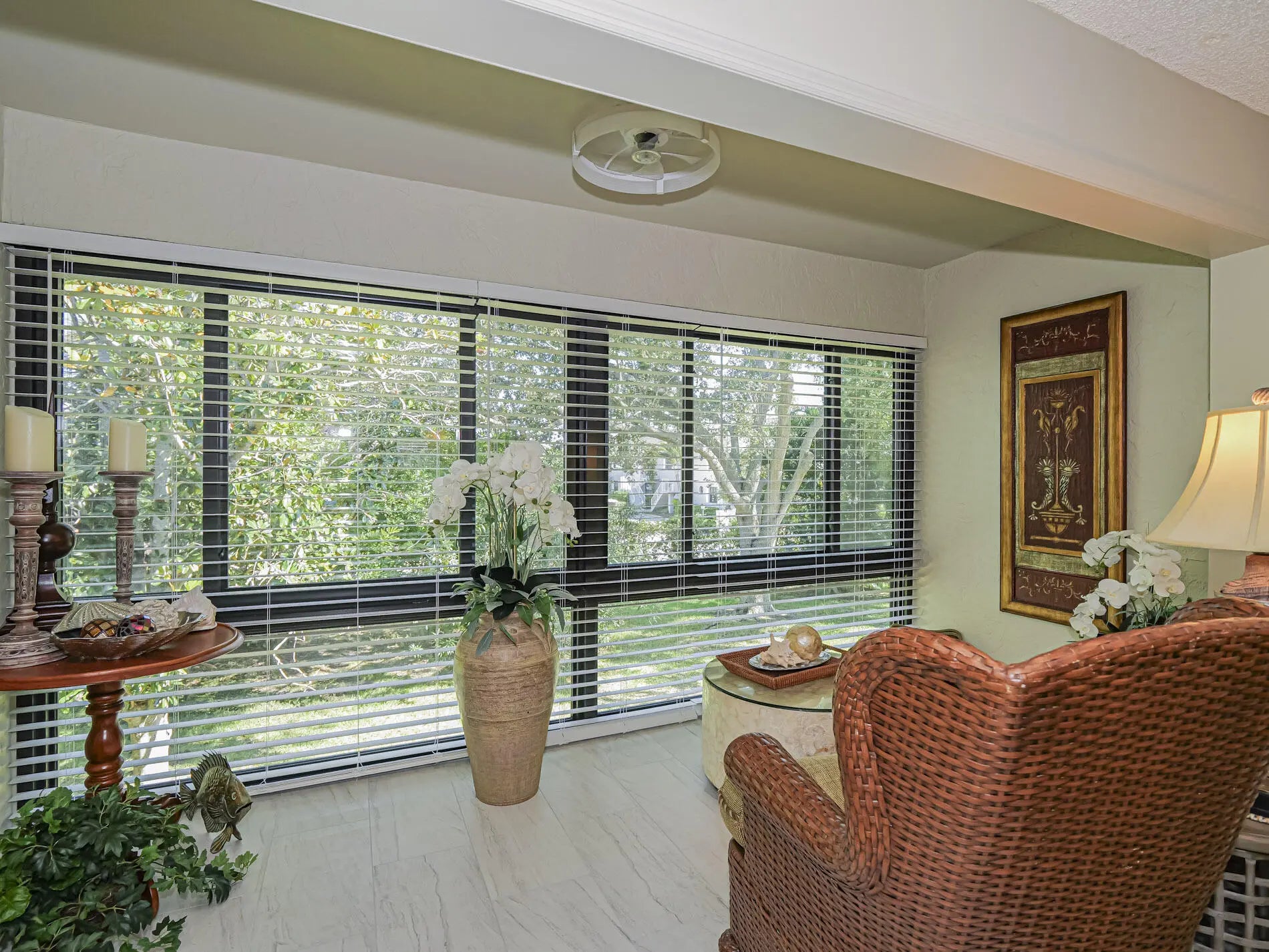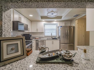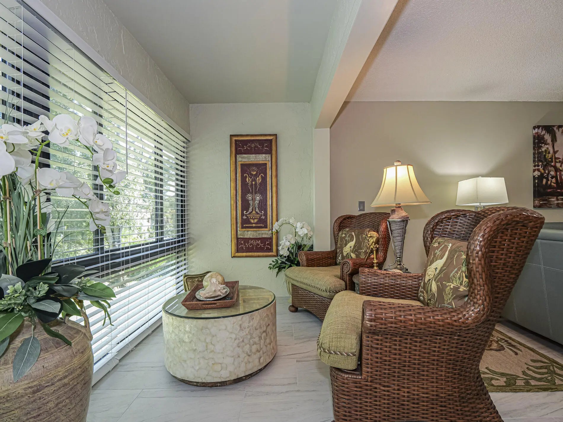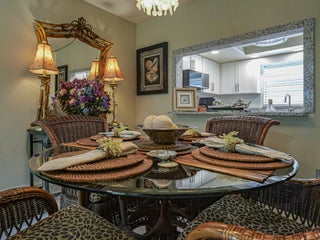 Being sold furnished, this completely remodeled split BR plan 2/2 has nearly 1150 sq ft. Gorgeous kitchen with stone counters and stainless steel --all newer appliances and fixtures. Stone tile flooring throughout. Spacious living-dining area expands to enclosed glassed in porch with view or garden area. Large primary BR with updated bath - 2nd BR with queen bed and full bath in hall. Designer touches throughout! Oak Park Terrace is just 2 miles to beaches and closer to shops and stores. Complex has heated pool and tennis. 55+ with no pets allowed -- coin op laundry.