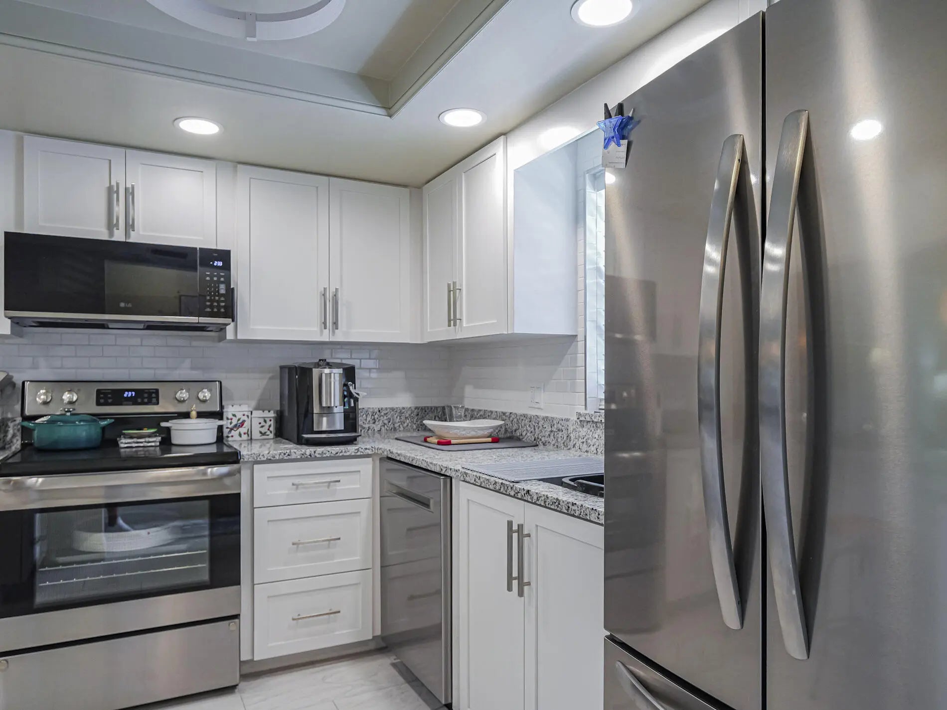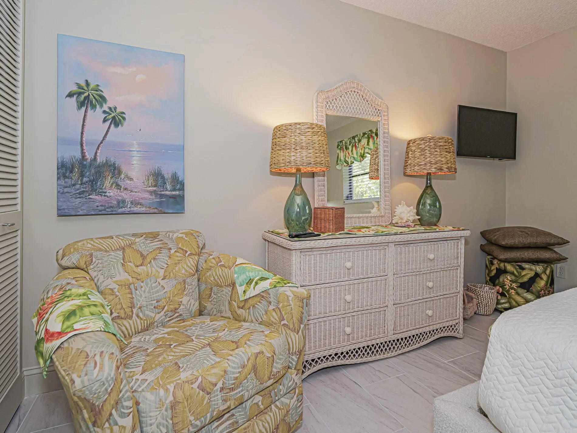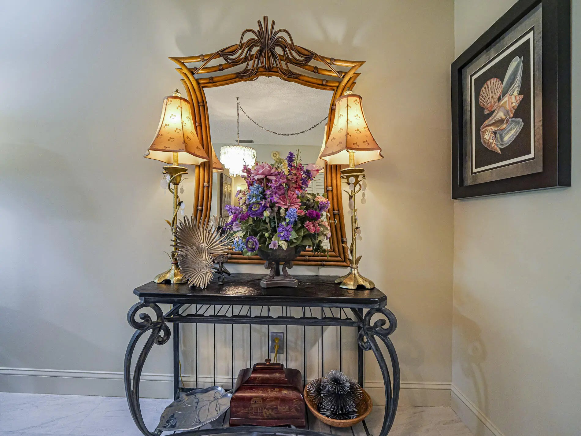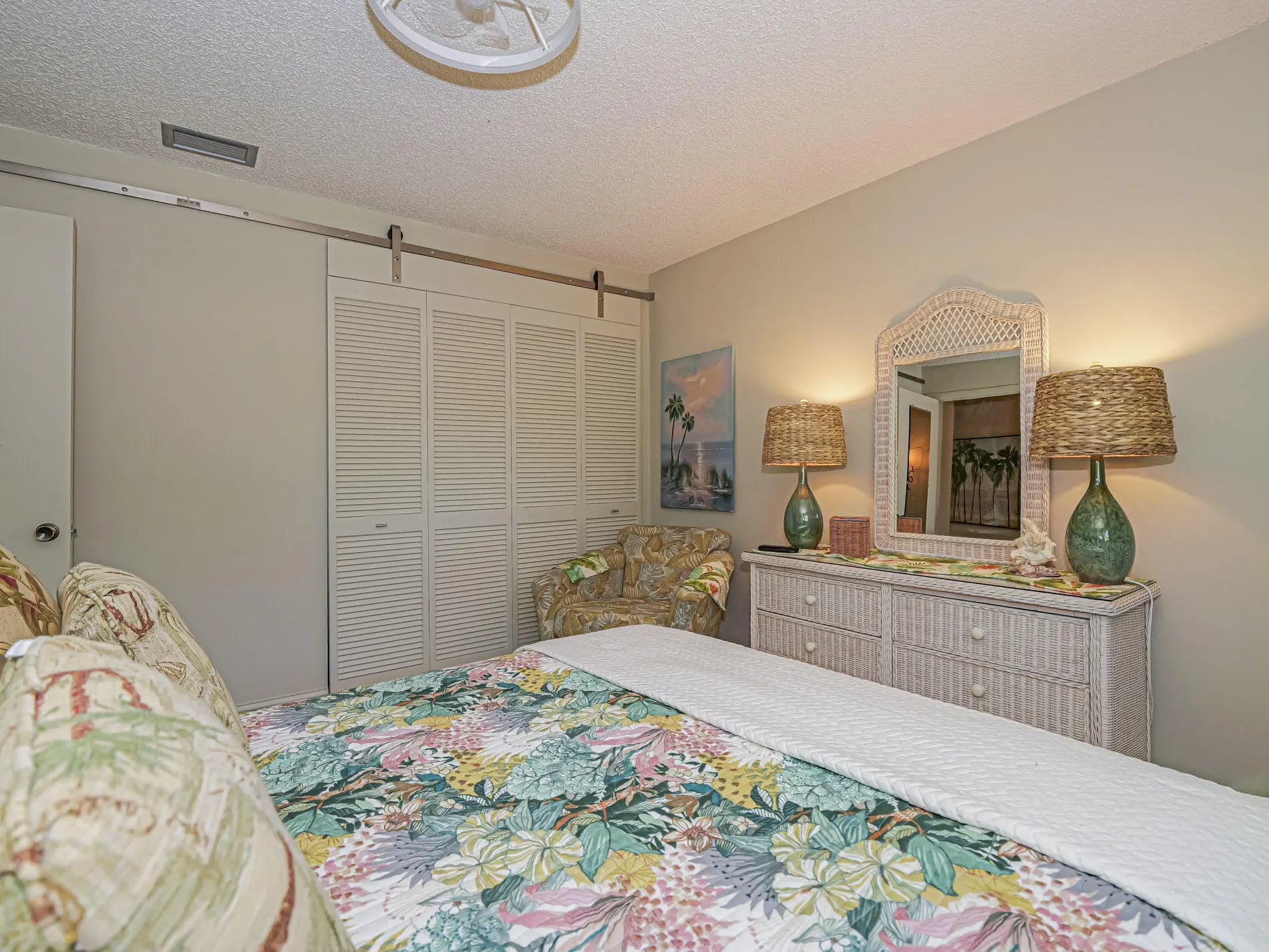 Being sold furnished, this completely remodeled split BR plan 2/2 has nearly 1150 sq ft. Gorgeous kitchen with stone counters and stainless steel --all newer appliances and fixtures. Stone tile flooring throughout. Spacious living-dining area expands to enclosed glassed in porch with view or garden area. Large primary BR with updated bath - 2nd BR with queen bed and full bath in hall. Designer touches throughout! Oak Park Terrace is just 2 miles to beaches and closer to shops and stores. Complex has heated pool and tennis. 55+ with no pets allowed -- coin op laundry.