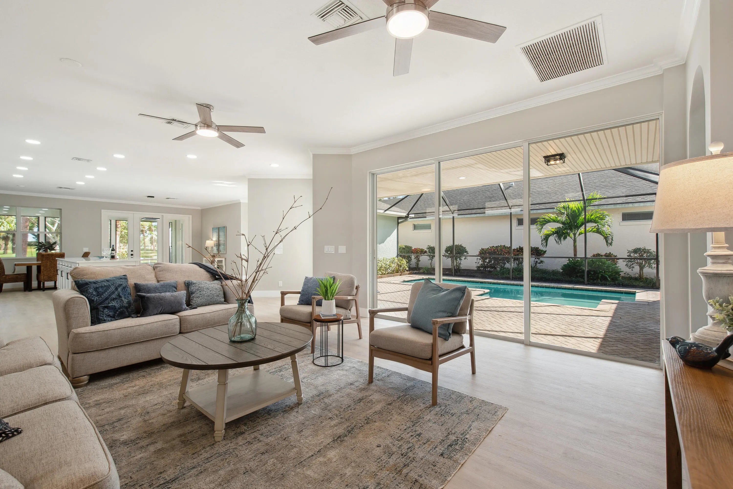 Welcome to this lovely 3 bedroom, 3 bathroom home. Nestled on a quiet, tree-lined street, this home has been nicely renovated and presents a modern contemporary, open concept feel. The courtyard style home offers a private heated pool with a completely separate studio bedroom/bathroom. The spacious living area offers plenty of room to relax and entertain. Large windows fill the home with natural light, creating a bright and airy atmosphere. In the modern kitchen, enjoy preparing meals in the fully equipped kitchen with updated appliances, brand new cabinetry, and quartz countertops with plenty of space for all your cooking needs. Outdoors, there are two private screened patios. The tranquil backyard offers a golf course view perfect for grilling, gardening, or simply enjoying the Florida sunshine. The second is the serene courtyard pool view. Additionally there is a two car garage for extra storage and parking, a convenient laundry room and the convenience of an HOA for a low-maintenance easy upkeep yard. This charming home is waiting for you to make it your own! Don't miss out on this exceptional opportunity in one of Vero Beach's most sought-after neighborhoods. Schedule a showing today!