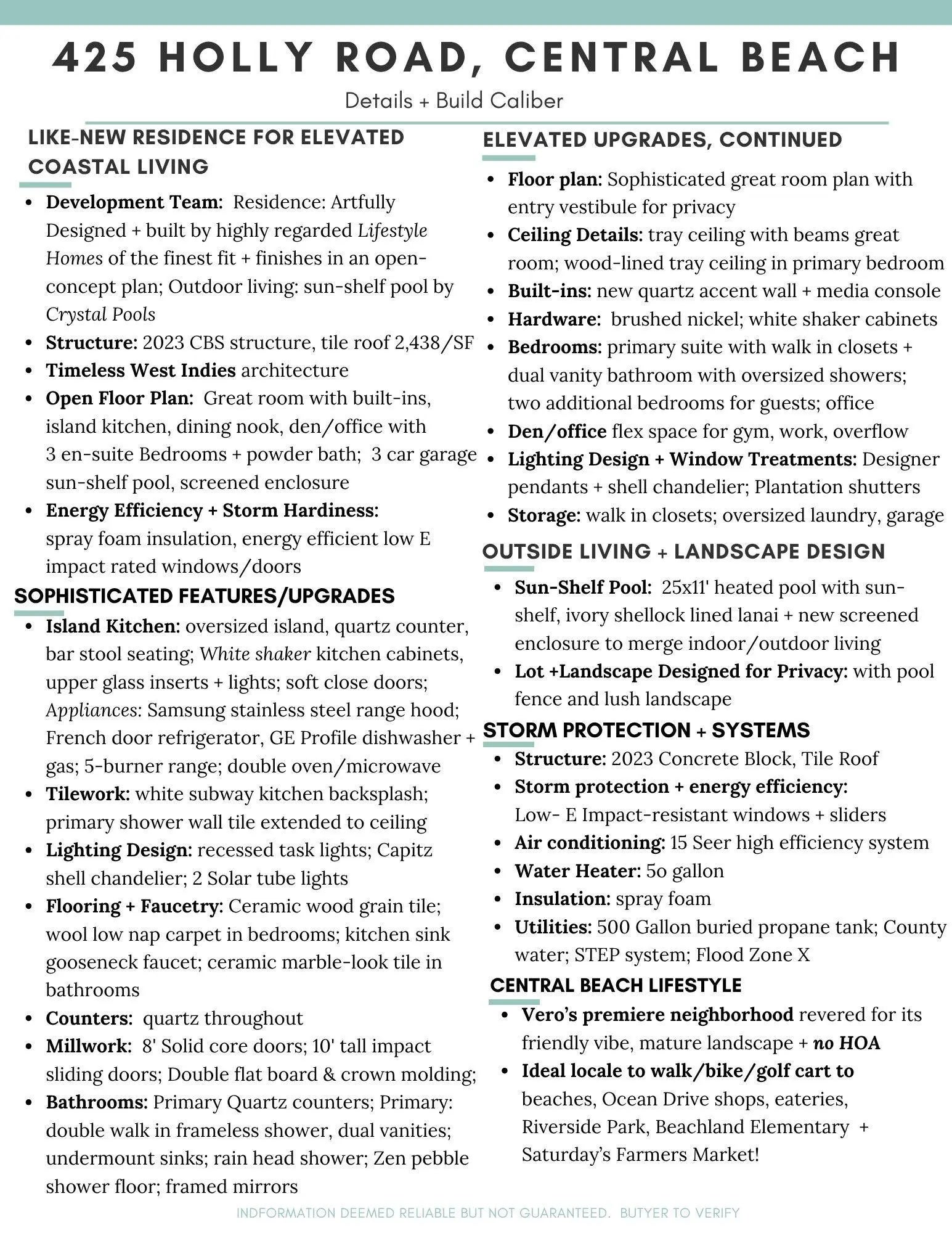 A true unicorn: a like-new pool home set in an enclave of new builds + renovations in a coveted quadrant of Central Beach where the vibe is laid back, the build + specs are elevated + to current code -- with no wait or budget over-runs with a new build! A little-used residence with smart upgrades you'll love like a new pool enclosure to merge indoor/outdoor living + handsome quartz accent wall with media console. 3 car garage for abundant storage; open concept plan with luxe fit/finish in a 'walk/bike/golf cart to all things Vero' incl beach, marina, Ocean Dr+ Beachland Elementary! A rare gem!