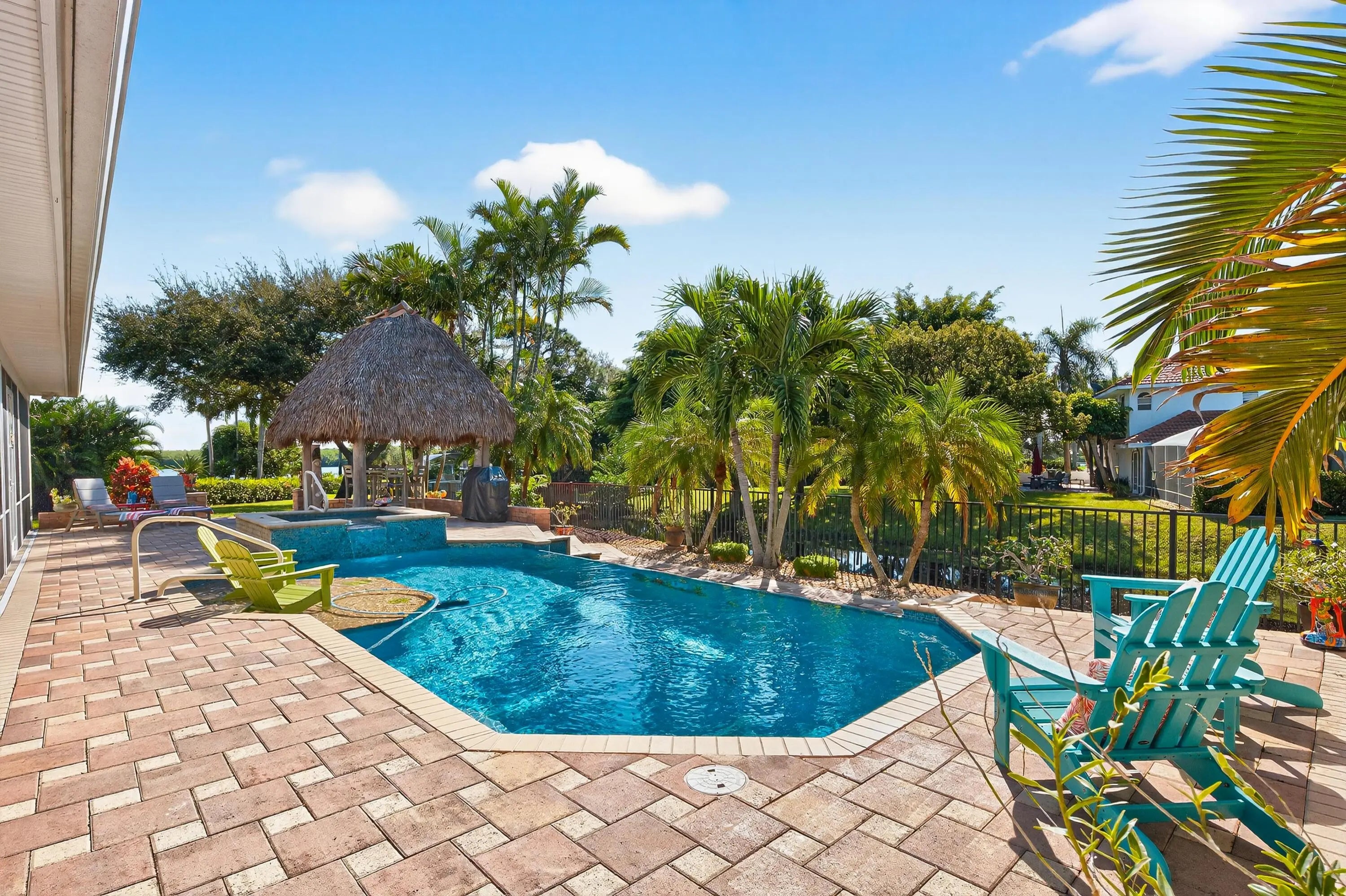Discover the ultimate Florida lifestyle in this stunning waterfront home offering 250 feet of canal frontage just off the St. Lucie River with ocean access. Set on over a half acre on a quiet cul-de-sac, this 2 story home features a new metal roof (2023), complete impact glass, and a gorgeous infinity-edge pool with spa beside a tropical tiki hut. Enjoy a new seawall and composite dock (2024) with boat lift—perfect for effortless days on the water, sunset cruises, or weekend adventures. The wrap-around porch and expansive back patio create ideal spaces to relax and take in the water views. Inside, you'll find a stunning updated kitchen, renovated upstairs bath, loft space, plantation shutters, crown molding, and wood-look tile floors. Lush landscaping surrounds the home, creating a private sanctuary of elegance and resort style living. Close to shopping, dining, golf, and beautiful beaches. Easy access to FL Turnpike.