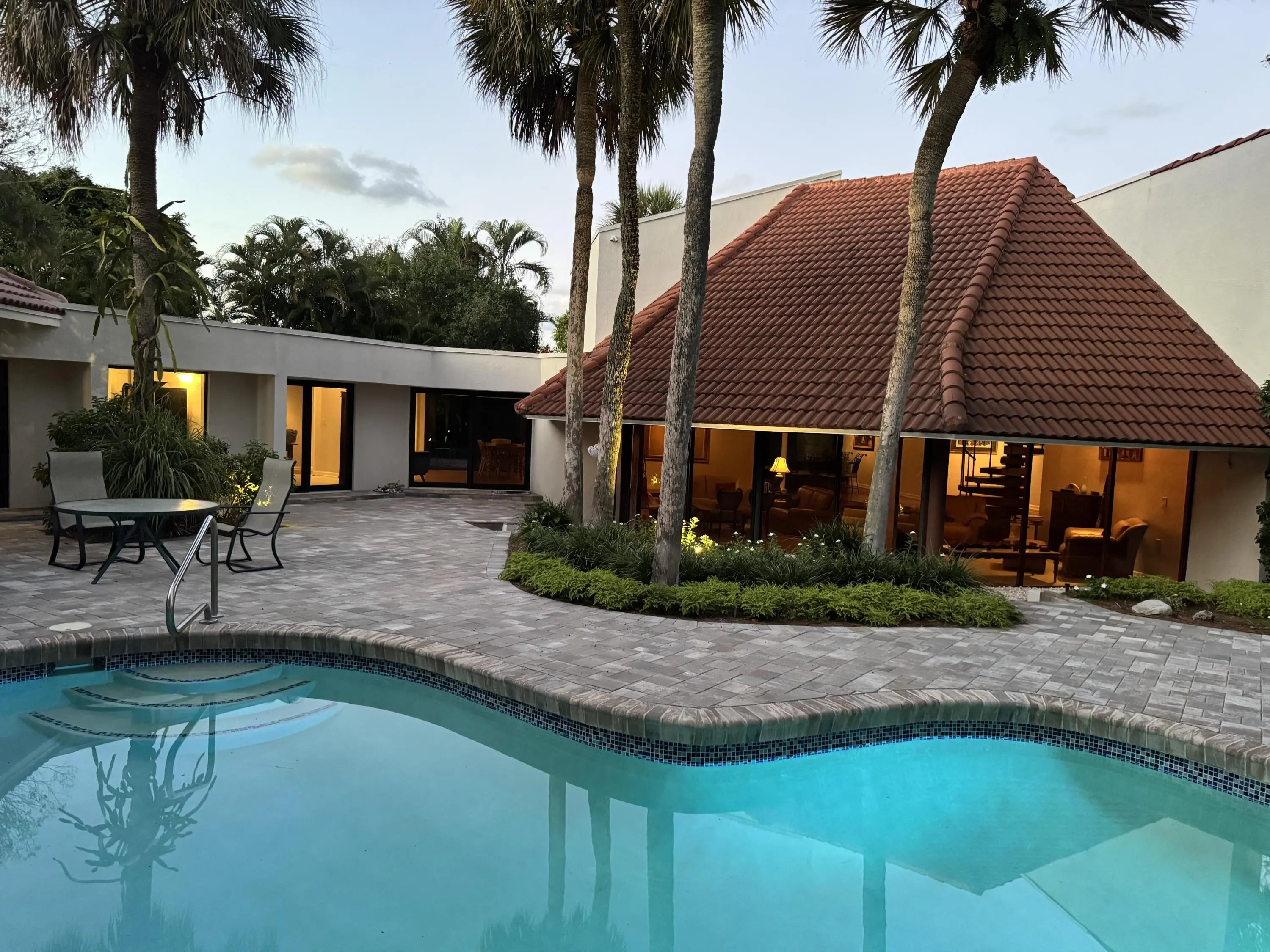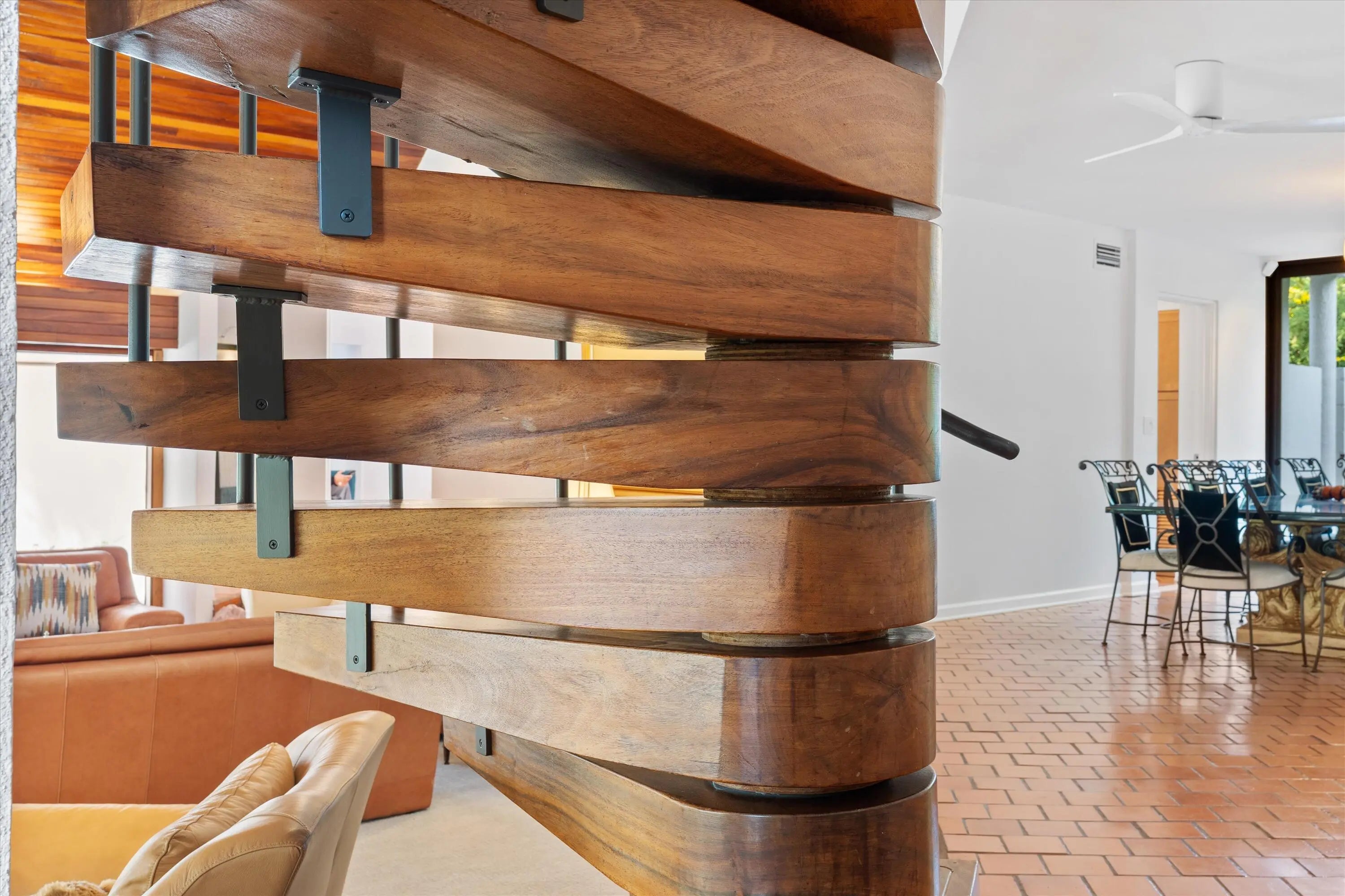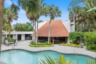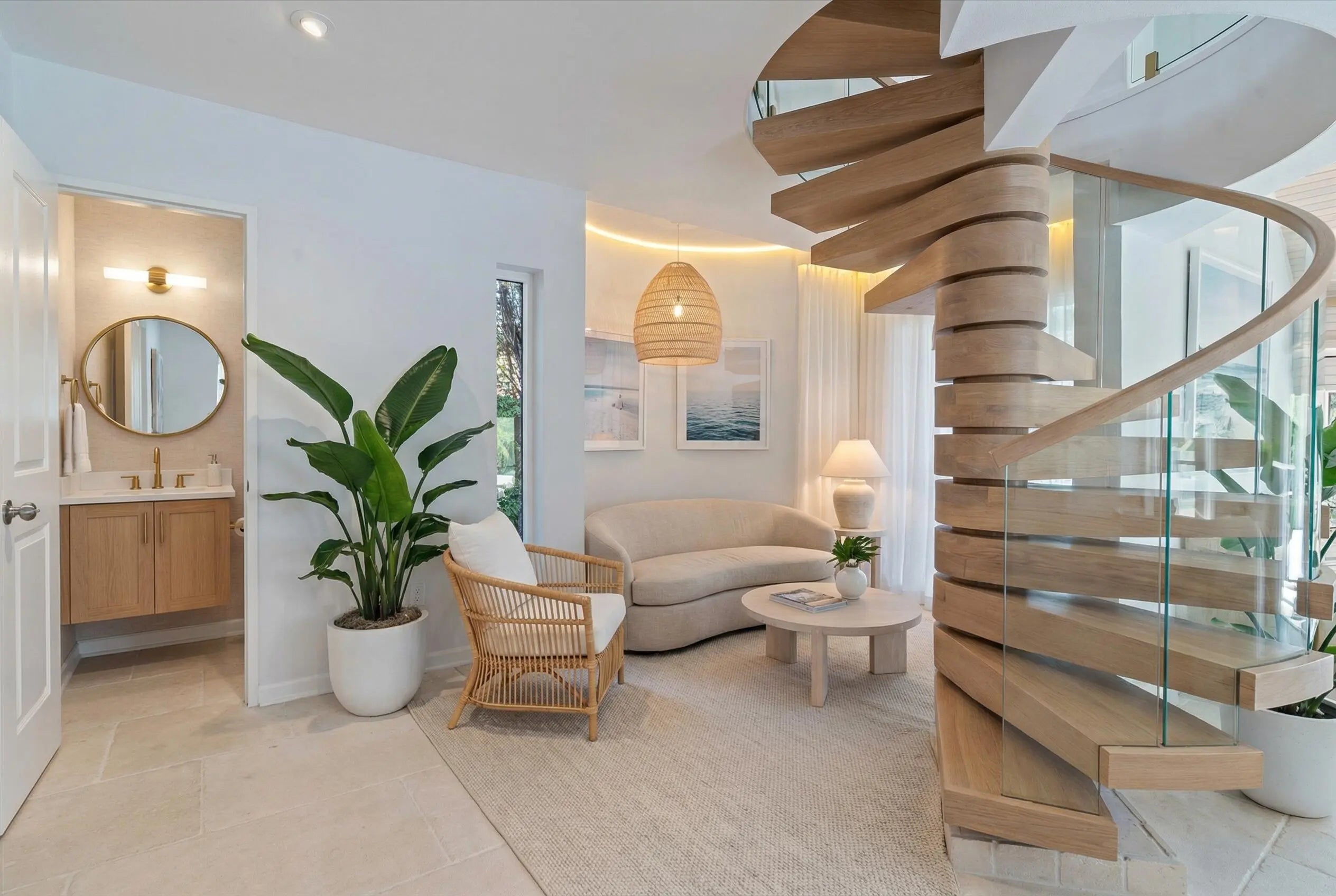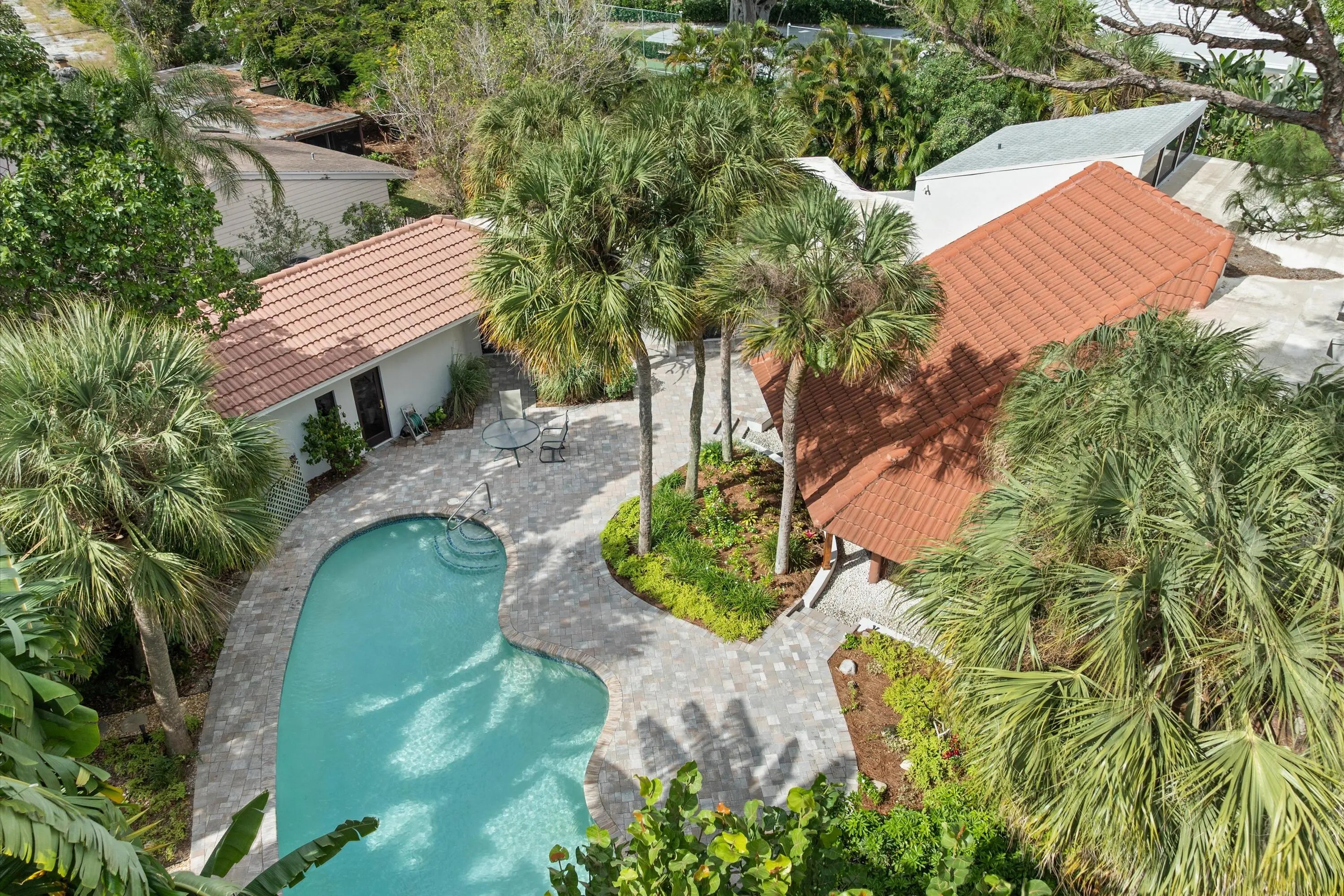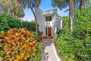 Custom designed by award-winning architect Bob Currie—and originally built as his personal residence—this remarkable home is an architectural treasure in one of Gulf Stream's most desirable, private communities, Place Au Soleil. Offering four bedrooms, three and a half baths, and more than 3500+ square feet of thoughtfully curated living space, the home blends refined artistry with modern comfort, all surrounded by lush, native landscaping that attracts butterflies, birds, and gentle breezes from the nearby Intracoastal. The grounds have been reimagined by Florida native-plant designers to create a water-conserving habitat brimming with essential pollinators and coastal wildlife, and include a dwarf Julie mango tree. A walk through the front garden brings guests along a path of tropical plantings toward a handcrafted wooden door, or directly to the tranquil Zen pool terrace framed by pavers and a pool accented with fresh mosaic tile. Inside, the great room immediately captivates with a dramatic soaring ceiling and staircaseboth crafted from rich Costa Rican Mahoganysetting the tone for an interior defined by organic beauty, natural light, and seamless indoor-outdoor flow. Walls of glass and reinforced sliders open to private courtyards and gardens on all sides, allowing every room to connect with the serene landscape. Designed for both intimate living and effortless entertaining, the home provides dedicated private spaces on each level. The family room offers relaxed dining and direct access to the kitchen, the pool terrace, and the barbeque courtyard. A well-appointed kitchen sits at the heart of the home, featuring granite countertops, a stone backsplash, GE Profile appliances, and soft-close cabinetry. Multiple flex rooms accommodate a variety of lifestyles. A theatre room wired for surround sound opens to the barbeque courtyard and a full bath. An office or additional bedroom overlooks the pool, while a separate personal room off the garage offers an ideal retreat for fitness, hobbies, or work. A guest bedroom features views across the Zen terrace, and another full bath expands to a potential private sun patio accessible only from the bathrooman unexpected and delightful oasis. The spacious laundry room showcases extensive storage and offers fresh style and modern convenience with access to a side garden area. The dramatic spiral staircase leads to the secluded primary suite, where motorized blinds, refined finishes, and quiet treetop views create a luxurious escape. Architect-created plans illustrate the option to expand the second floor with additional rooms and a deck, making the potential of this home even more extraordinary. Outside, uplighting casts a warm glow over the gardens at night, emphasizing the home's curves and distinctive architectural lines. Shutters with hidden tilt add elegance and practicality, while a full alarm system, timed irrigation, and impact-rated windows provide peace of mind. The property sits on a cul-de-sac within a one-entry, one-exit community protected by the town's dedicated police force. Two driveways, one circular for guests and one electronically gated for residents lead to an attached garage with storage. Positioned moments from pristine beaches, the Intracoastal, and vibrant downtown Delray Beachwith its fine dining, boutique shopping, weekly Green Market, and lively festivalsthis home offers an unrivaled lifestyle in an established, eclectic, and meticulously cared-for waterfront community that encourages tasteful individuality. More than a residence, this is a statement of artistry and uncommon character. For those who refuse to settle for the ordinary, your Place Au Soleil masterpiece in Gulf Stream awaits.