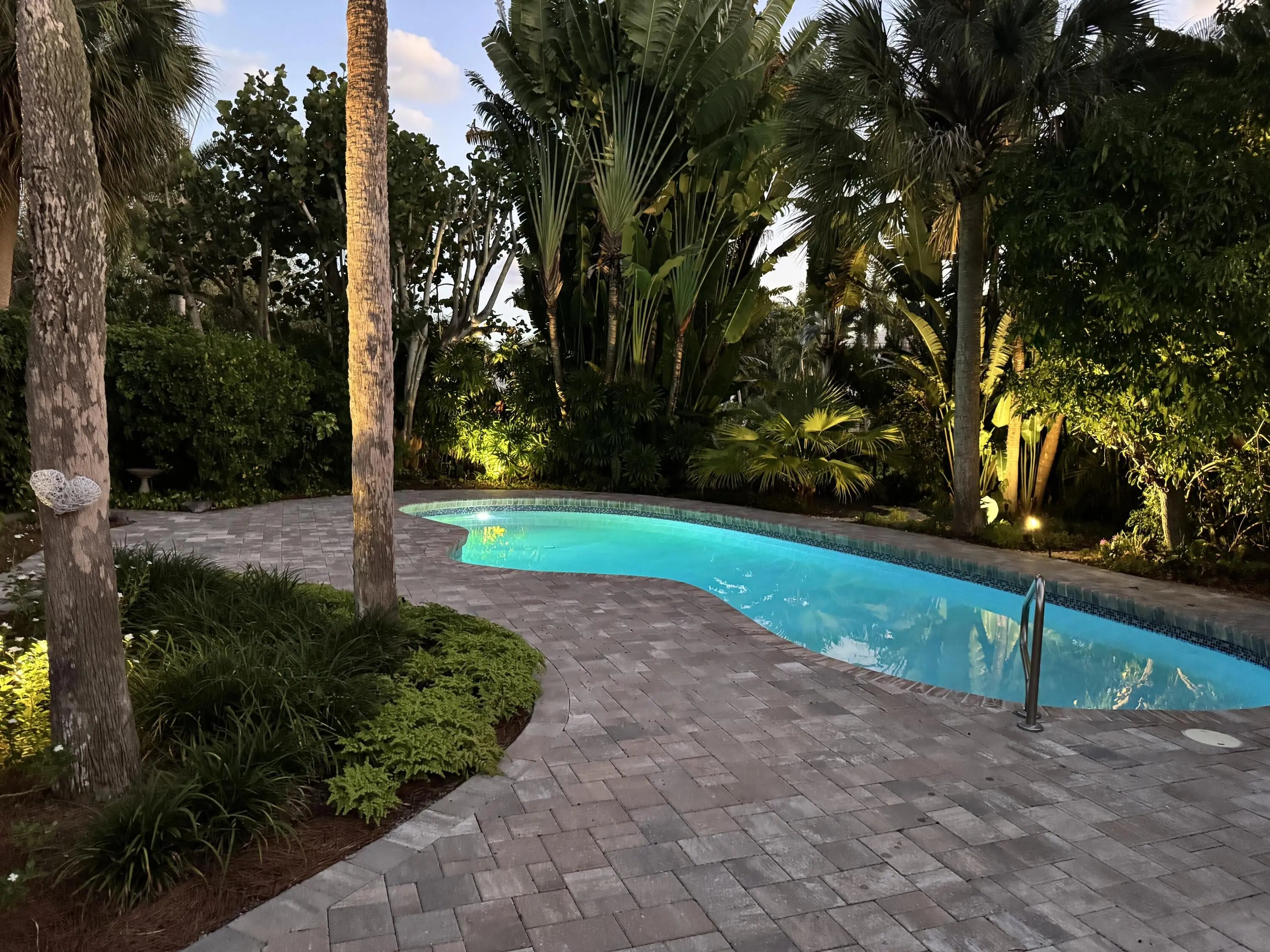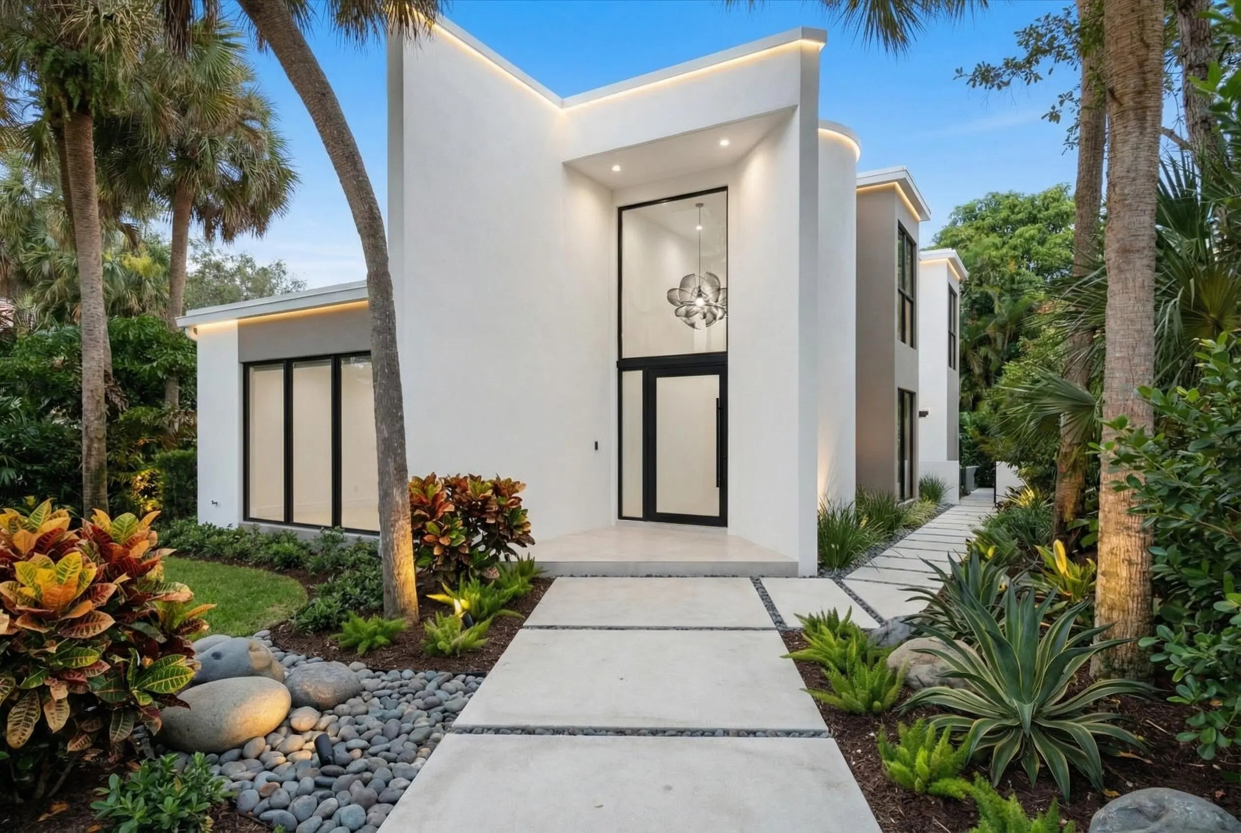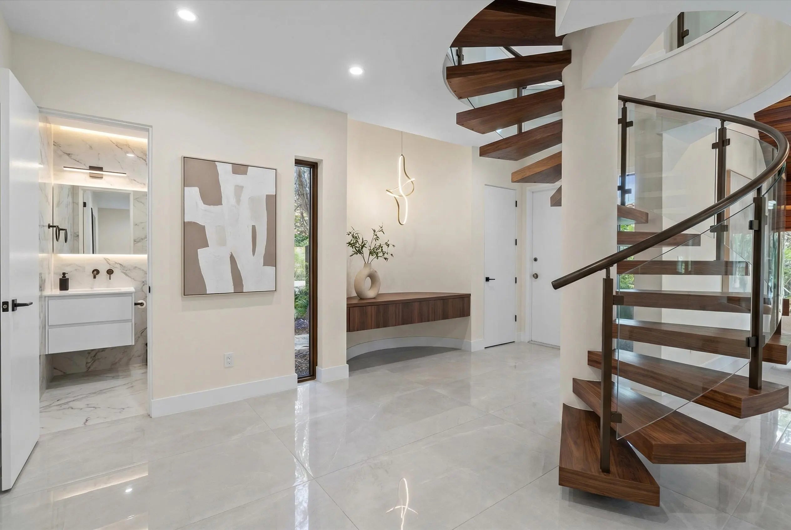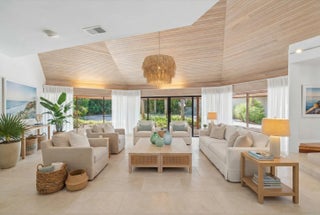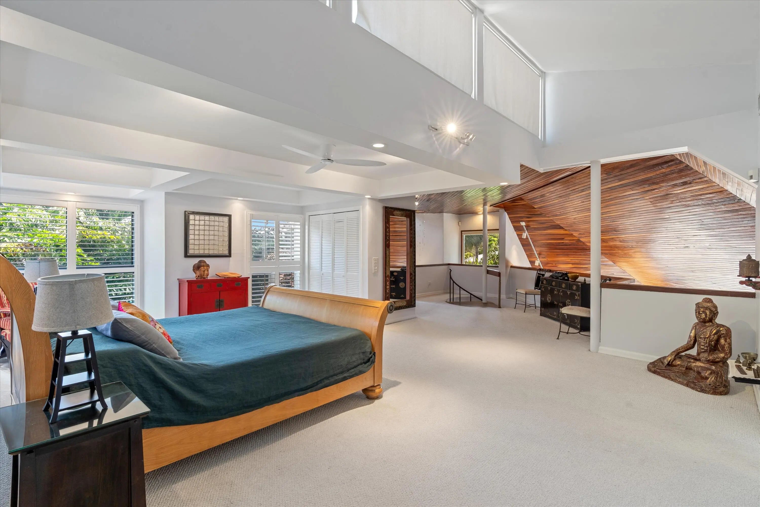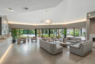 Custom designed by award-winning architect Bob Currie—and originally built as his personal residence—this remarkable home is an architectural treasure in one of Gulf Stream's most desirable, private communities, Place Au Soleil. Offering four bedrooms, three and a half baths, and more than 3500+ square feet of thoughtfully curated living space, the home blends refined artistry with modern comfort, all surrounded by lush, native landscaping that attracts butterflies, birds, and gentle breezes from the nearby Intracoastal. The grounds have been reimagined by Florida native-plant designers to create a water-conserving habitat brimming with essential pollinators and coastal wildlife, and include a dwarf Julie mango tree. A walk through the front garden brings guests along a path of tropical plantings toward a handcrafted wooden door, or directly to the tranquil Zen pool terrace framed by pavers and a pool accented with fresh mosaic tile. Inside, the great room immediately captivates with a dramatic soaring ceiling and staircaseboth crafted from rich Costa Rican Mahoganysetting the tone for an interior defined by organic beauty, natural light, and seamless indoor-outdoor flow. Walls of glass and reinforced sliders open to private courtyards and gardens on all sides, allowing every room to connect with the serene landscape. Designed for both intimate living and effortless entertaining, the home provides dedicated private spaces on each level. The family room offers relaxed dining and direct access to the kitchen, the pool terrace, and the barbeque courtyard. A well-appointed kitchen sits at the heart of the home, featuring granite countertops, a stone backsplash, GE Profile appliances, and soft-close cabinetry. Multiple flex rooms accommodate a variety of lifestyles. A theatre room wired for surround sound opens to the barbeque courtyard and a full bath. An office or additional bedroom overlooks the pool, while a separate personal room off the garage offers an ideal retreat for fitness, hobbies, or work. A guest bedroom features views across the Zen terrace, and another full bath expands to a potential private sun patio accessible only from the bathrooman unexpected and delightful oasis. The spacious laundry room showcases extensive storage and offers fresh style and modern convenience with access to a side garden area. The dramatic spiral staircase leads to the secluded primary suite, where motorized blinds, refined finishes, and quiet treetop views create a luxurious escape. Architect-created plans illustrate the option to expand the second floor with additional rooms and a deck, making the potential of this home even more extraordinary. Outside, uplighting casts a warm glow over the gardens at night, emphasizing the home's curves and distinctive architectural lines. Shutters with hidden tilt add elegance and practicality, while a full alarm system, timed irrigation, and impact-rated windows provide peace of mind. The property sits on a cul-de-sac within a one-entry, one-exit community protected by the town's dedicated police force. Two driveways, one circular for guests and one electronically gated for residents lead to an attached garage with storage. Positioned moments from pristine beaches, the Intracoastal, and vibrant downtown Delray Beachwith its fine dining, boutique shopping, weekly Green Market, and lively festivalsthis home offers an unrivaled lifestyle in an established, eclectic, and meticulously cared-for waterfront community that encourages tasteful individuality. More than a residence, this is a statement of artistry and uncommon character. For those who refuse to settle for the ordinary, your Place Au Soleil masterpiece in Gulf Stream awaits.