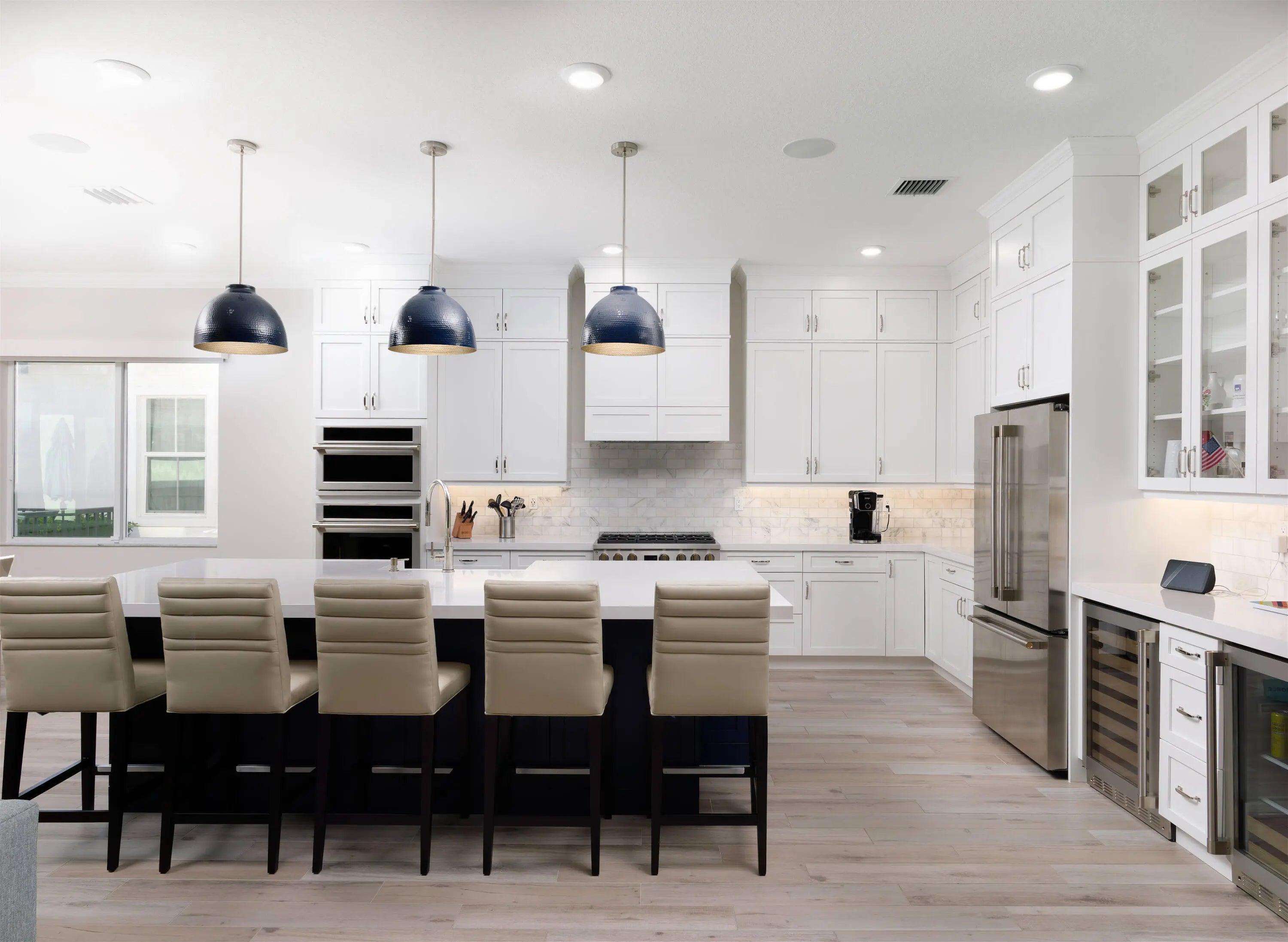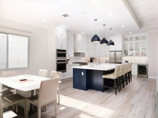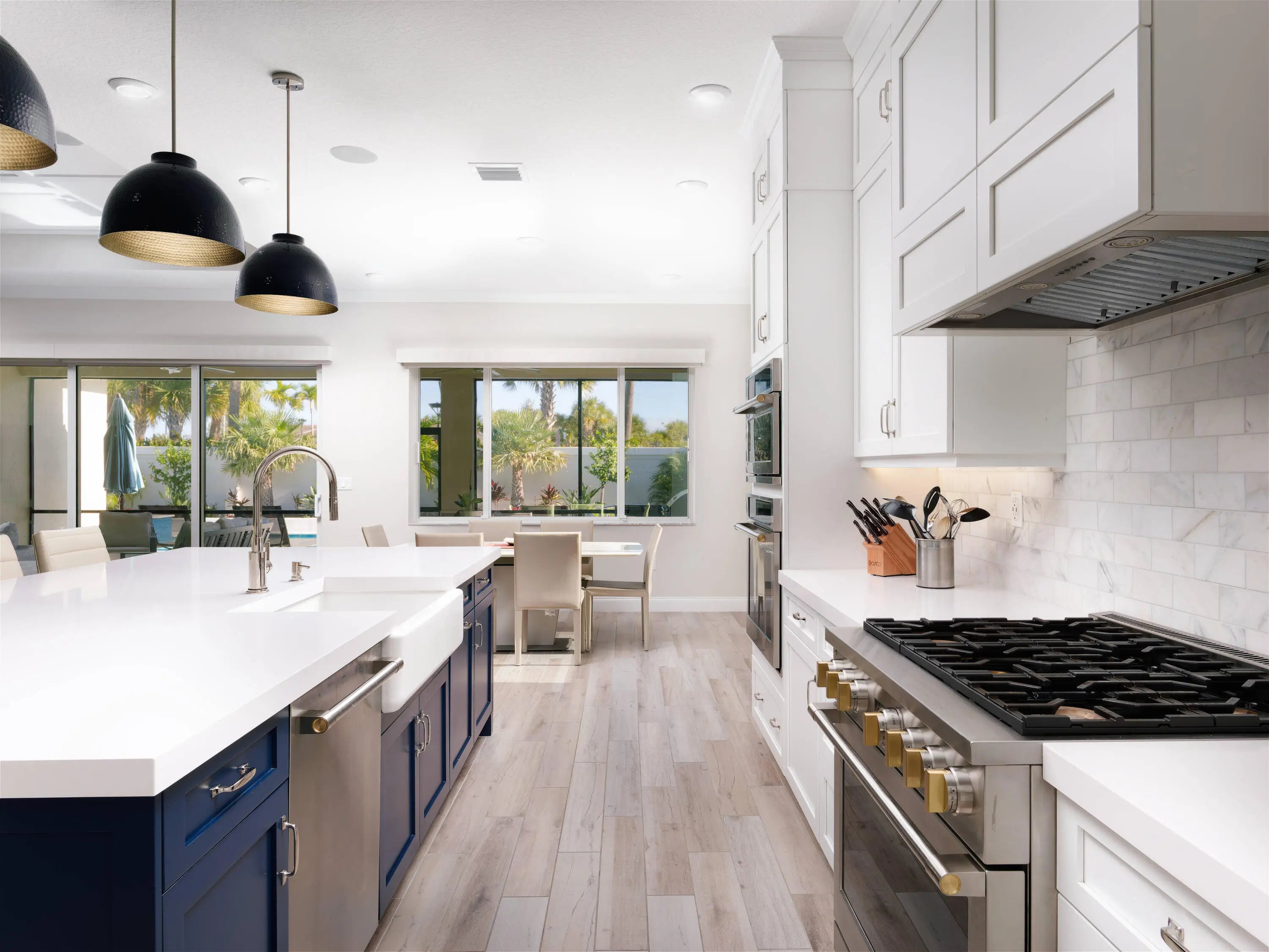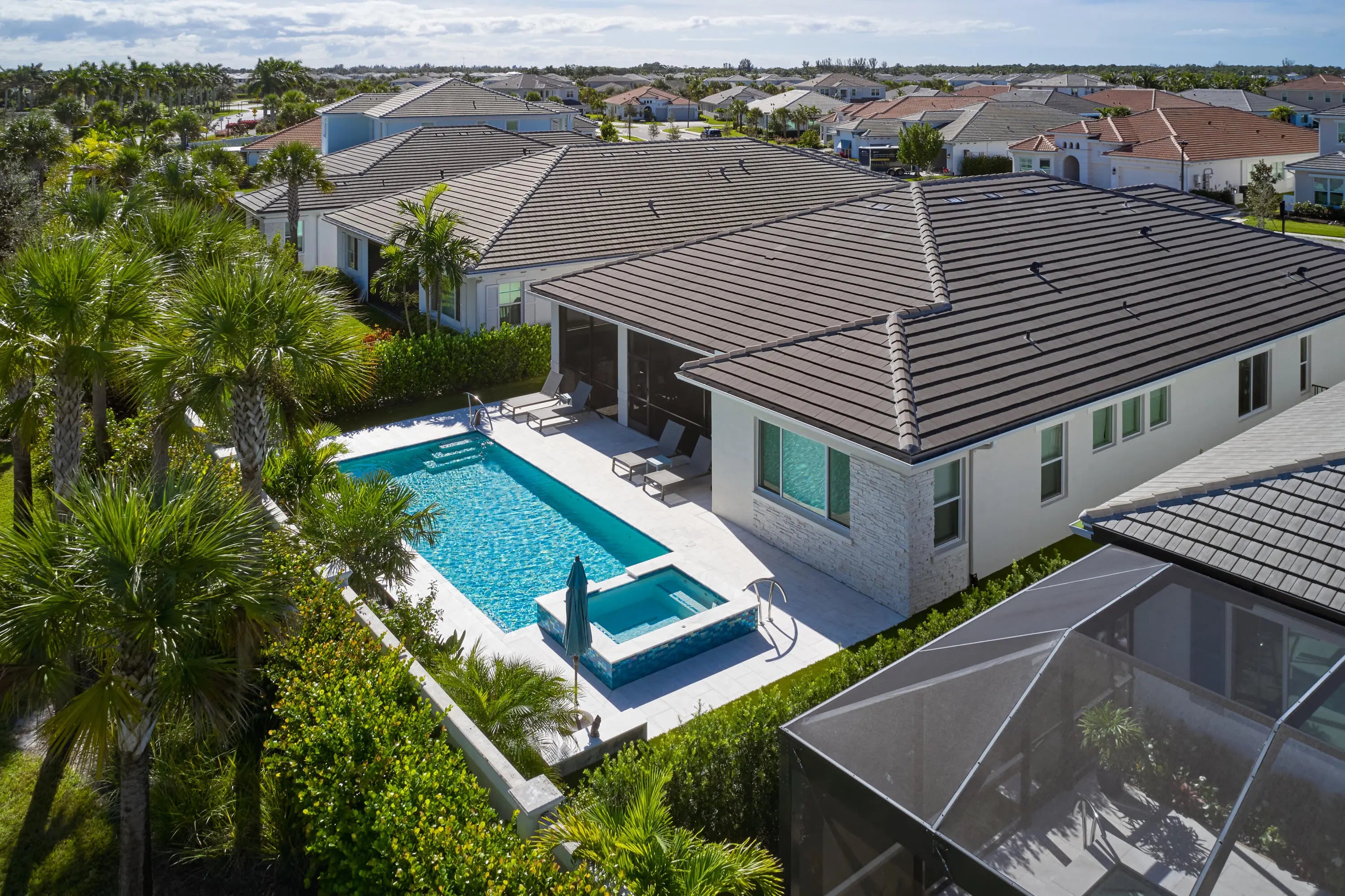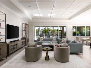 Welcome to this beautifully designed, modern single-story home in the sought-after La Terre subdivision of Avenir. Built in 2023 and offering 3,100 square feet of thoughtfully crafted living space, this residence blends contemporary style with everyday comfort, enhanced by premium upgrades including a whole-house generator, a SWAT Mosquito system, and full impact windows for year-round protection and peace of mind. White oak wood-look porcelain tile and a soft neutral palette set a warm, cohesive tone throughout the home. Through double French doors, the bright foyer greets you with high ceilings and a striking modern chandelier. Just beyond, the den features three oversized windows framing views of the front garden, creating a light-filled space currently enjoyed as both an adult lounge and a spacious play area. The heart of the home is the open-concept great room, kitchen, and dining area, perfect for entertaining and daily living. The great room features an impressive entertainment wall and double sliding doors that lead to the screened and covered patio. The adjoining chef's kitchen showcases white shaker cabinetry, quartz countertops, high-end stainless steel appliances, and a six-burner gas range. A dramatic deep blue island offers additional storage, an apron sink, dishwasher, and seating, while a nearby beverage center houses a wine chiller and mini-fridge. The dining room enjoys serene views of the patio and side garden through two large windows. The spacious primary suite is a private retreat with room for a cozy seating area, two expansive walk-in closets, and a luxurious en-suite bath complete with marble-look flooring, separate vanities, and a glass-enclosed shower with floor-to-ceiling beveled tile and a built-in bench. Two bright guest bedrooms offer generous comfort, and a dedicated office provides a well-lit and functional workspace. The laundry room is equally impressive with high-efficiency appliances, upper cabinetry, a storage-equipped sink, and an additional office nook. Outdoor living shines in the expansive covered patio, designed with two distinct entertaining areas: a seating zone with a wall-mounted TV and a dining area complemented by a full summer kitchen. Just beyond, the terrace leads to the sparkling pool and spa, all surrounded by lush tropical landscaping and a fenced backyard for added privacy. The integrated SWAT Mosquito system ensures outdoor enjoyment throughout the year, making the space both inviting and comfortable. With whole-house impact windows and a full home generator, this move-in-ready property offers exceptional security, resilience, and convenience, delivering a fresh contemporary lifestyle in one of Avenir's premier and fastest-growing communities.
