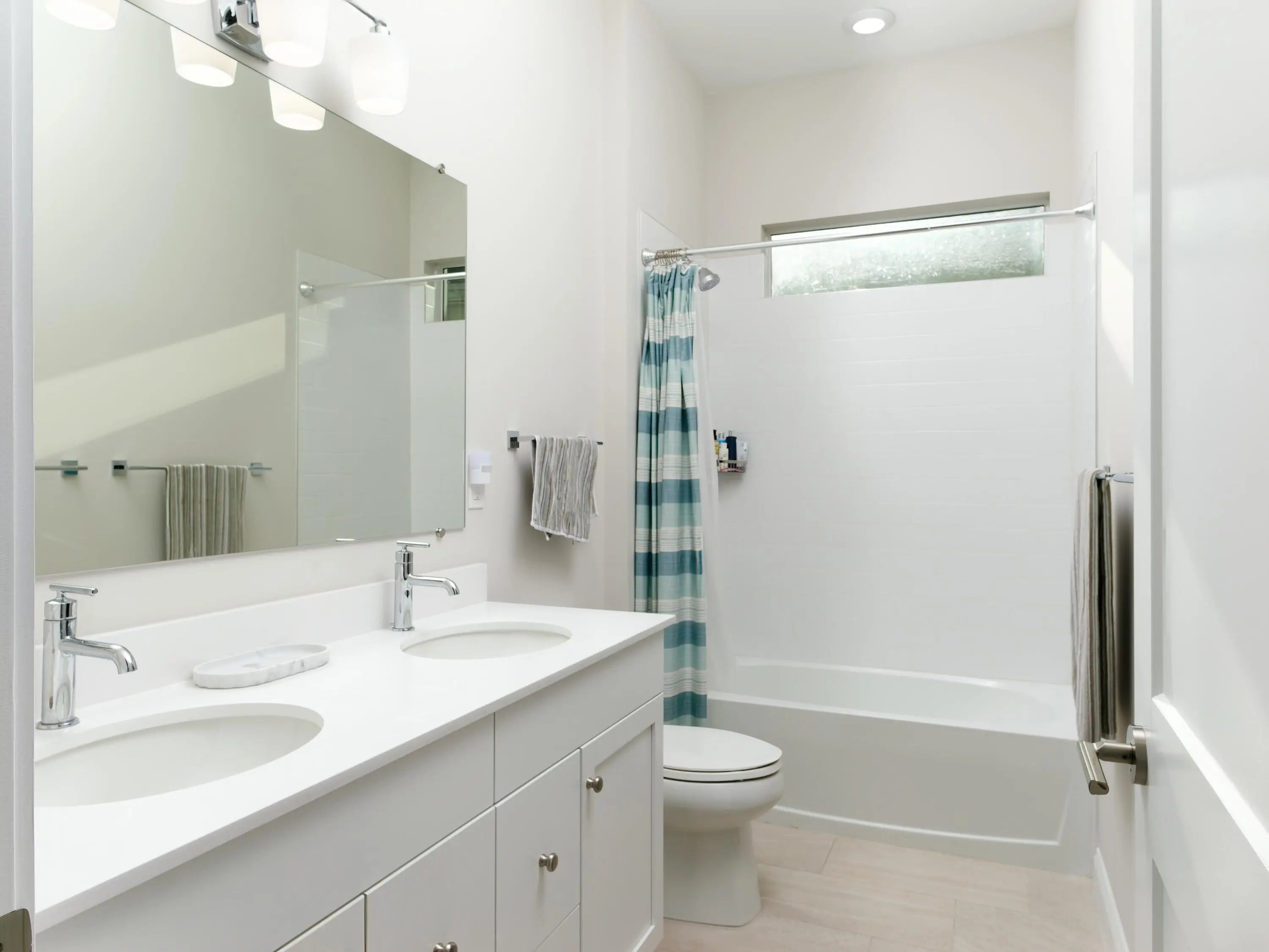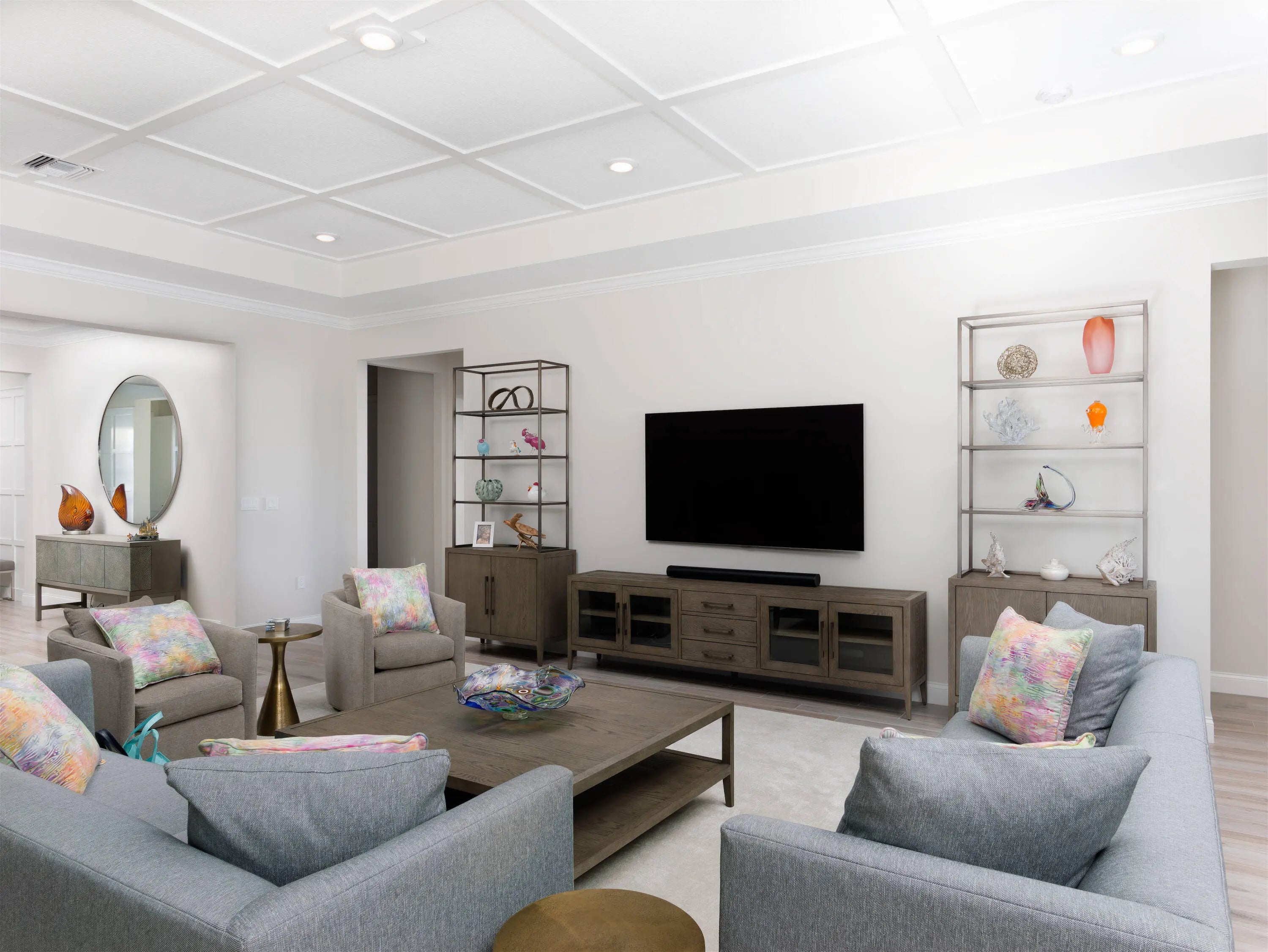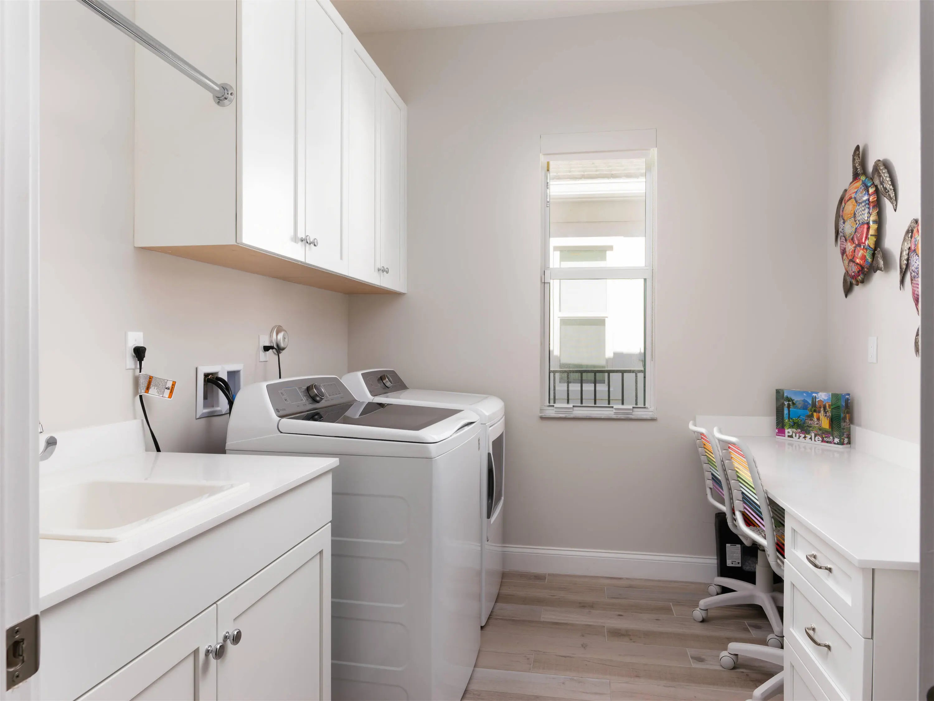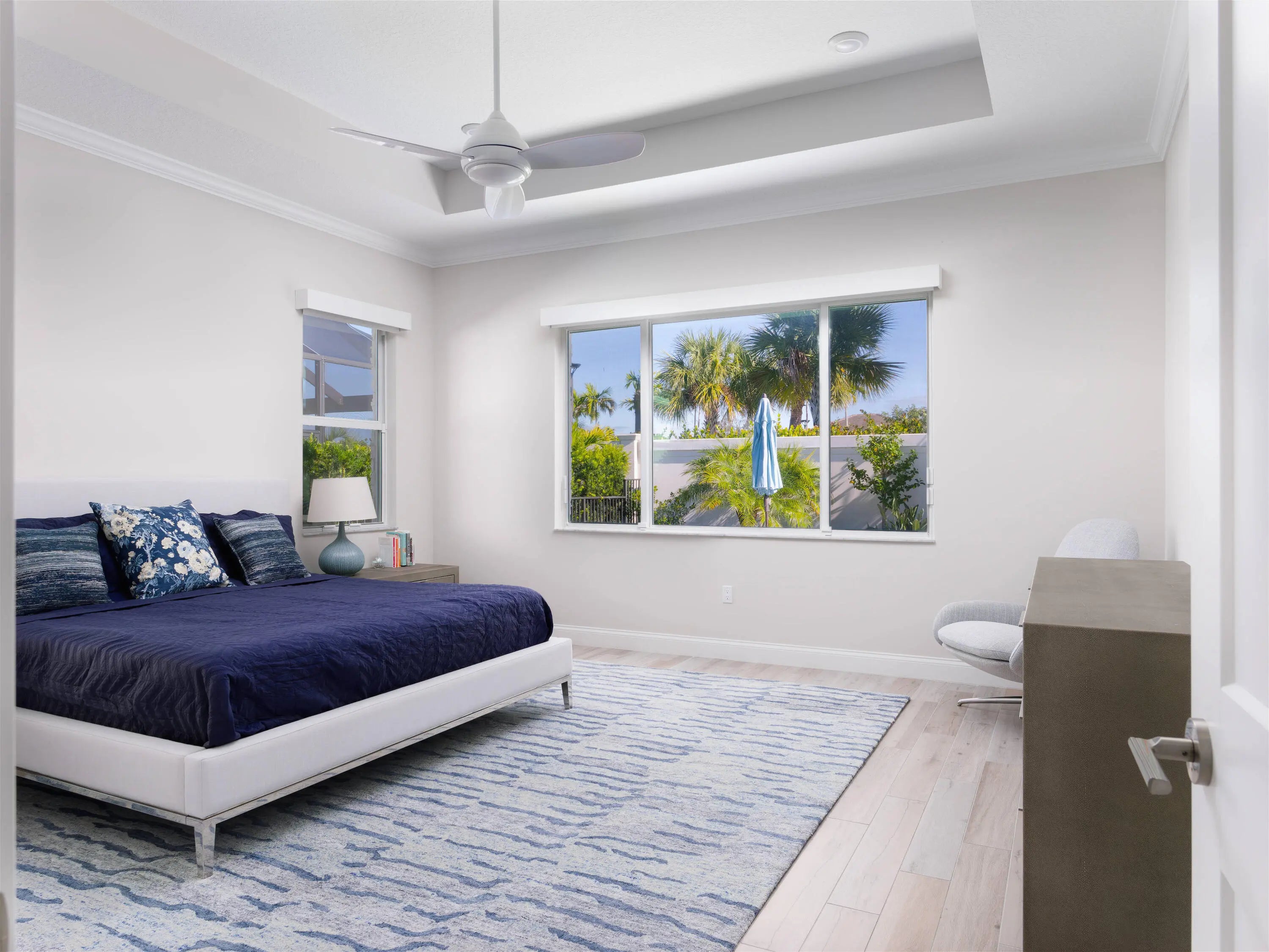 Welcome to this beautifully designed, modern single-story home in the sought-after La Terre subdivision of Avenir. Built in 2023 and offering 3,100 square feet of thoughtfully crafted living space, this residence blends contemporary style with everyday comfort, enhanced by premium upgrades including a whole-house generator, a SWAT Mosquito system, and full impact windows for year-round protection and peace of mind. White oak wood-look porcelain tile and a soft neutral palette set a warm, cohesive tone throughout the home. Through double French doors, the bright foyer greets you with high ceilings and a striking modern chandelier. Just beyond, the den features three oversized windows framing views of the front garden, creating a light-filled space currently enjoyed as both an adult lounge and a spacious play area. The heart of the home is the open-concept great room, kitchen, and dining area, perfect for entertaining and daily living. The great room features an impressive entertainment wall and double sliding doors that lead to the screened and covered patio. The adjoining chef's kitchen showcases white shaker cabinetry, quartz countertops, high-end stainless steel appliances, and a six-burner gas range. A dramatic deep blue island offers additional storage, an apron sink, dishwasher, and seating, while a nearby beverage center houses a wine chiller and mini-fridge. The dining room enjoys serene views of the patio and side garden through two large windows. The spacious primary suite is a private retreat with room for a cozy seating area, two expansive walk-in closets, and a luxurious en-suite bath complete with marble-look flooring, separate vanities, and a glass-enclosed shower with floor-to-ceiling beveled tile and a built-in bench. Two bright guest bedrooms offer generous comfort, and a dedicated office provides a well-lit and functional workspace. The laundry room is equally impressive with high-efficiency appliances, upper cabinetry, a storage-equipped sink, and an additional office nook. Outdoor living shines in the expansive covered patio, designed with two distinct entertaining areas: a seating zone with a wall-mounted TV and a dining area complemented by a full summer kitchen. Just beyond, the terrace leads to the sparkling pool and spa, all surrounded by lush tropical landscaping and a fenced backyard for added privacy. The integrated SWAT Mosquito system ensures outdoor enjoyment throughout the year, making the space both inviting and comfortable. With whole-house impact windows and a full home generator, this move-in-ready property offers exceptional security, resilience, and convenience, delivering a fresh contemporary lifestyle in one of Avenir's premier and fastest-growing communities.