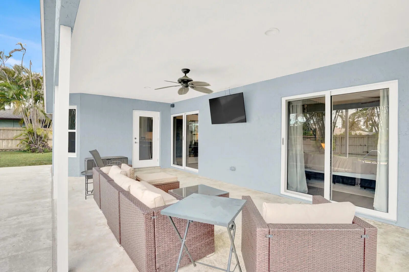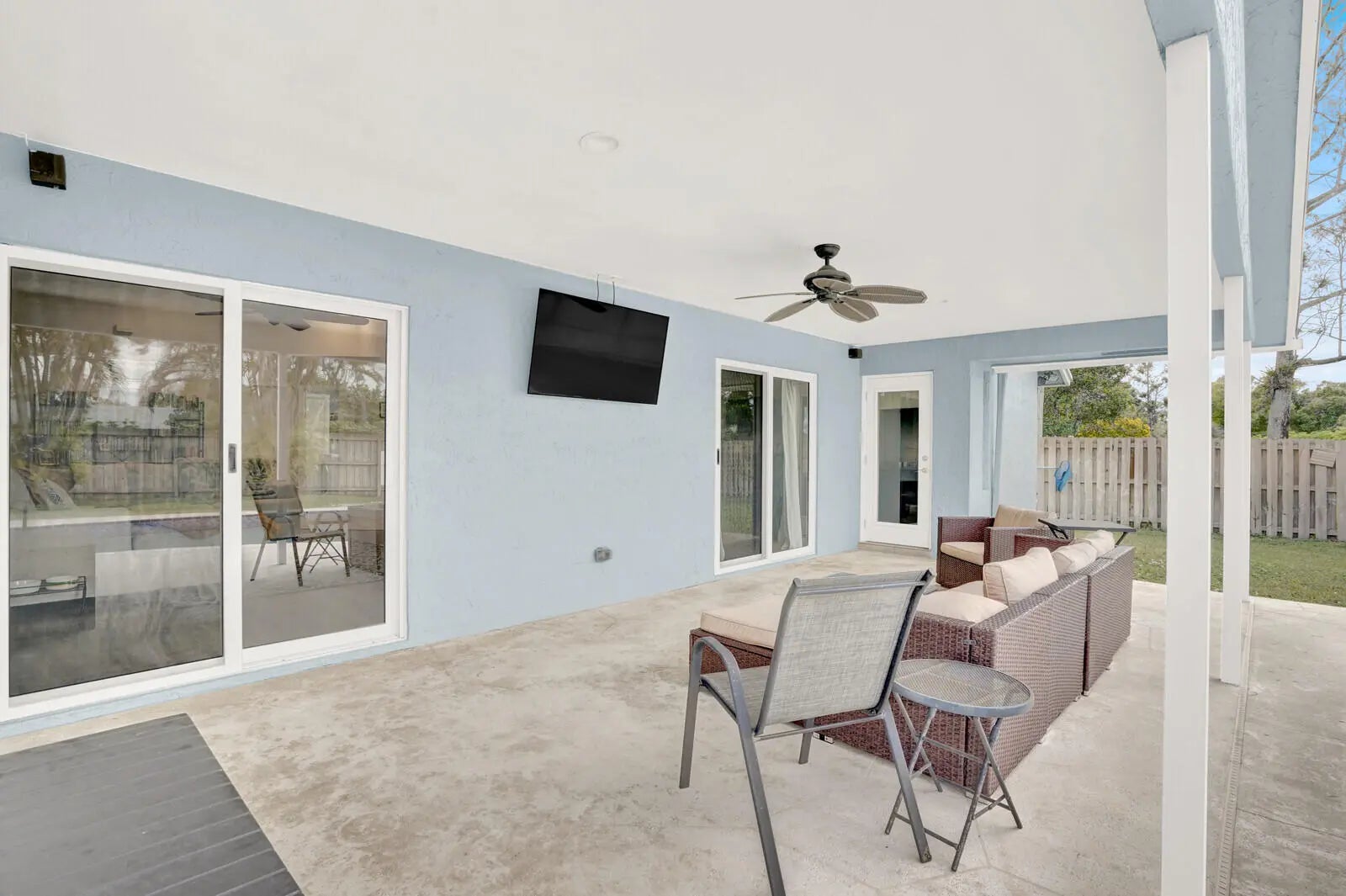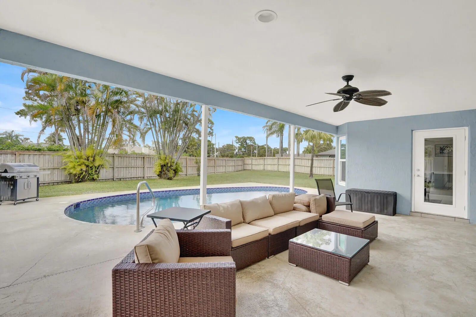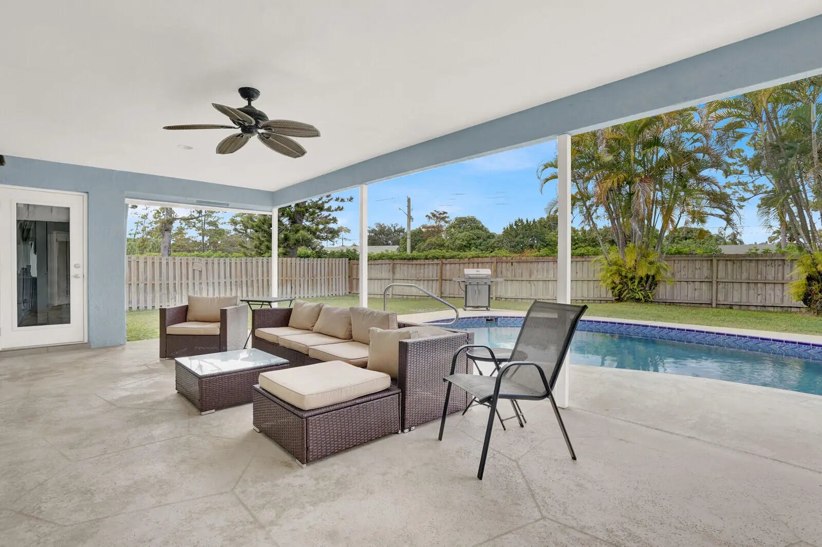 With NO HOA, this property provides freedom and flexibility rarely found in such a well-improved home. Every detail inside and out has been refined to create a tranquil move-in-ready retreat that lives as beautifully as it looks. The exterior features a 2022 roof, 2023 impact windows and doors, and a fresh exterior paint update in 2024. The expansive, fully fenced yard is a private oasis, centered around a newly resurfaced inground pool with a new pool pump and filter. The spacious covered patio invites effortless outdoor living and entertaining. A new sprinkler system installed in 2025 keeps the grounds lush and easy to maintain. Inside, the home opens to beautifully refreshed living spaces enhanced by curated lighting with all-new fans, and an inviting ambiance anchored by a charming fireplace and a sun-filled skylight. The newly remodeled kitchen features modern finishes, a newer refrigerator, dishwasher and stove, and a breakfast area that frames serene views of the pool. The primary bathroom has been tastefully updated, and a cabana bath adds convenience for both residents and guests. Practical upgrades such as a newer A/C and air handler, newer water heater, and newer washer and dryer ensure comfort at every turn. With no homeowner's association, the property provides freedom and flexibility rarely found in such a well-improved home. Every detail inside and out has been refined to create a tranquil, move-in-ready retreat that lives as beautifully as it looks. Not far from Wellington's renowned equestrian venues, top-rated schools, and the area's great shops and restaurants, this home offers the best of Florida living.