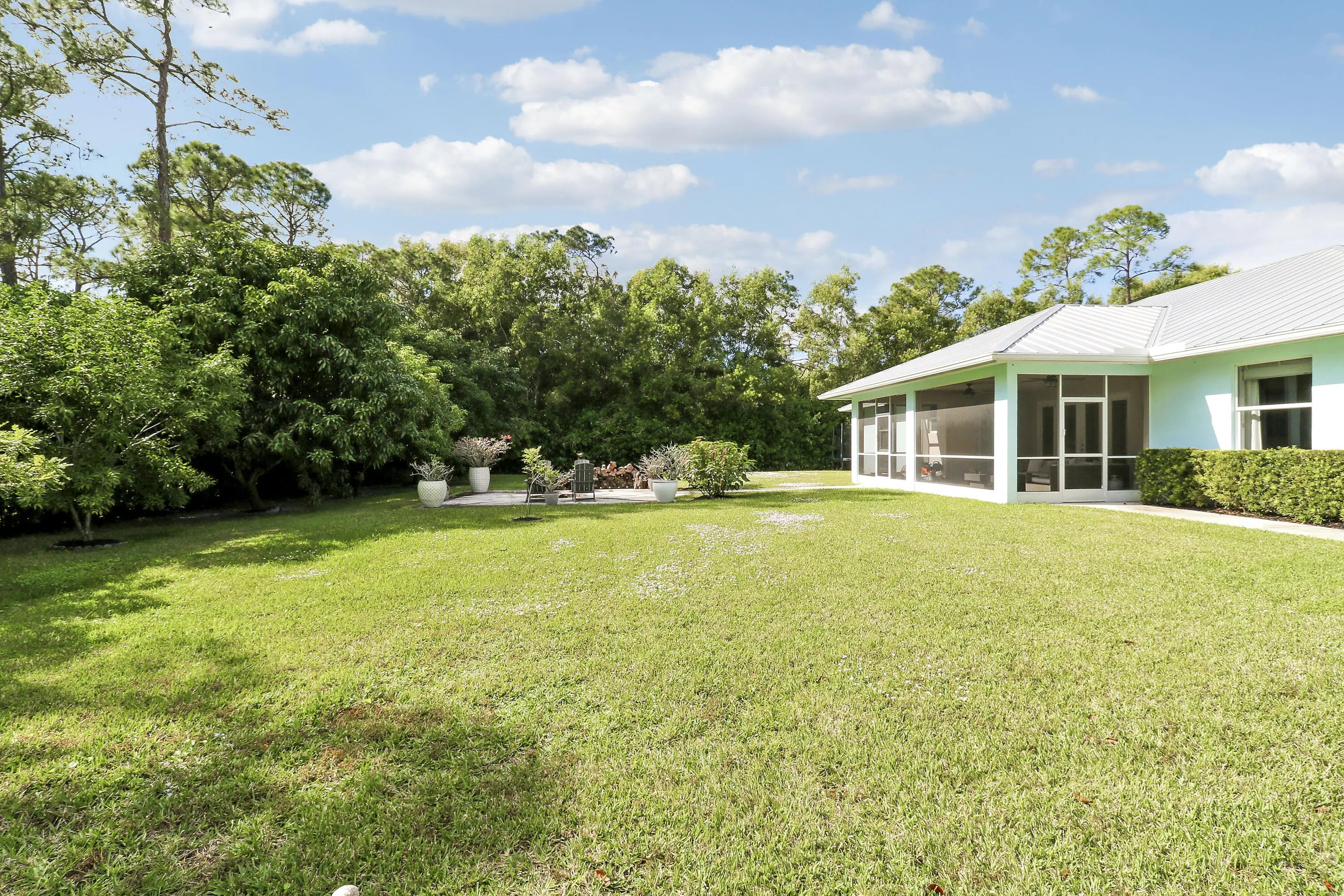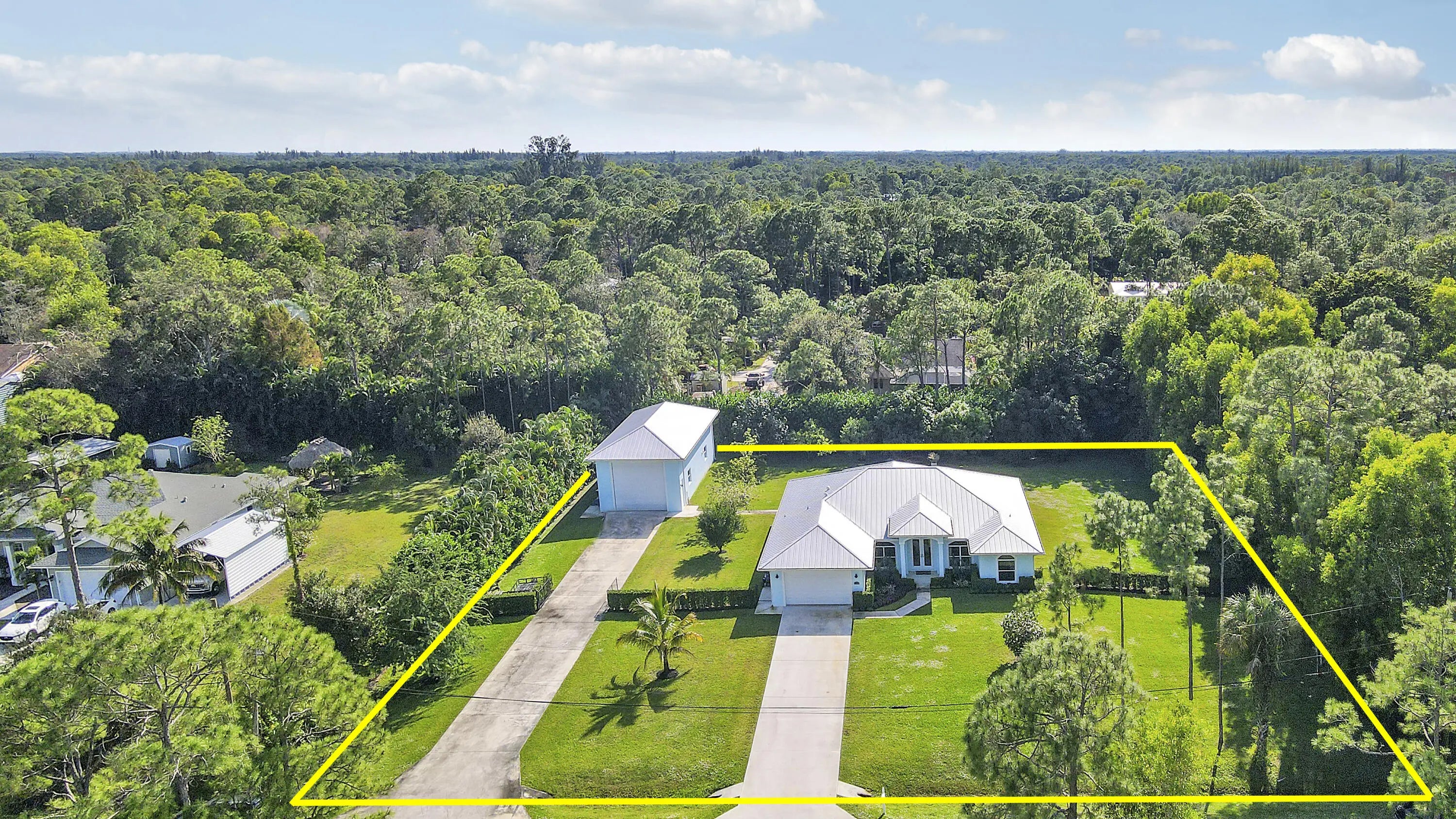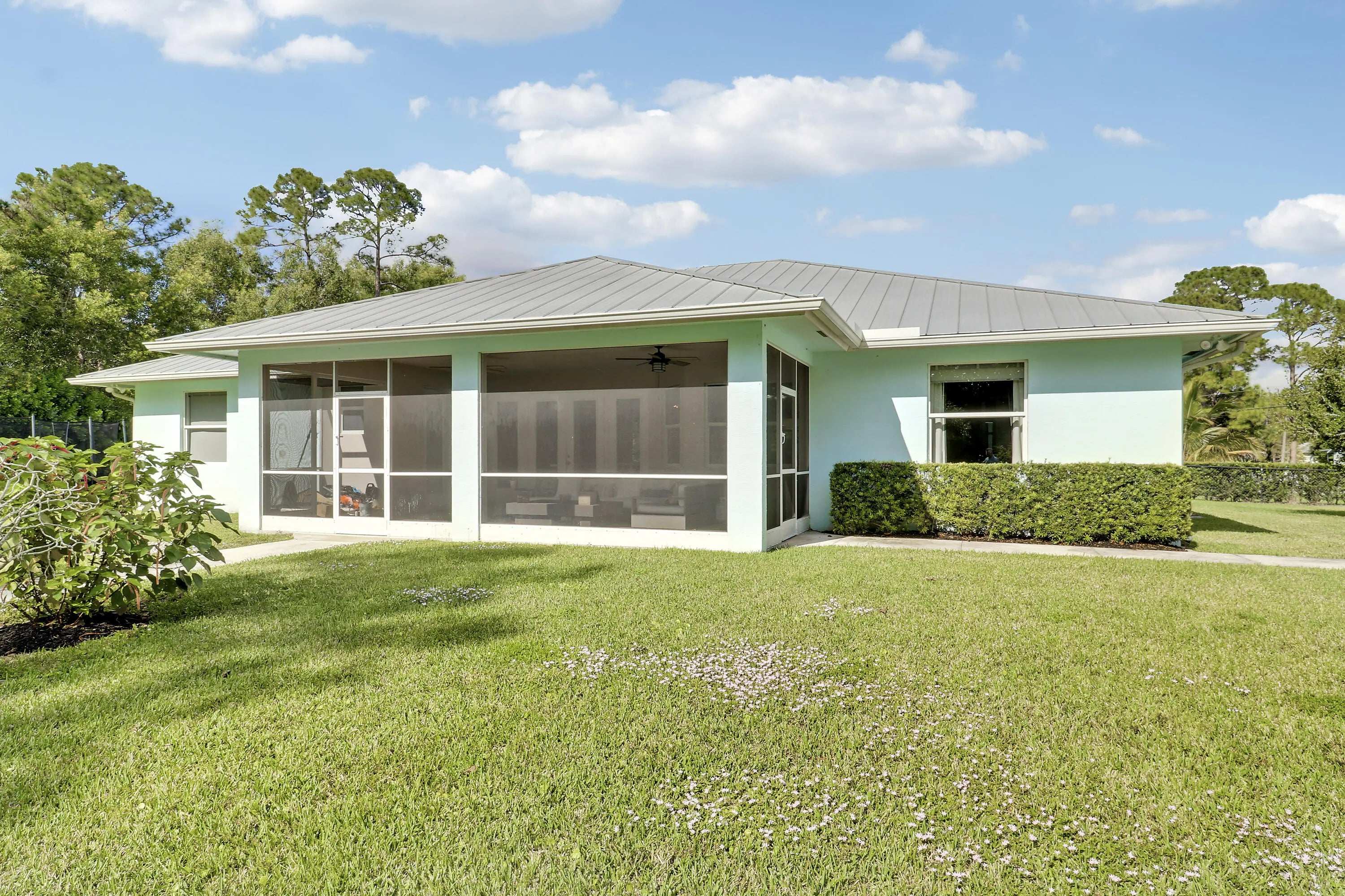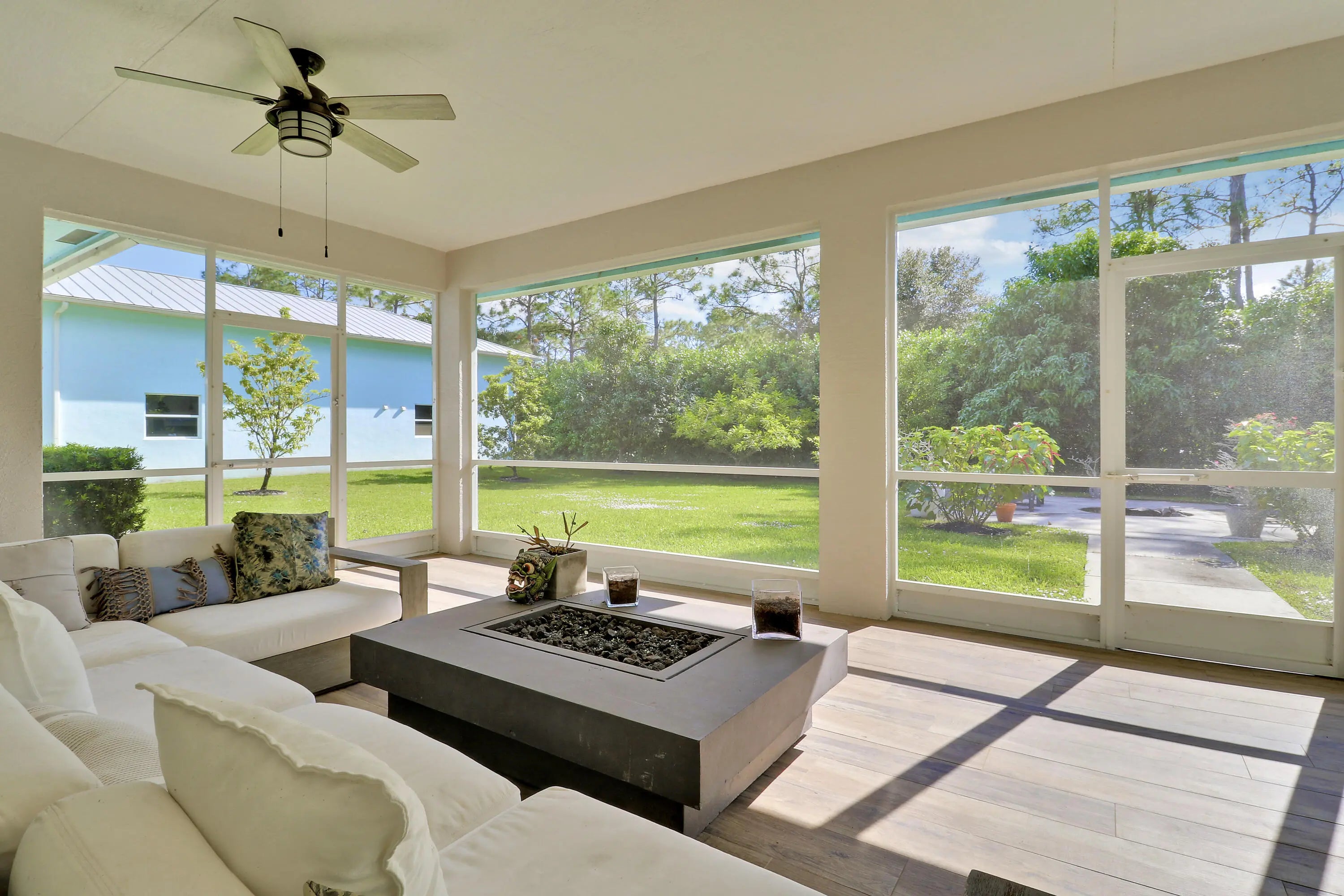 Must See! RARE BONUS SPACE: 55' x 25' (additional 1,375 Sq Ft) air-conditioned solid concrete outbuilding with oversized A/C, filtered exhaust system, kitchenette and bath—an exceptional setup for a studio, workshop, hobbyist, or next-level storage. This 2018-built 4BR/3BA home offers a desirable split floor plan, expansive primary suite, open family room, and a versatile den/office. The kitchen features beautiful wood cabinetry and a center island designed for gathering. Impact glass throughout, a metal roof, and a 2-car garage add comfort and confidence. Enjoy Florida living from the screened, covered patio with views of mango trees. Caloosa borders the property.