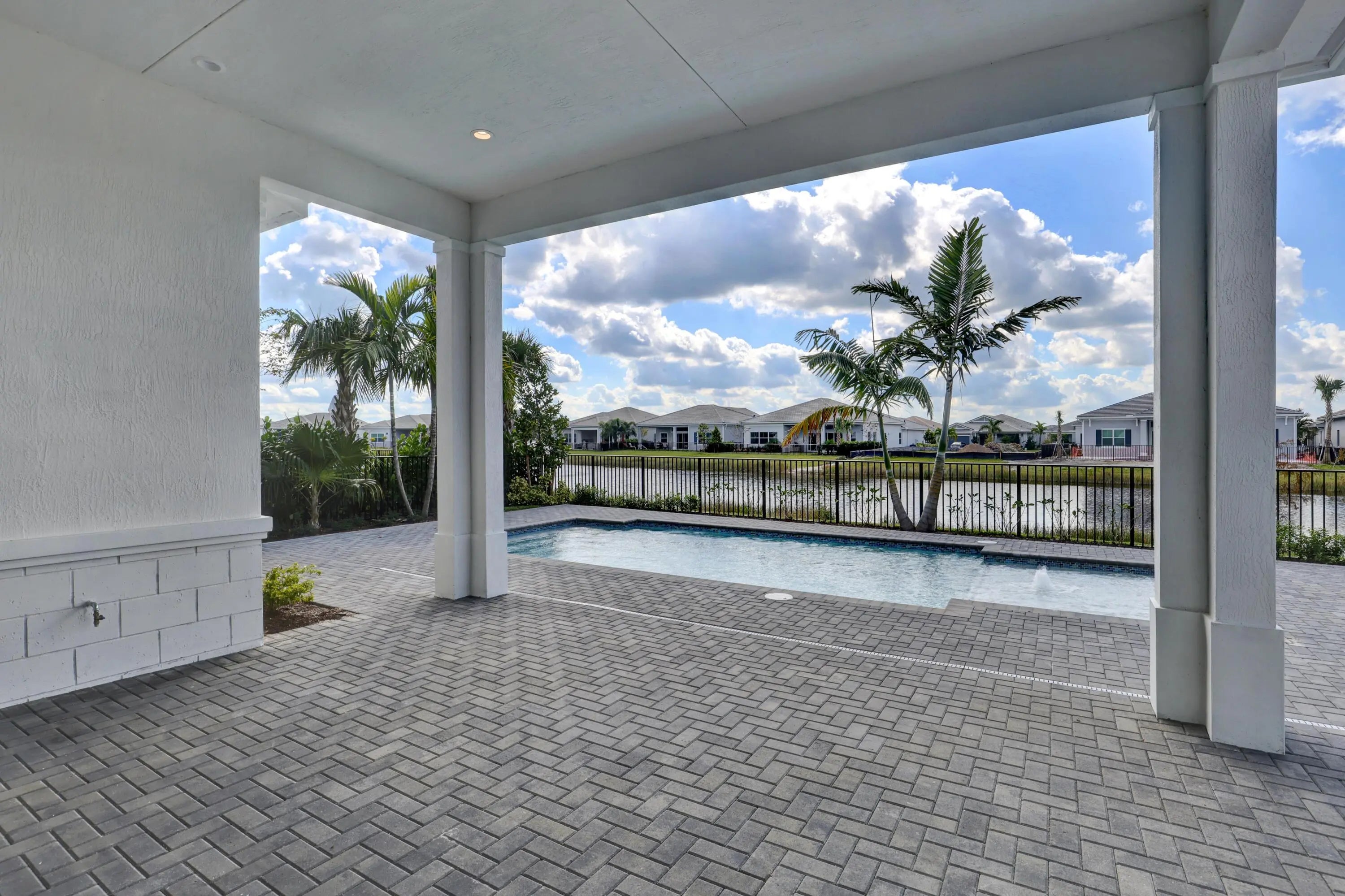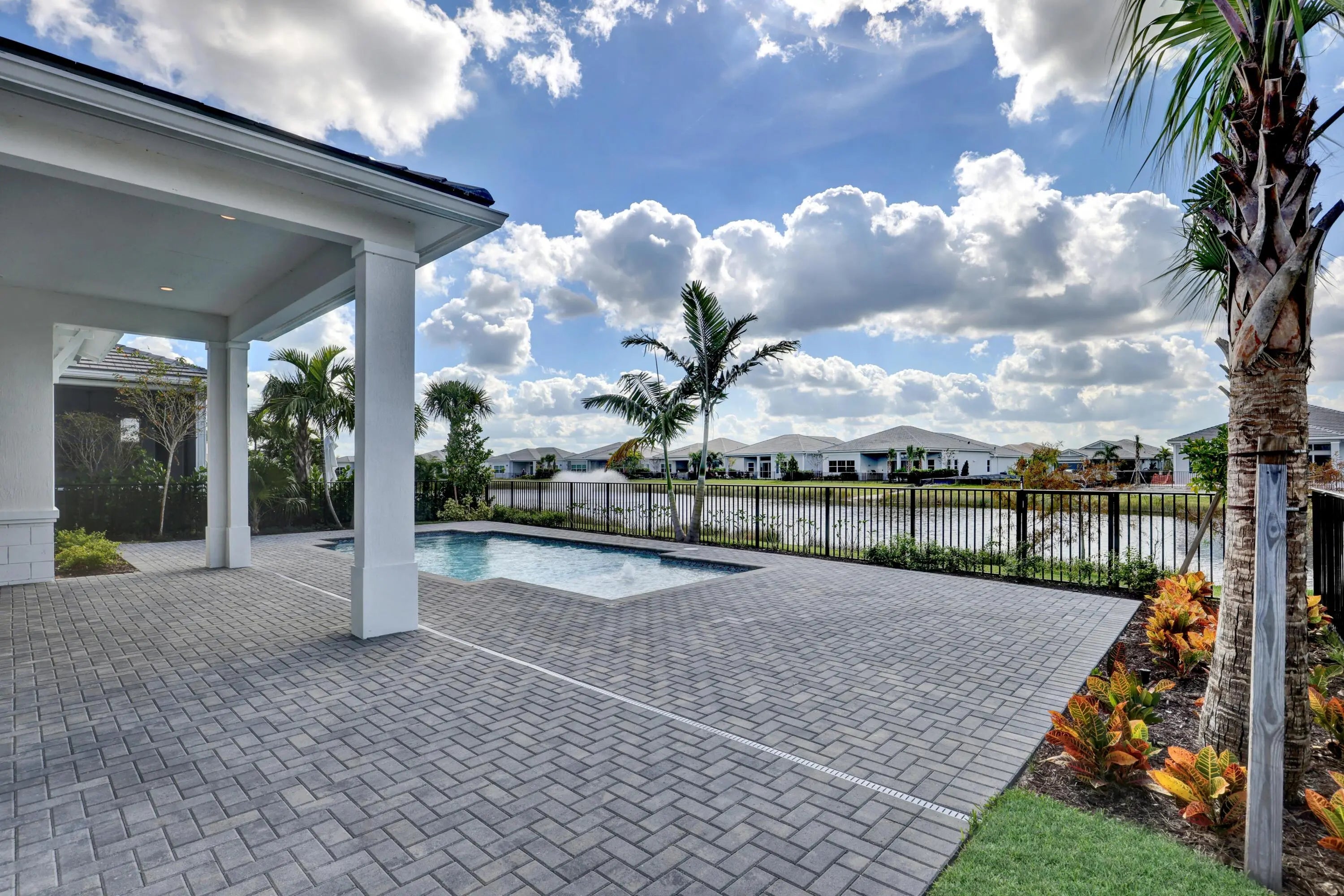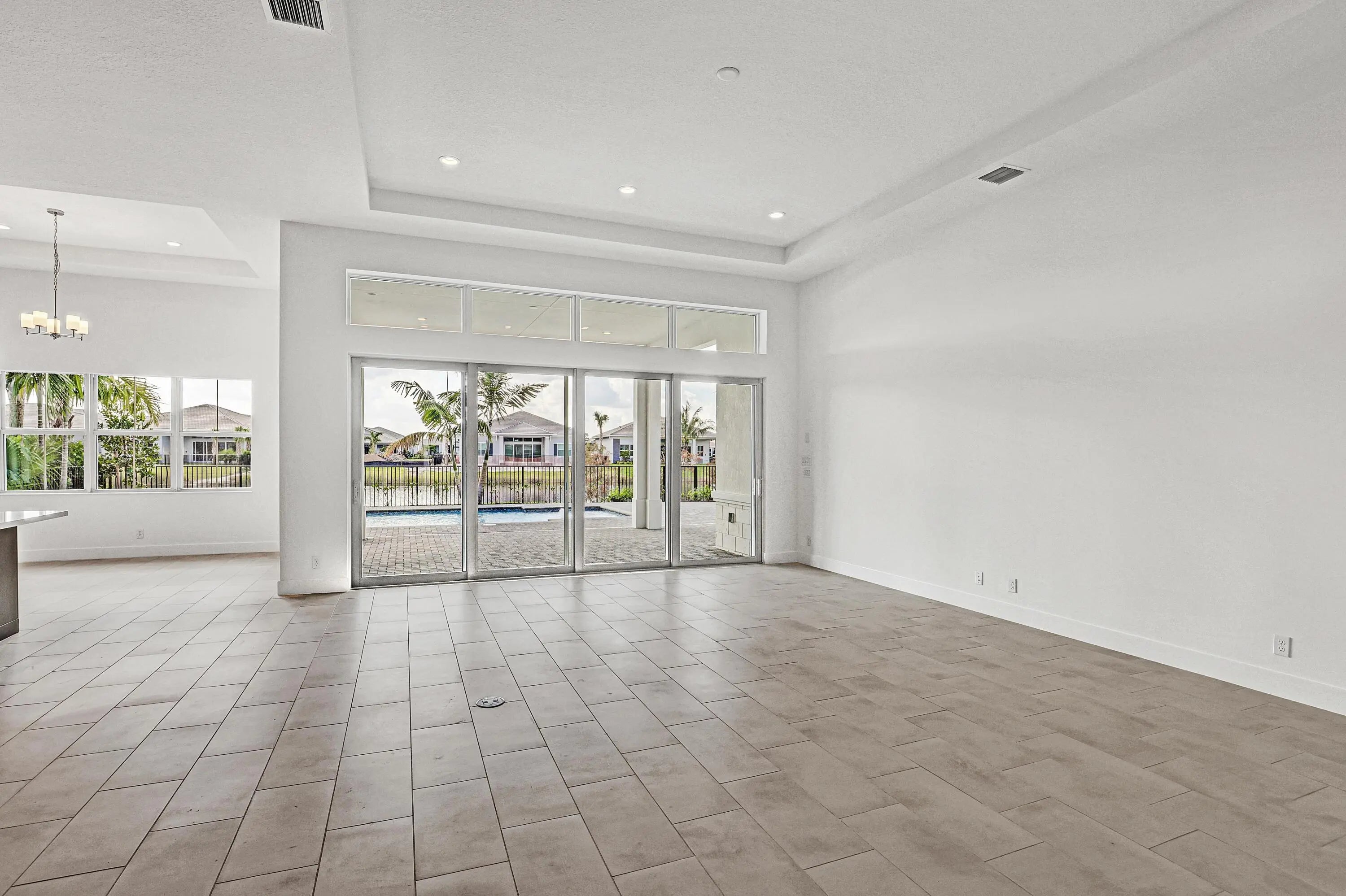 Welcome Home! Pool with Lake View! Step into this stunning residence featuring a grand foyer with soaring 12-foot ceilings and a bright, open-concept design. Gorgeous LVP flooring flows seamlessly throughout, leading you into the expansive living area. Just off the entry, a sunlit study with glass French doors offers space for a home office or library. The chef-inspired kitchen impresses with stylish two-toned cabinetry, a walk-in pantry. The luxurious primary suite showcases white shaker cabinetry, a spa-like bath with a drop-in soaking tub, a walk-in shower with bench, and a spacious closet. A conveniently located powder bath adds comfort for guests, while secondary bedrooms provide ample space for family or visitors.