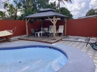 Lovely 4 bedroom 2 bath pool home with a lovely back yard space. Tile floors throughout. Stainless steel appliances. The roof is three years old and the air conditioner is 3 years old. The garage has been converted into living space. A circular driveway for 3 cars. A separate storage area in the back yard area. There is an outdoor shower adjacent to the pool.