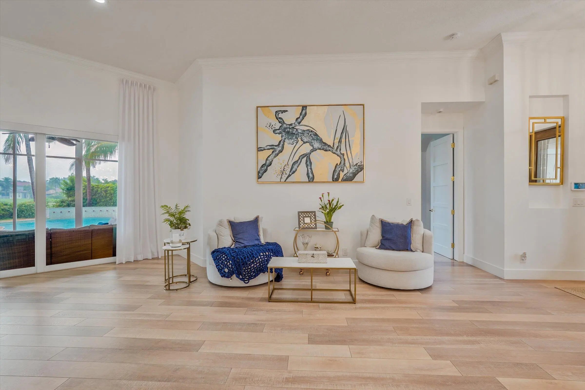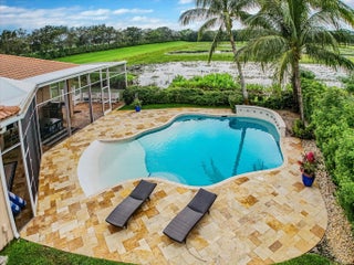 Luxury 5-bed 3-bath oasis pool home can be rented for season or year round fully furnished/turnkey. Gorgeous white kitchen with double ovens, decorative hood with gold fixtures, pot filler, coffee bar, wine fridge, designer countertops and more. Private saltwater beach entrance pool on a tranquil private preserve with screened in outdoor living and dining. Spacious bedrooms, one converted to office with built-in desks. Spa-like master bath with huge shower and tub. AC in garage. Navy grasscloth wallpaper in family room, tastefully decorated with state-of-the-art community amenities, this home is situated within proximity to equestrian venues and beaches. Includes Wi-Fi, Cable and ADT security.