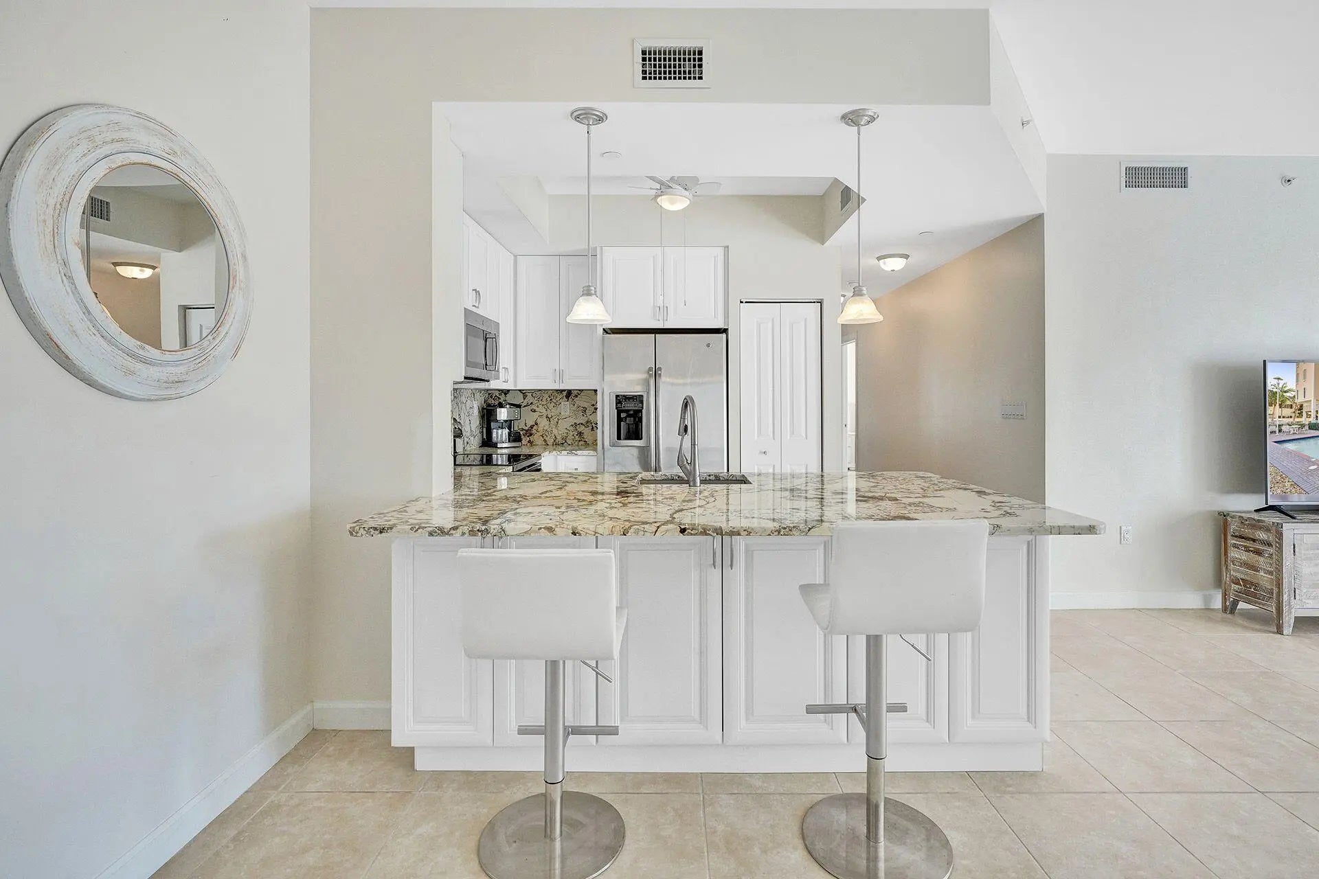 Welcome home to your breezy beachside retreat! Walk to the best that Deerfield Beach has to offer and just 300 yards from the SAND this boutique condo building of just 18 units has it all! This unit is located in the preferred southeast facing corner stack with lots of privacy, treetop views and constant ocean breezes. This stack of units are the only units in the building that feature 2 separate and private exterior balconies. Located just steps from live entertainment including the world famous Whales Rib, Flanigans, JB's, Kilwin's, Oceans 234, Lucky Lou's and the fishing pier with many other dining options from fine to casual. Inside you'll find soaring 10ft ceilings with walls of windows with natural light pouring in. Full impact rated windows and doors. The kitchen has undergone a complete remodel with an extended eat up bar top with Italian granite, double sided bottom cabinets and oversized kitchen cabinets with plenty of additional storage space. The oversized master bedroom has its own private balcony, walk in closet, his and her sinks, separate jetted bathtub, and walk in shower. The building is Pet and Investor friendly and rare for this area. You're able to rent right away for a minimum of 30 days, 12 times per year! Full service property management can be in place if desired upon new ownership. The building has completed ALL exterior upgrades including concrete, waterproofing/painting, balconies and roof. NO assessments! Community amenities include a spa hot tub, pool, bike storage, security cameras, and a gated and walled perimeter. 2 parking spaces are assigned to the unit (1 covered). 2024 Full size washer and dryer, 2020 A/C with nest bluetooth thermostat. This Key West boutique style building gives the property a very private and serene feeling while also being walking distance to it ALL! Check out the Virtual 3-D Tour! Easy to see and show!
