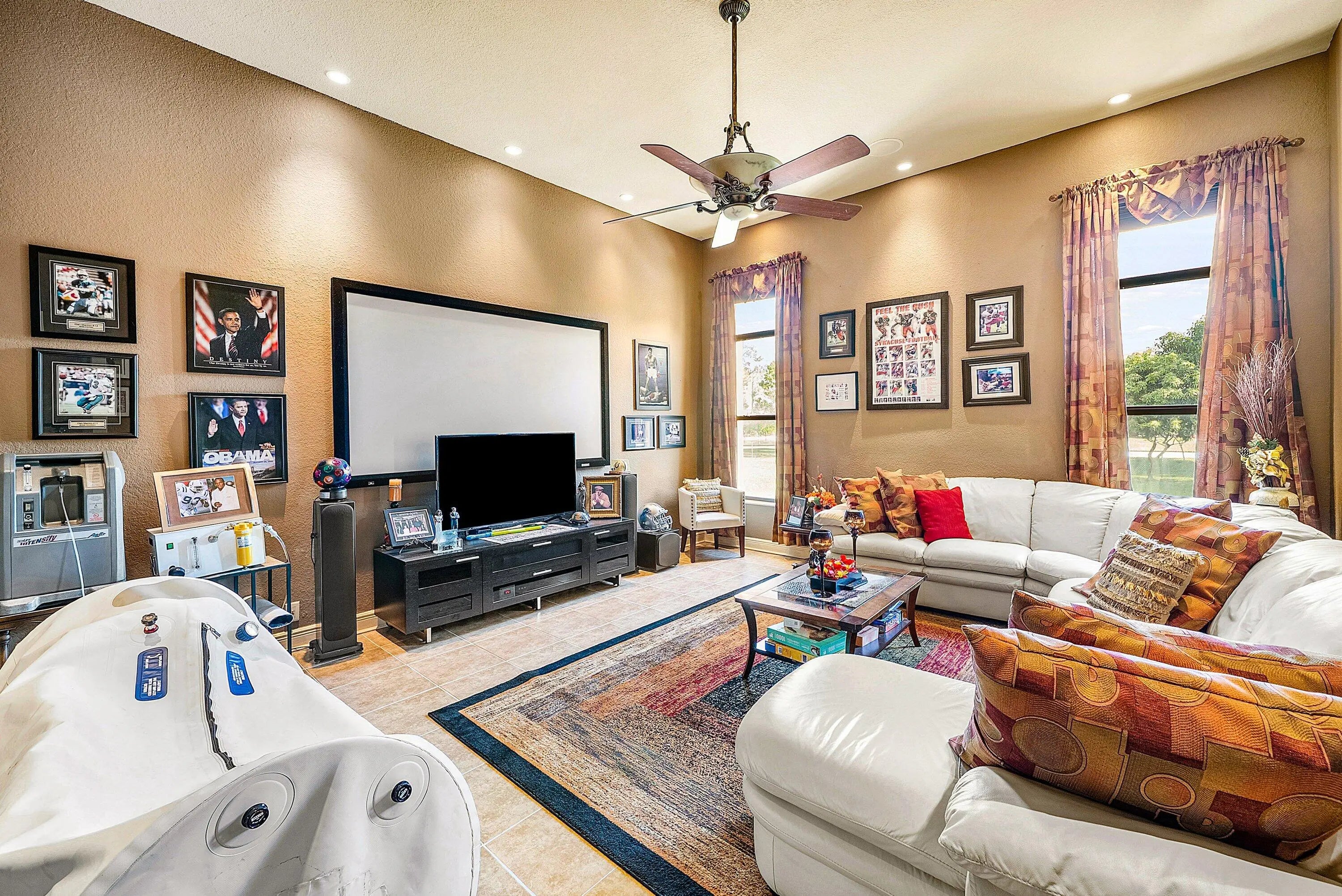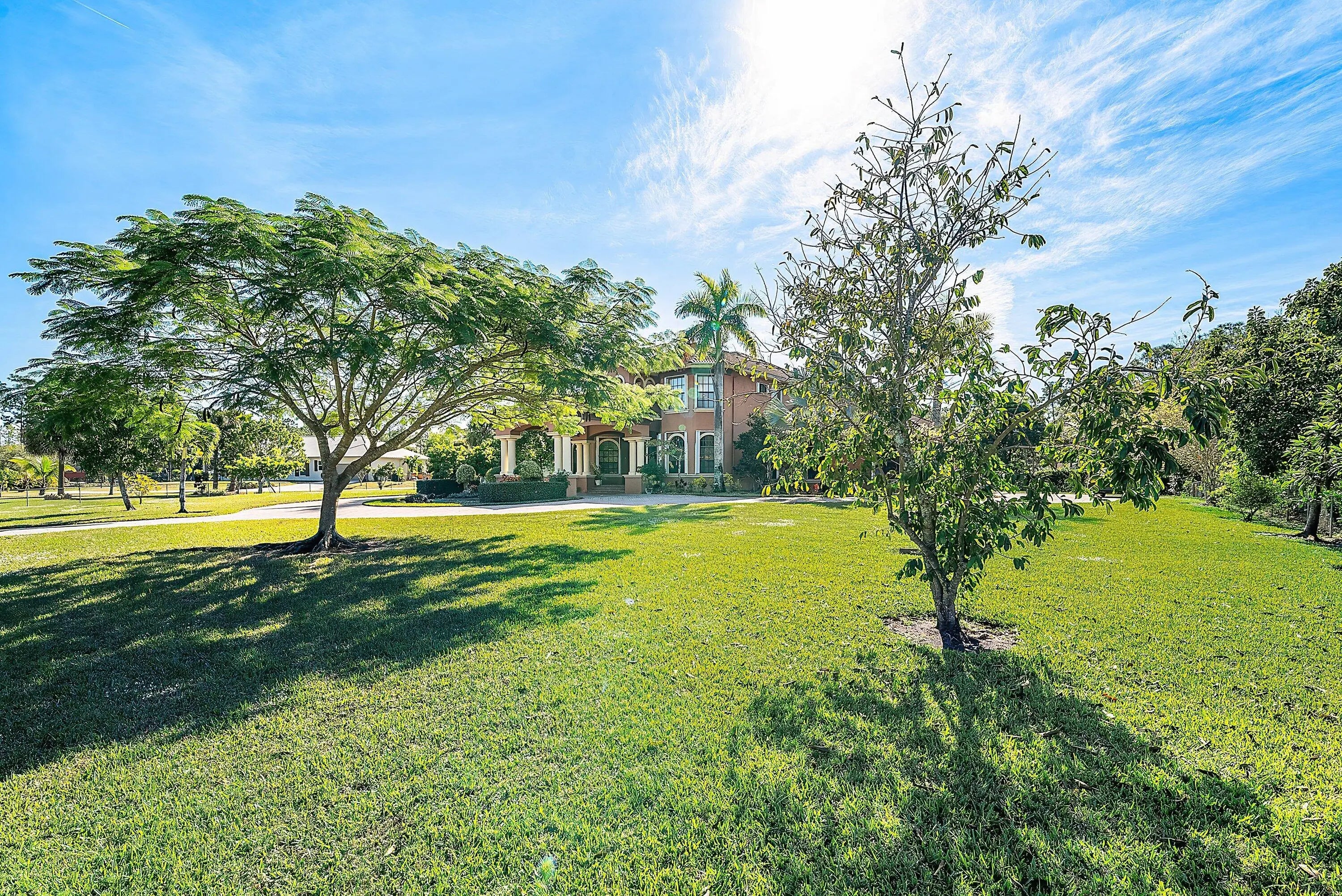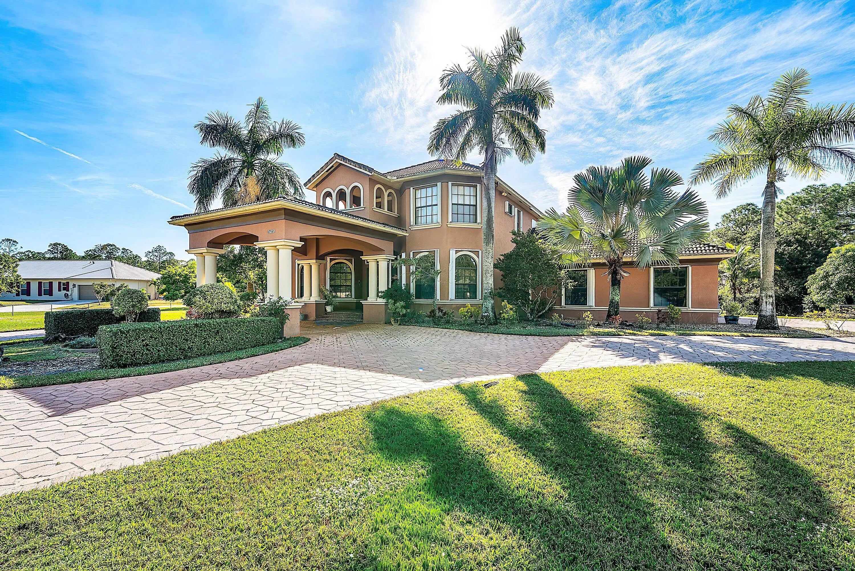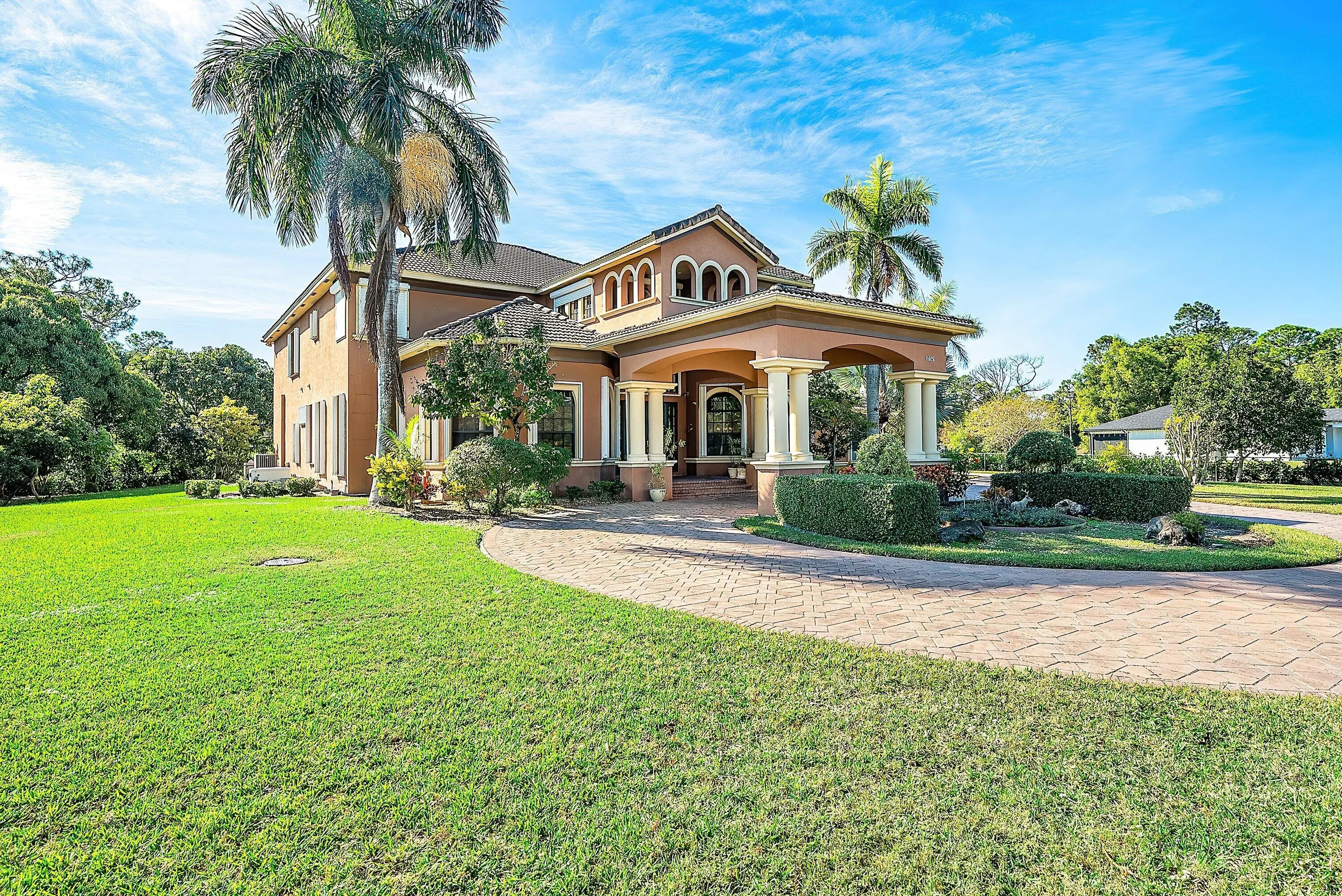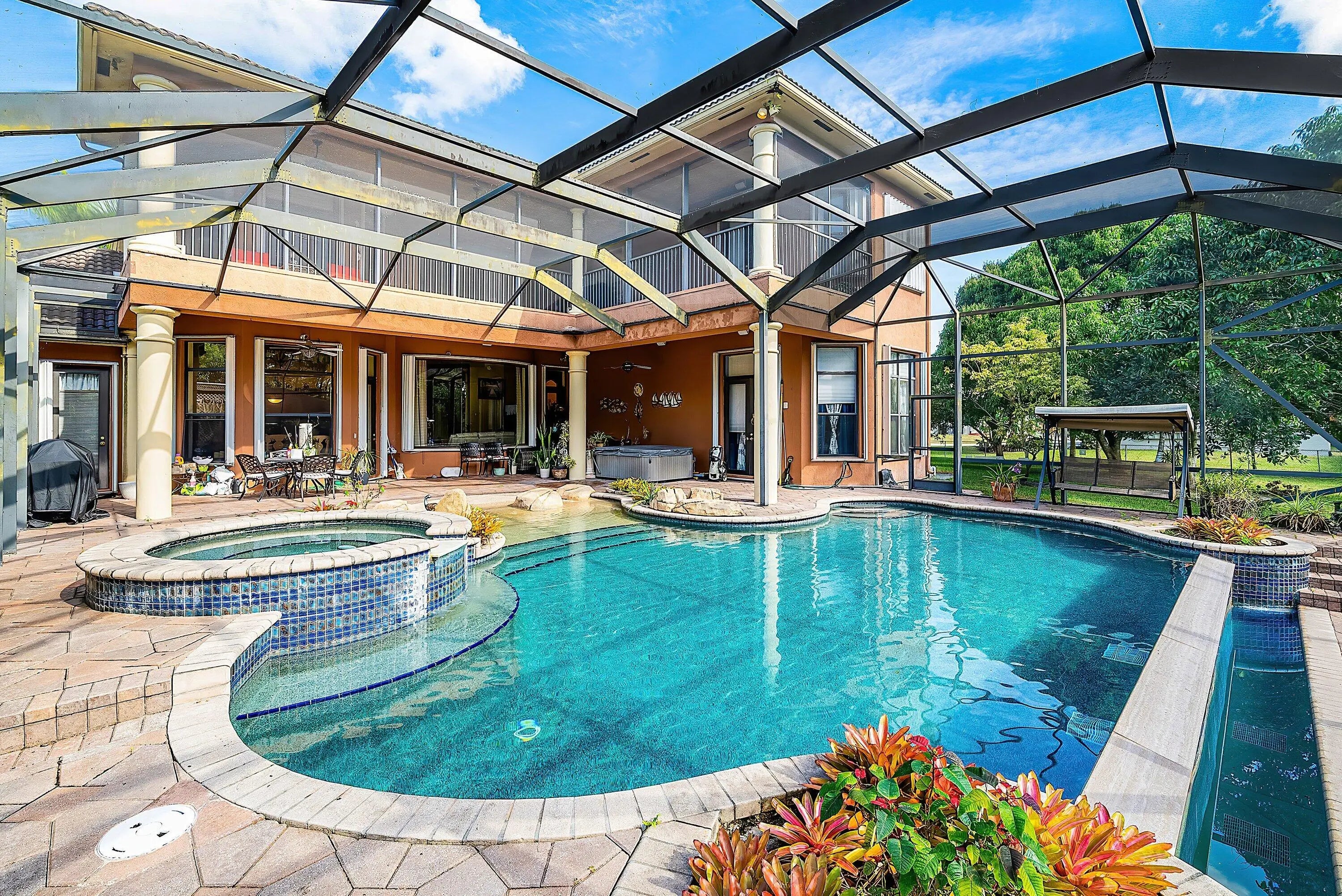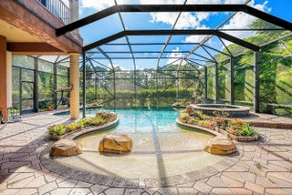 Sprawling estate on 1.15 ac of land available. Offered with 5 plentiful bedrooms plus media room, 5.5 bathrooms and covering over 5500 sf of living space. Featuring a serene zero entry pool within the screened patio, surrounded by lush landscaping and beautiful fruit trees. Step inside and follow the inviting walkway to the dining room, living room, and main living area. The home offers two exceptional primary suites—one upstairs and one downstairs. The first floor suite is adorned with peaceful garden views, two walk in closets and a generous bath with separate tub and shower. The living area also covers spans the back of the home offering effortless access to the fantastic patio. Upstairs, the expansive second primary suite showcases a large bedroom, generous sitting area, office space and a luxurious bath with an oversized shower and separate jetted tub. The adjacent loft provides access to three guest bedrooms and two full bathrooms. Step onto the amazing screened in patio showcasing a custom, heated, zero entry infinity pool with up to 8 ft of depth and complemented by an attached spa. Designed for effortless entertaining the outdoor retreat boasts indoor/outdoor speaker system and dedicated cabana bath for your convenience. This home also offers a partial generator supporting the entire first floor, newer AC units and water heater plus an additional room - currently used as the media room - to enjoy. A wrap around screened balcony extends along the second floor is perfect for relaxation and sunsets views, all while overlooking the beautiful grounds. Beyond the patio, ample green space awaits your personal touch. This residence offers endless possibilities. Schedule your showing today.