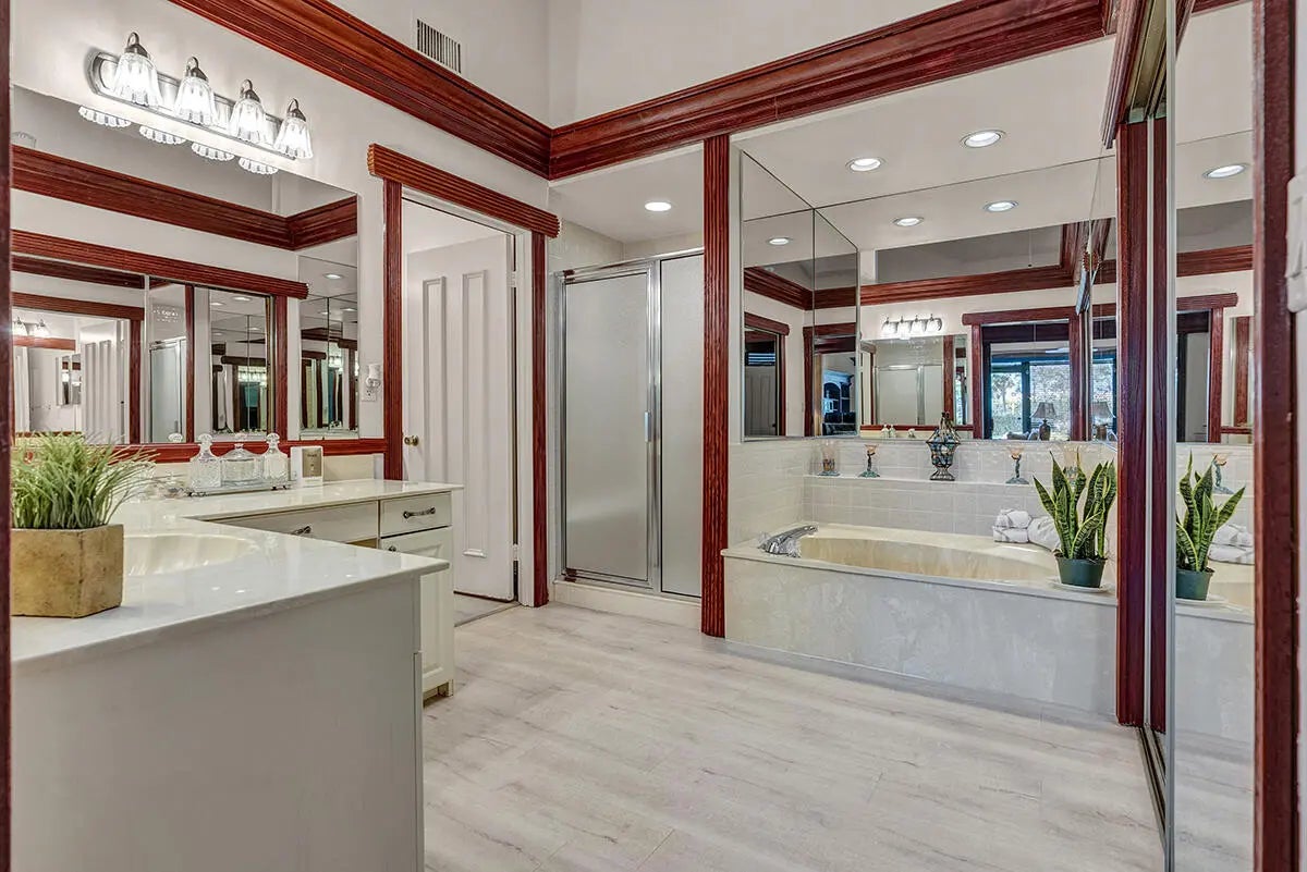 Built-in Features, Cathedral Ceiling(s), Vaulted Ceiling(s), Walk-In Closet(s), Bedroom Layout - Split, Roman Tub