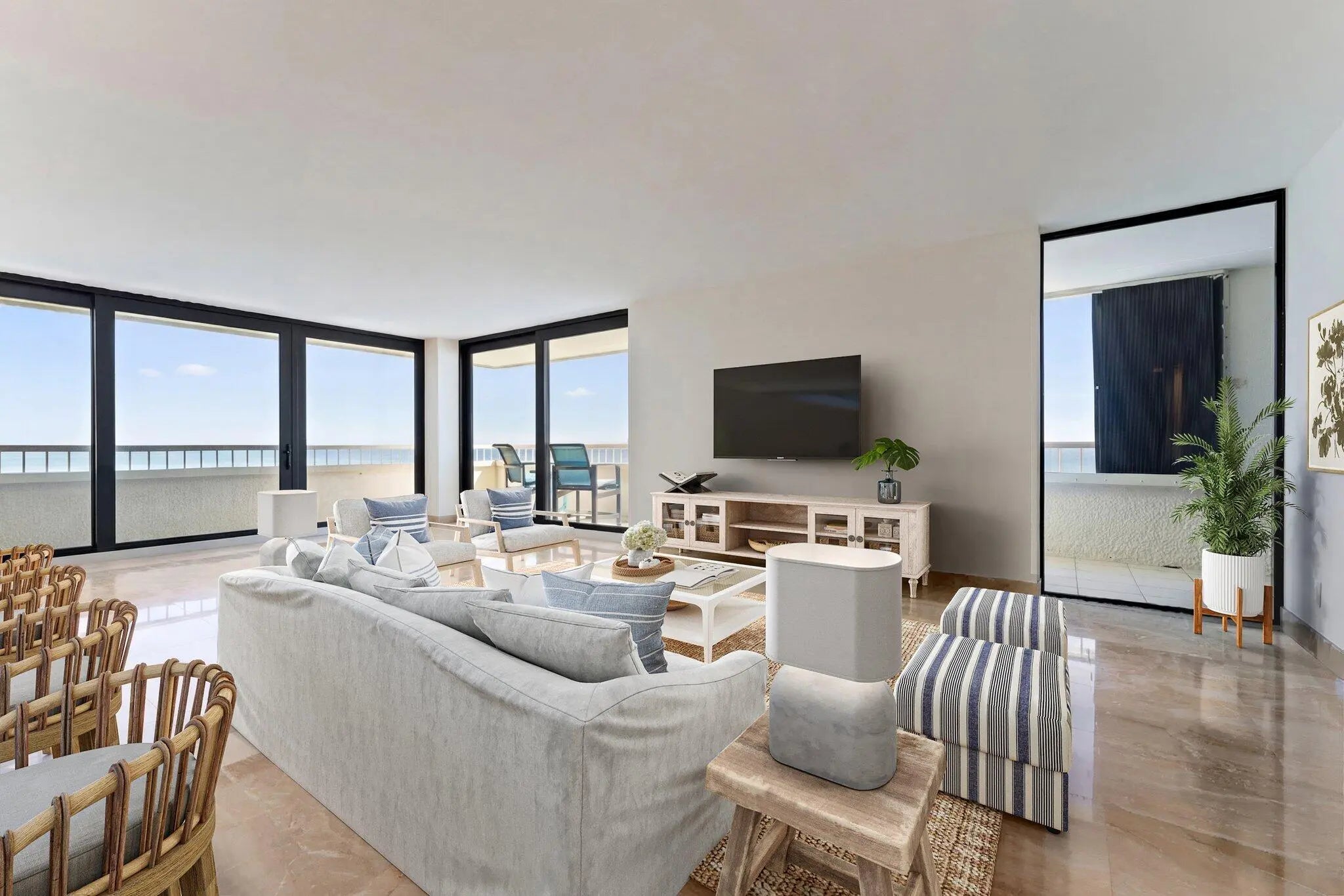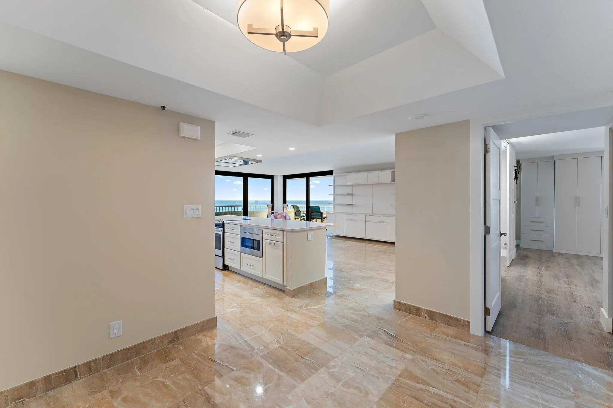 This renovated 2-bedroom, 2-bath ocean-facing corner residence offers unobstructed ocean views and a spacious wraparound balcony, ideal for enjoying sunrise views and ocean breezes. Ocean-facing units in this building are rarely available. The Reaches has been fully renovated inside and out and is fully funded with no active or pending assessments, offering true peace of mind. Amenities include a resort-style oceanfront pool, hot tub, direct beach access, brand-new oceanfront fitness center with panoramic ocean views, renovated social room, and tennis and pickleball courts. The unit includes a private storage unit and a designated garage parking space located literally steps from the entrance. This is a rare chance to secure a move-in-ready oceanfront corner residence in one of Singer Island's most sought-after buildings. Schedule your private showing today - opportunities like this do not come along often.