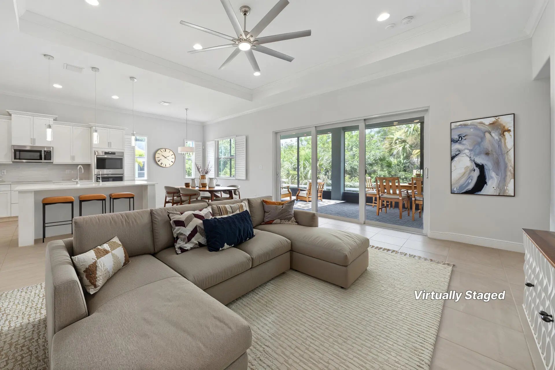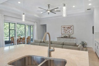 Thoughtfully designed and generously proportioned, this three-bedroom, two-and-a-half-bath residence with a flexible den or office, built in 2018, offers both comfort and versatility. The home includes a two-car garage, paver driveway, and an inviting front porch that enhances its curb appeal. The gourmet kitchen is a standout, featuring a center island with seating, striking tile backsplash, stainless steel appliances, a wall oven, pantry, and a built-in bar area ideal for entertaining. Elegant tile flooring, volume ceilings, impact windows with plantation shutters, and a tray ceiling in the main living area add refined architectural detail throughout. The oversized primary suite provides a spa-like retreat with dual vanities and an expansive shower for two with dual shower heads. A covered and screened lanai extends the length of the home, seamlessly enhancing the indoor-outdoor living experience. Additional highlights include an indoor laundry room with sink and cabinetry. Residents enjoy Huntington's gated entry, community pool, clubhouse, and fitness center, all with low HOA fees. Conveniently located just off King's Highway and minutes from shopping, dining, schools, and parks.