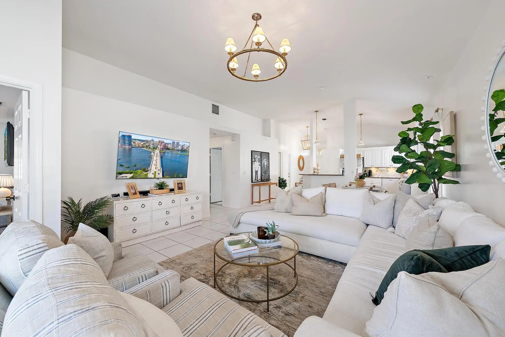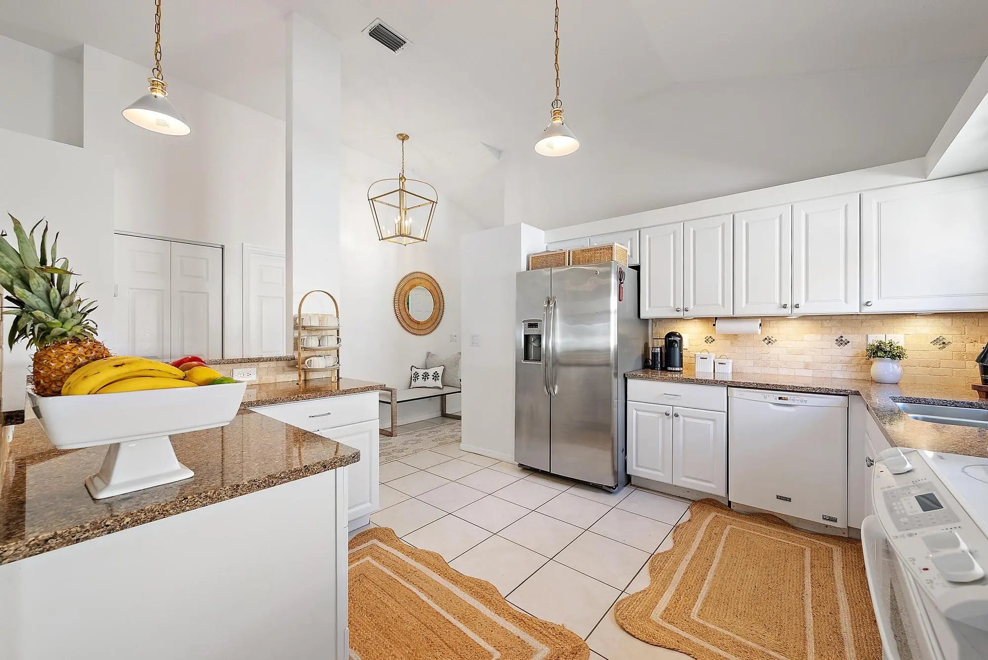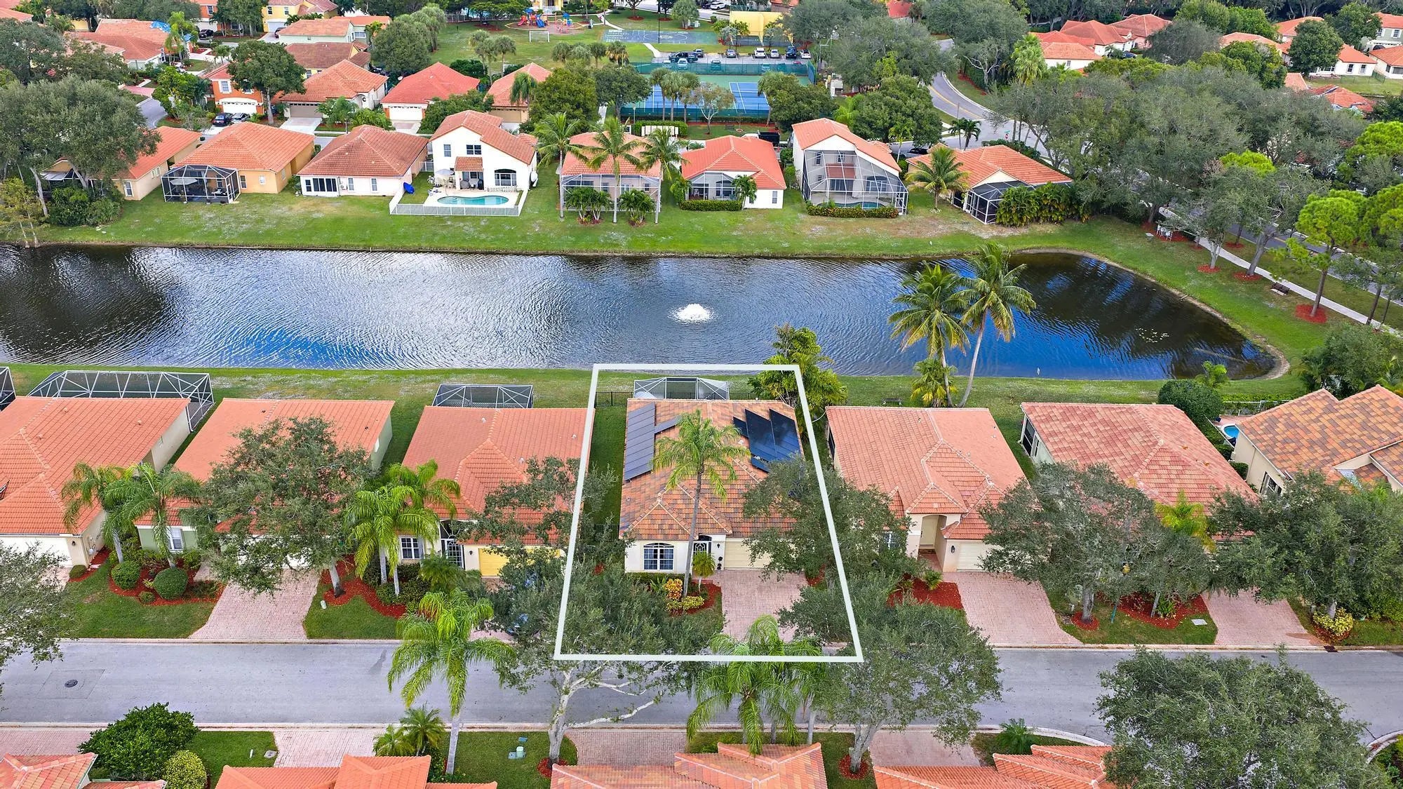 Reap the benefits of brand-new SOLAR PANELS in this beautifully appointed lakefront home. Filled with natural light and enhanced by soaring cathedral ceilings, this 4-bedroom, 2-bath residence blends comfort with style. Recent updates include: designer light fixtures, on-trend drapery rods and new drapes, Serena & Lily wallpaper in the primary and guest bathrooms, a freshly painted guest room, an updated primary bathroom with walk-in shower, 2024 solar panels and a 2023 Roof. Step inside to find a private fourth bedroom - ideal as an office - featuring volume ceilings and abundant natural light. The kitchen offers white cabinetry with ample storage, granite countertops, stainless steel refrigerator, and a convenient wine fridge. A spacious formal dining area welcomes guests, while the open living space provides plenty of room to relax or entertain, all overlooking a private lake. The primary suite offers serene privacy, complete with a large walk-in closet, new drapes, new chandelier, custom tray ceiling, and an updated bathroom featuring new vanity mirrors, a soaking tub, walk-in shower, dual sinks, and linen closet.Two additional guest rooms feature fresh paint, new light fixtures, and double closetsperfect for family, visitors, or flexible use. Outside, enjoy an oversized screened-in patio with pavers, a fenced backyard, and gorgeous lake views with a tranquil water featurean ideal spot to unwind and take in stunning Florida sunsets. HOA fees include cable, internet, partial lawn care, and security, making low-maintenance living a breeze.