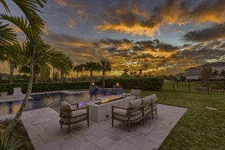 Stunning sunsets offering rare double water views overlooking serene lakes from this Luxury home. Located in the highly desirable Coral Isles in Avenir this beautifully upgraded residence offers elegant single-story living, four bedrooms, a three-car garage, and a thoughtfully designed open layout with high ceilings and abundant natural light through. The upgraded gourmet kitchen features stacked cabinetry, lighting and custom window treatments. Move-in ready and well appointed, this home delivers comfort, style, luxury and functionality with thoughtfully curated enhancements throughout. The resort-style outdoor living area features a custom pool, spa, fire bowls, a fully equipped outdoor kitchen by Island Living Danver stainless steel cabinetry, granite countertop outdoor-rated appliances, integrated lighting, and a finished lanai ceiling, complemented by a phantom screen and firepit for year-round enjoyment. Professionally enhanced landscaping with decorative rock, outdoor lighting and a private 3-foot gate completes the tranquil outdoor retreat. Inside the home showcases beautiful flooring, a custom living room entertainment center, built-in office cabinetry with a striking accent wood wall. The chef's kitchen is appointed with marble backsplash, double-stacked cabinets, pots-and-pans drawers, dual cabinet pullouts, upgraded microwave, glass pantry door, and under and over-cabinet lighting. Additional features include custom closets in the primary suite and pantry, upgraded primary bath cabinetry and shower doors, designer lighting, chandeliers, ceiling fans, blinds and drapery, upgraded front door hardware, finished garage floors, window tinting, a whole-home generator, water softener, reverse osmosis system, and an integrated sound system with speakers in six interior rooms as well as the lanai and backyard. Perfectly positioned to capture breathtaking sunsets, this exceptional home delivers refined Florida living. Experience private resort-style living at its finest in this vibrant community. Located in sought-after Palm Beach Gardens, this community blends contemporary home designs with exceptional amenities, all set in a relaxed and inviting atmosphere. Residents enjoy exclusive access to the community's private clubhouse offering an onsite activities director, a wide array of special activities and events. Amenities include a picturesque resort-style pool, spa, pickleball, tennis, fitness center, large event room, indoor/outdoor lounge, playground and much more. Avenir offers access to miles of walking and biking trails, and a soon to be competed vibrant town center with shops and restaurants. Conveniently located near Sand Hill Crane Golf Club an 18-hole championship course, the new Nest Par 3 Course and various dining options. Across the street is PGA National's Estate Course, with membership options available. Minutes away from shopping, dining, the Airport, Palm Beach and so much more.