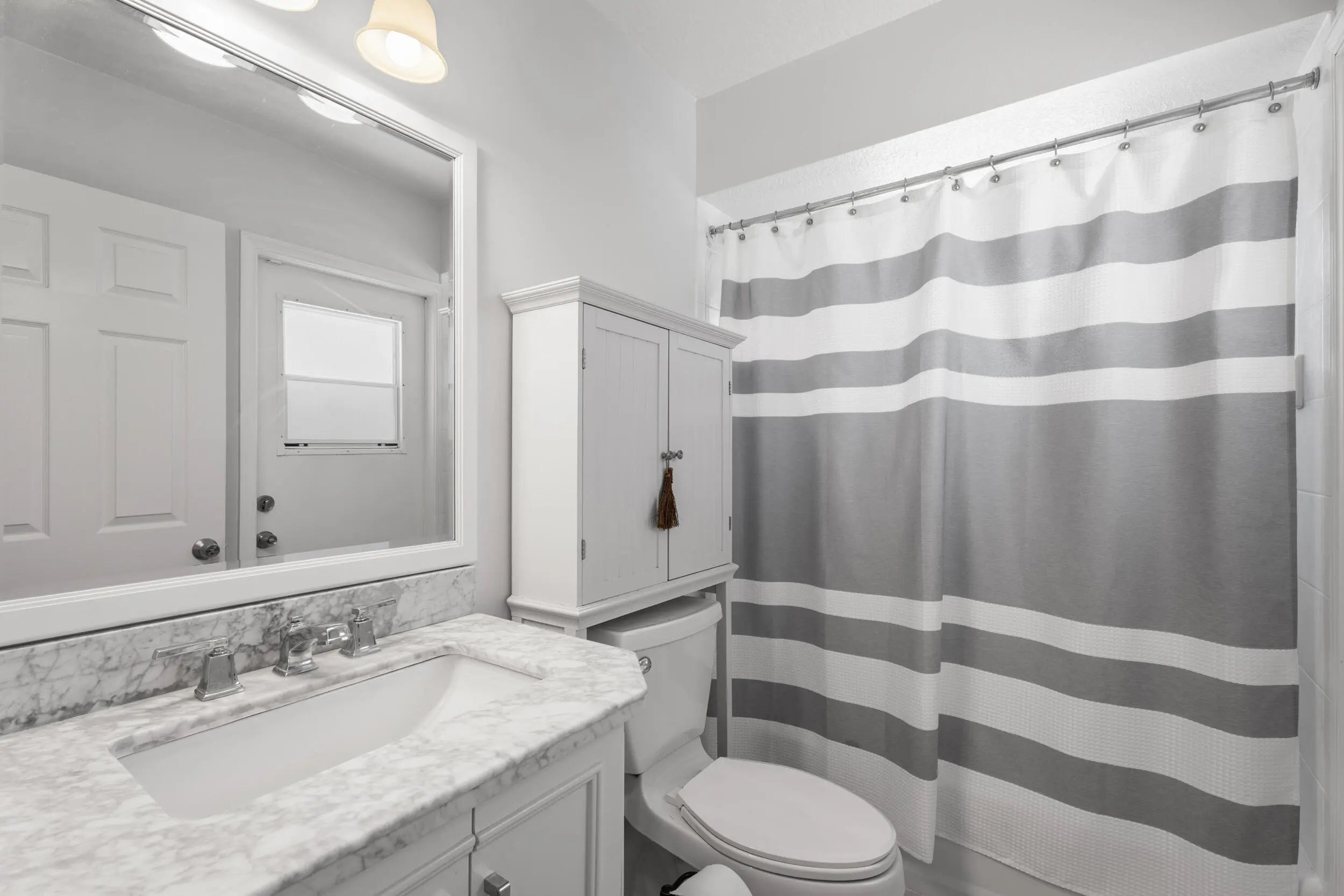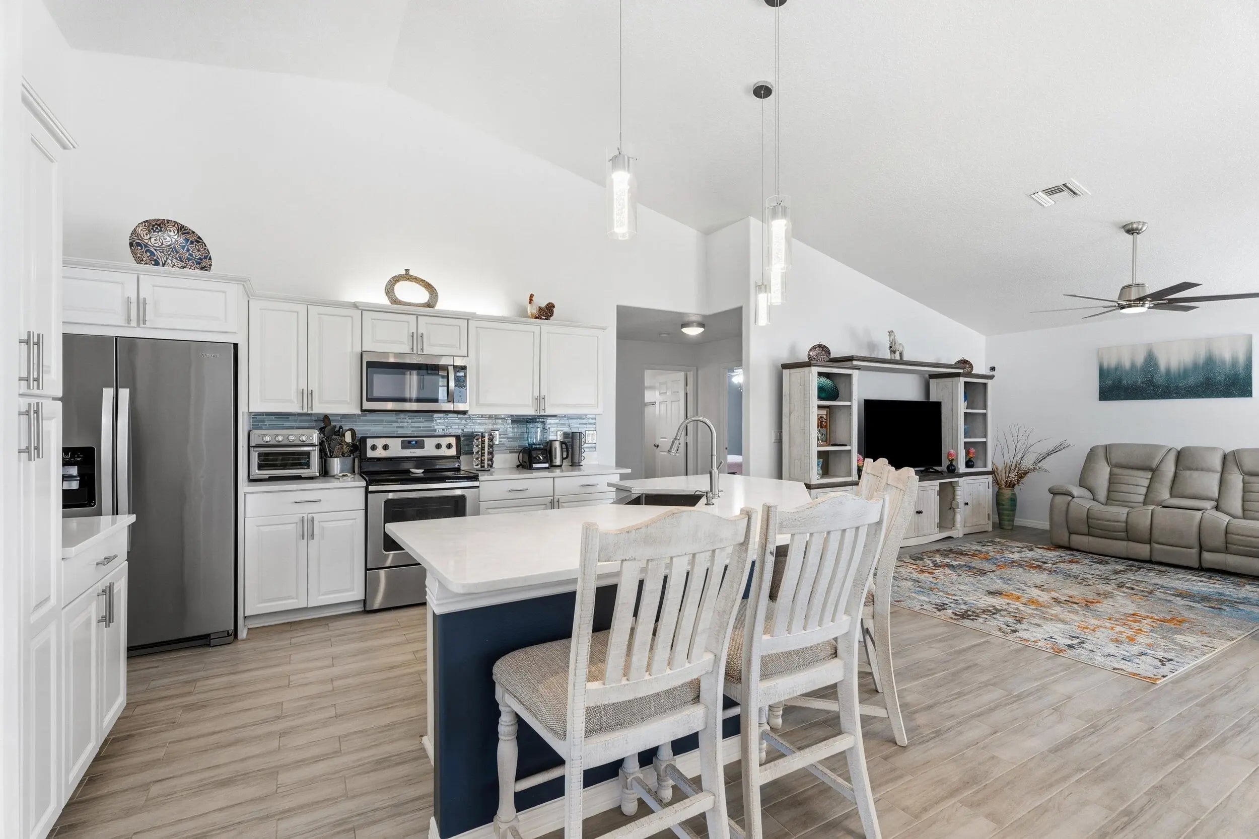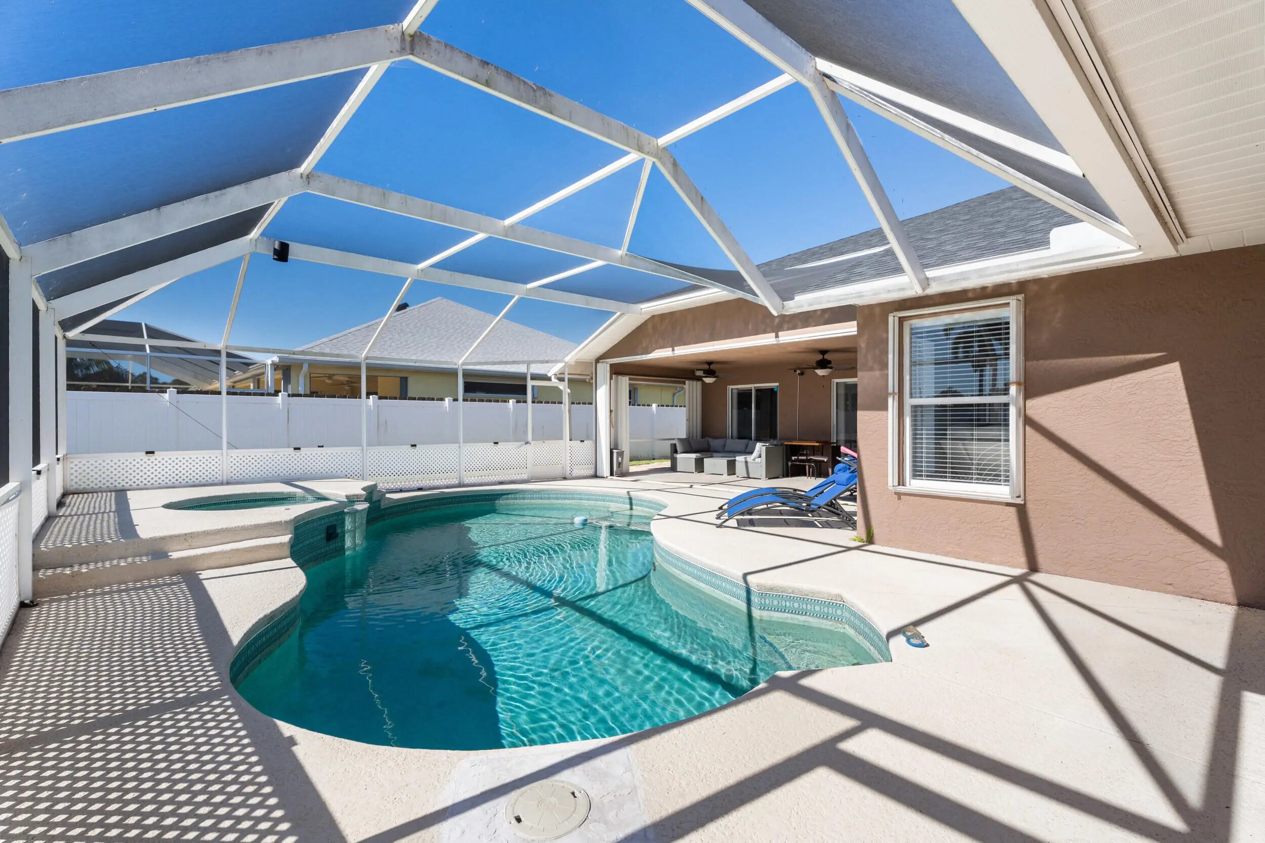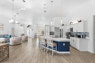 This gorgeous 4 bedroom, 3 bathroom home is move in ready and truly has it all! Large circular paver driveway with room for boat or RV. Rare, oversized lot (.38 acres) with a fully fenced backyard. Screened in pool and spa. 2024 roof. Newer AC. Full accordion shutters. Inside is tastefully redone with tile flooring throughout. Remodeled kitchen with white wood cabinets, quartz counters and large center island. Thoughtfully designed split floor plan. Master suite has been completely remodeled. Two guest bedrooms share an updated guest bathroom. Fourth bedroom is down a hallway and near its own cabana bath that goes out to the pool which would be great for multi-generational living or a renter. Screened in pool and spa area offers private views of the oversized yard. NO HOA!