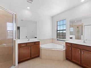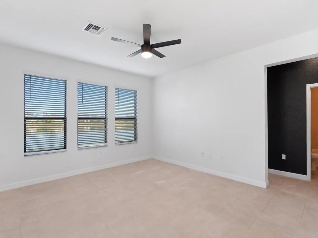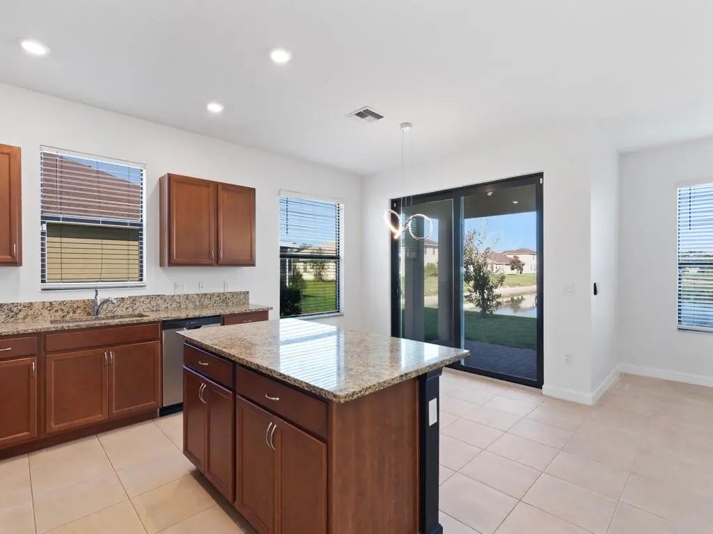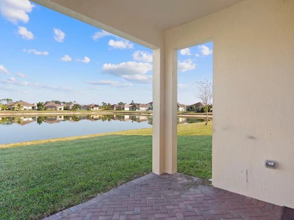 Simply yours with a twist of water views! This spacious 4 bed 3 full bath home with soaring ceilings and ample windows letting in natural light is clean and ready for immediate occupancy. Enjoy multiple living options with a formal dining/den room upon entry + a 1st floor bedroom to match. The home offers a spacious kitchen, granite counters, tile floors, stainless steel appliances, a huge covered front porch and covered patio overlooking the lake. The main bedroom is oversized with his and hers sinks, separate walk-in shower and large tub. Community pool and plenty amenities to enjoy!