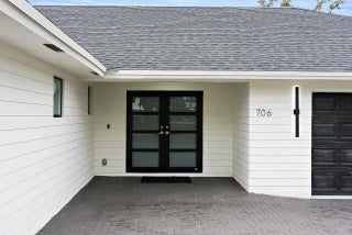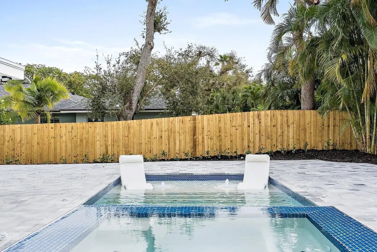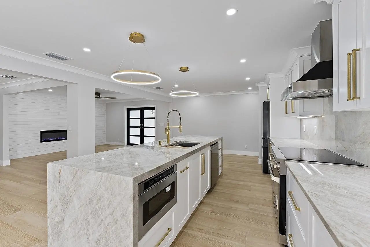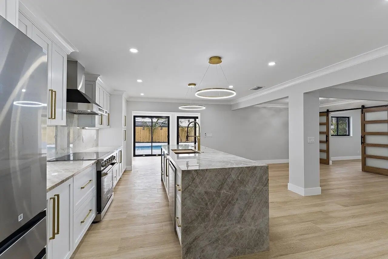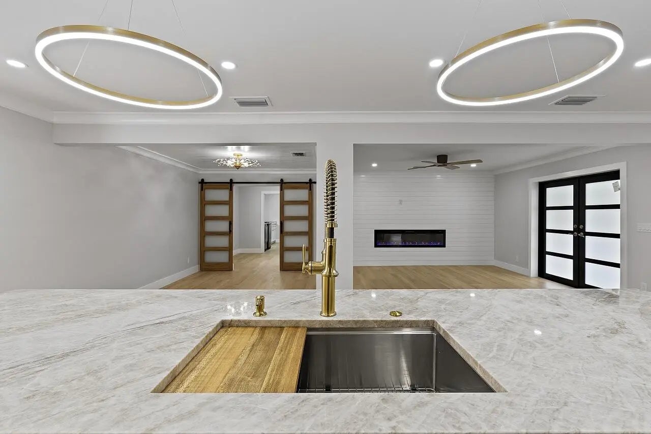 WALK TO THE BEACH! No expense spared in reinventing this exquisite true 3-bedroom home w/den. Major improvements completed in 2026 include new roof, impact glass doors/sliders, full electrical rewire w/new panel, new plumbing and sewer lines, spray foam insulation, new ductwork, and new A/C unit and handler. The stunning brand-new pool with raised spa features a sundeck, pool heater, and saltwater system, creating a private resort-style oasis. The chef's kitchen showcases ALL-AMERICAN custom wood cabinetry, Taj Mahal quartzite countertops, full backsplash, and a grand waterfall island. Designer finishes abound throughout, including beach oak porcelain tile flooring, crown molding, upgraded baseboards, solid wood core doors, LED recessed lighting, and statement light fixtures and fans The baths have been tastefully redesigned with new tile, vanities, and glass-enclosed shower/tub combinations. Additional highlights include an oversized laundry room with sink and upper and lower cabinetry, and a versatile denideal as a home office or gaming roomenclosed with a stylish barn door. The outdoor space impresses with a new fence, fresh landscaping, nearly 3,000 square feet of French-pattern marble decking, a putting green, and an outdoor shower. Modern conveniences include EV charging, epoxy garage floor, impact garage door, Ring doorbell, smart appliances, and a custom living room wall with electric fireplace. The primary suite is a true retreat, featuring a massive 8x14 custom closet and a spa-inspired 6x6 shower with bench, niche, six jets, double-door entry, rain head, standard head, and handheld feature. Natural light pours in from the moment you step off the brand-new driveway through the custom front door into the open, entertainer-friendly main living area.