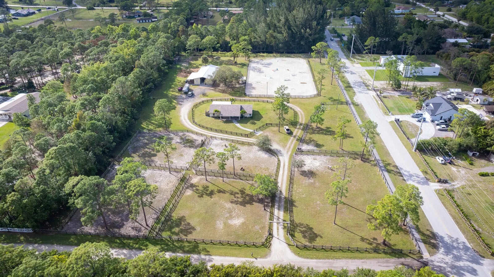 Super location, move right in for the 2026 EQUESTRIAN SHOW SEASON! Fabulous 5.50 acre farm with CBS 3/2 home with office. Home has a 2021 ROOF, remodeled kitchen with farm sink and large prep/snack bar island, office & 30 x 15' screened porch, home has wood plank vinyl flooring throughout. Center aisle barn has 13 stalls also a separated 2 RUN-IN stall barn with small paddocks, 15 STALLS TOTAL. Air conditioned Tack & Feed rooms. LIGHTED ARENA is 230' X 140', perfect for regulation dressage ring or all weather jumping arena. 6 large paddocks, Barn has separate electric meter and RV hookup. Property is perfect for a riding school as there are over 30k families within a 10 mile radius including the Westlake community. All measurements are approximations and subject to error