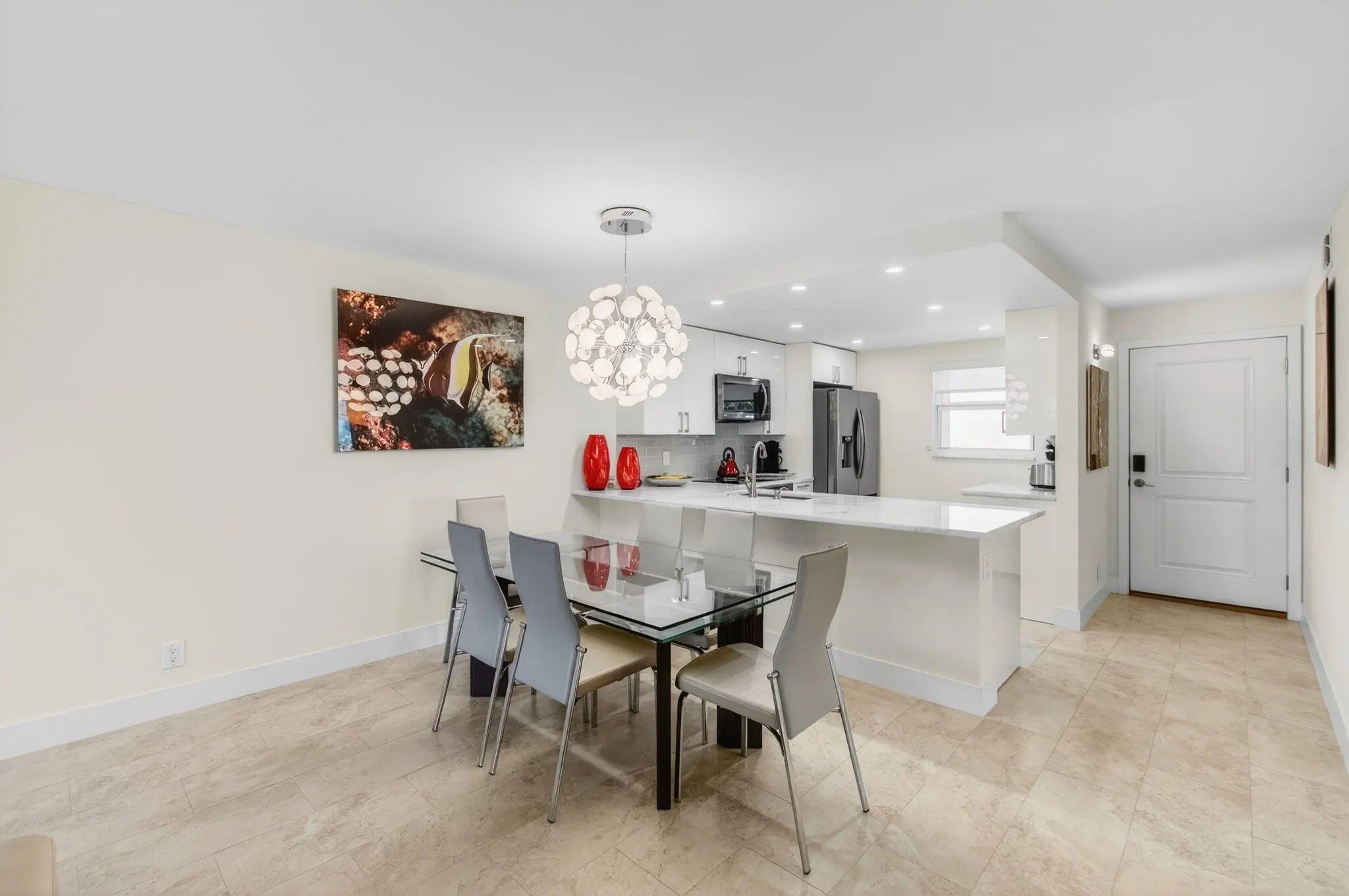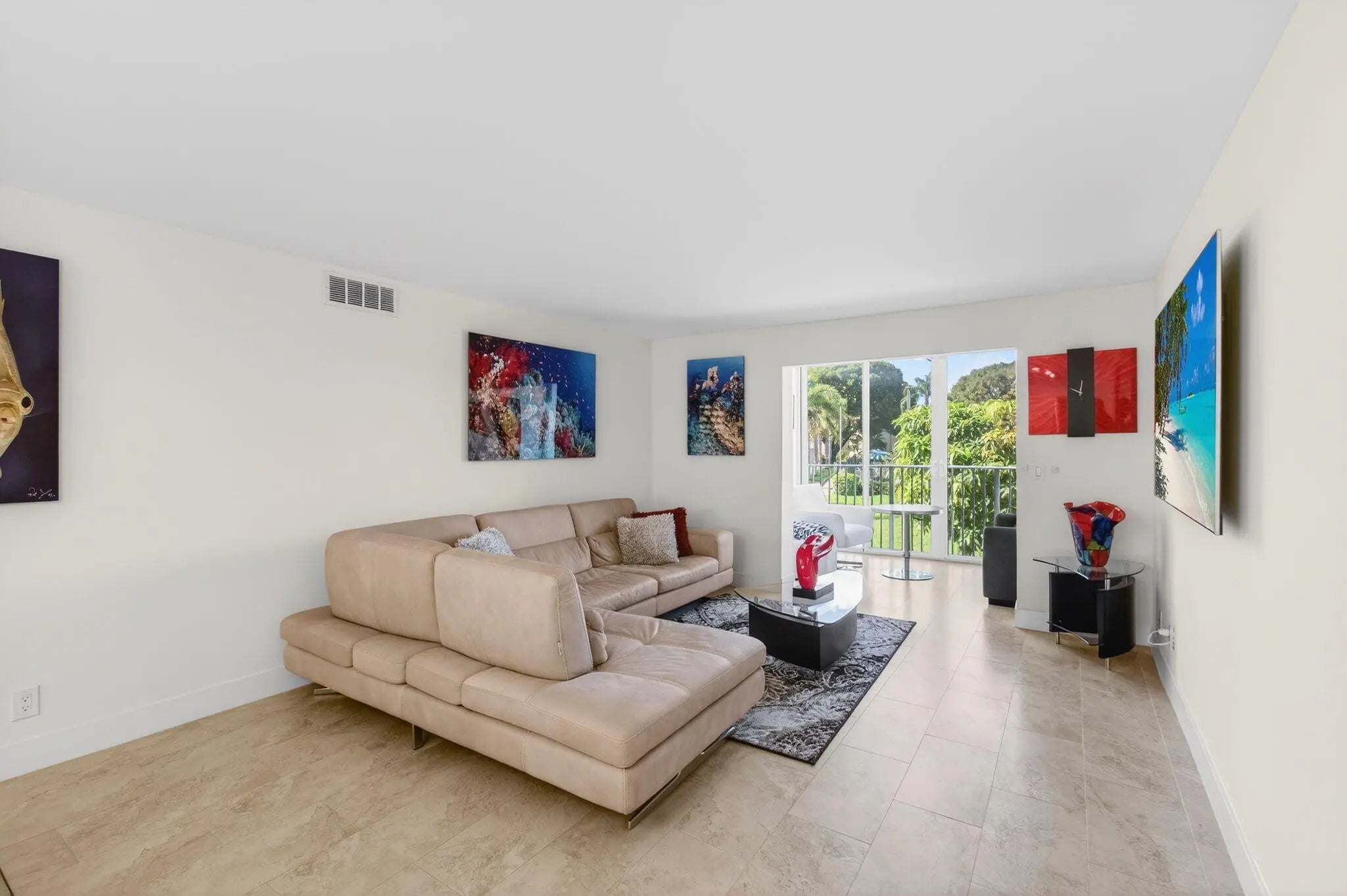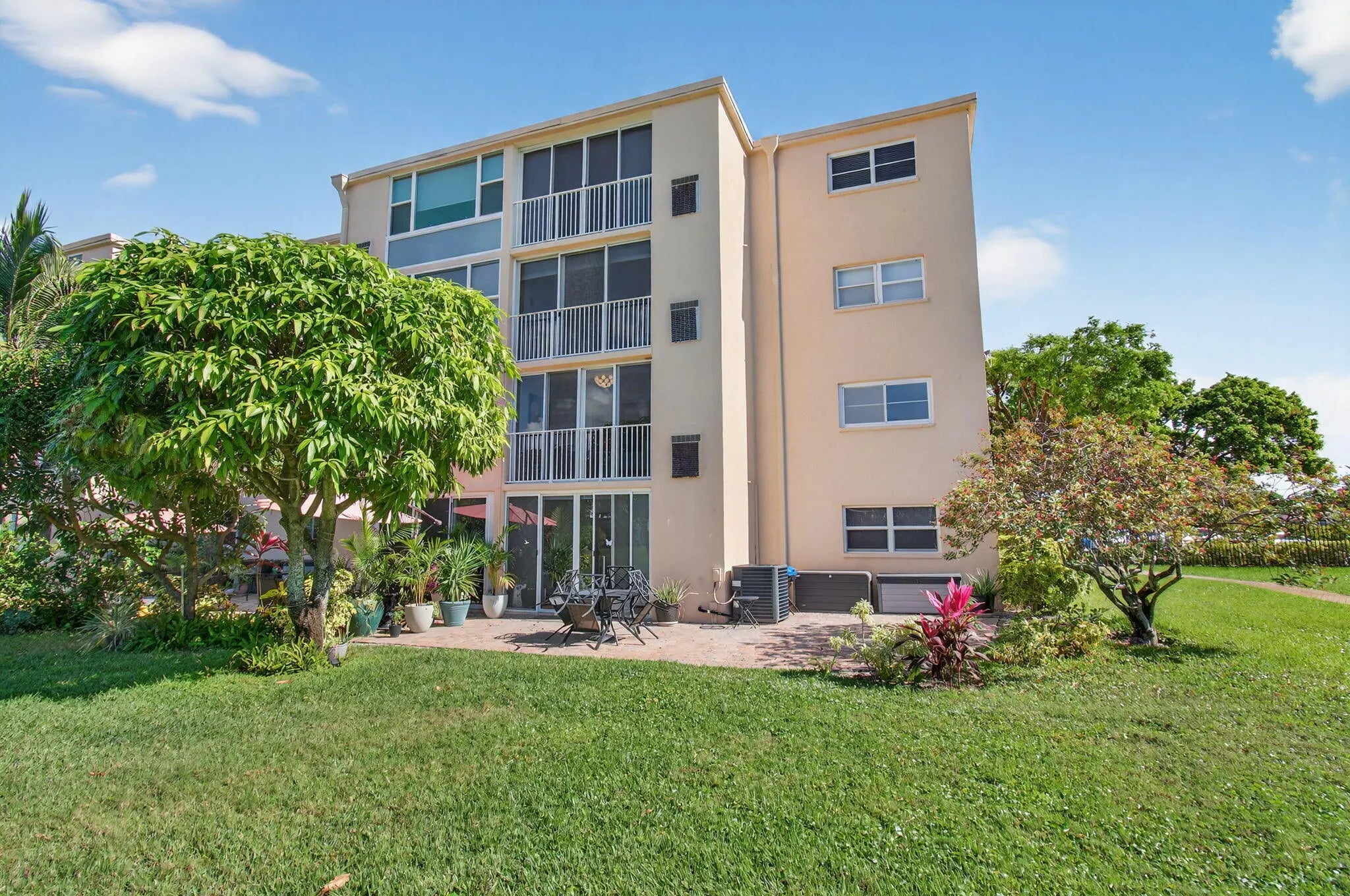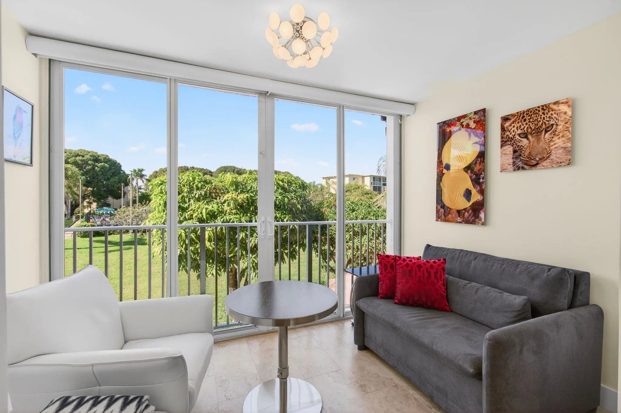 Welcome to this beautifully updated 2-bedroom, 2-bath corner residence in the desirable Village Royale on the Green. This exceptionally bright corner unit has been freshly painted and features full impact windows, light grey tile flooring throughout, and abundant natural light. The open living and dining areas lead to a screened patio with community and pool views, ideally located just steps from the satellite fitness center and pool. Select furnishings may be negotiable. Village Royale on the Green is a well-maintained 55+ community offering two swimming pools, fitness center, tennis courts, shuffleboard, bocce, clubhouse amenities, BBQ areas, and security patrol. Conveniently located in East Boynton Beach, close to shopping, dining, and just 5 minutes to the beach.