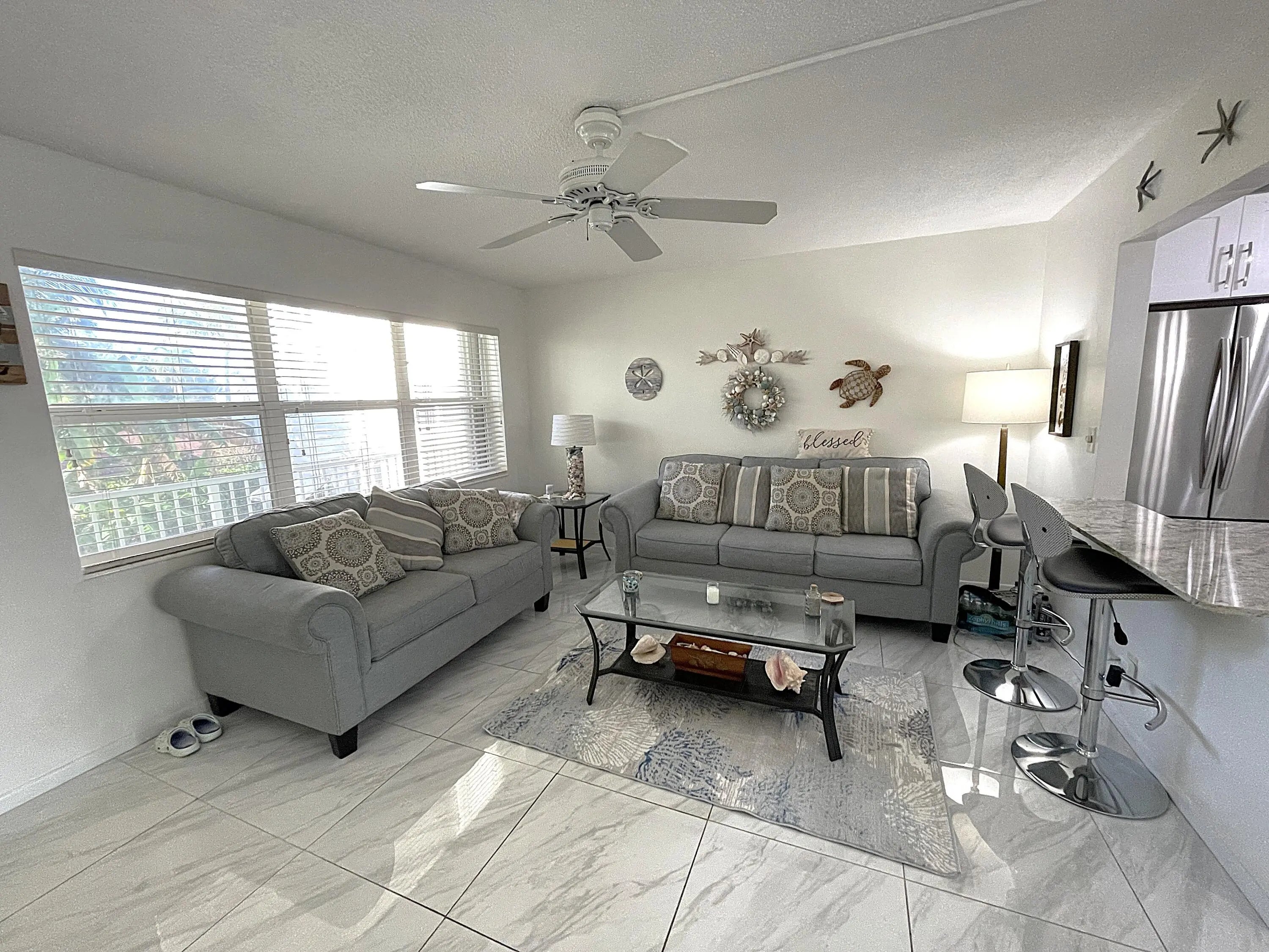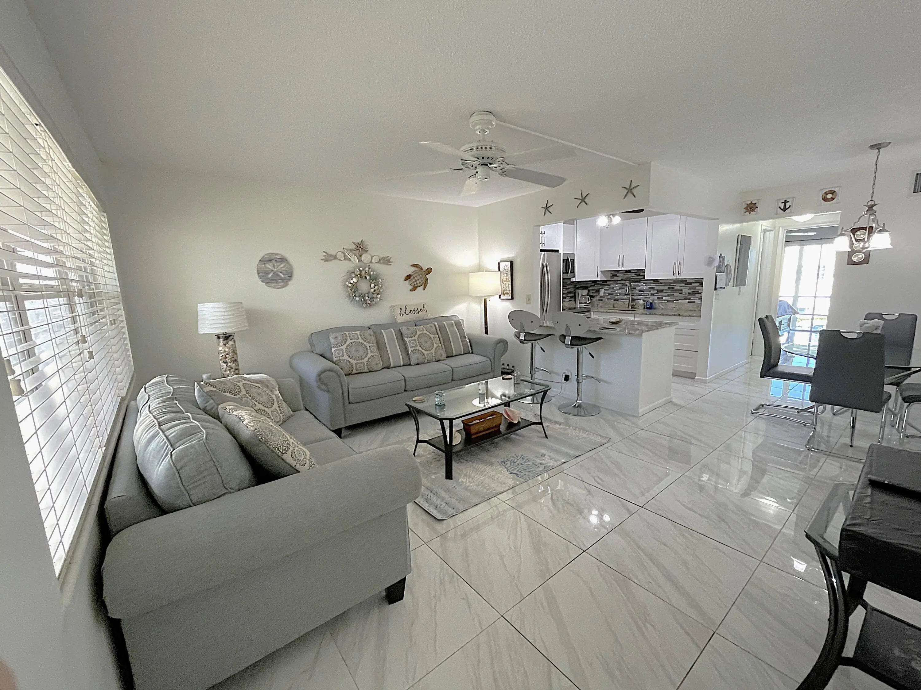 Come fall in love with this rarely available one bedroom, waterfront condo nestled in a private, gated community in East Boynton Beach. Sleek, seaside kitchen with granite counters, stainless steel appliances, and a built-in snack bar. The kitchen opens to the living area for today's modern lifestyle. Romantic master suite with sparkling water views. Relax and enjoy cool breezes on your screened-in patio while watching the boats go by. Sterling Village offers a dynamic 55+ lifestyle with resort style amenities, a full calendar of social activities, and a variety of clubs - the perfect blend of relaxation and recreation. Fantastic location - just minutes to shopping, dining, and pristine beaches. Make this coastal chic oasis your home! Hurricane shutters. Laundry in the unit allowed.