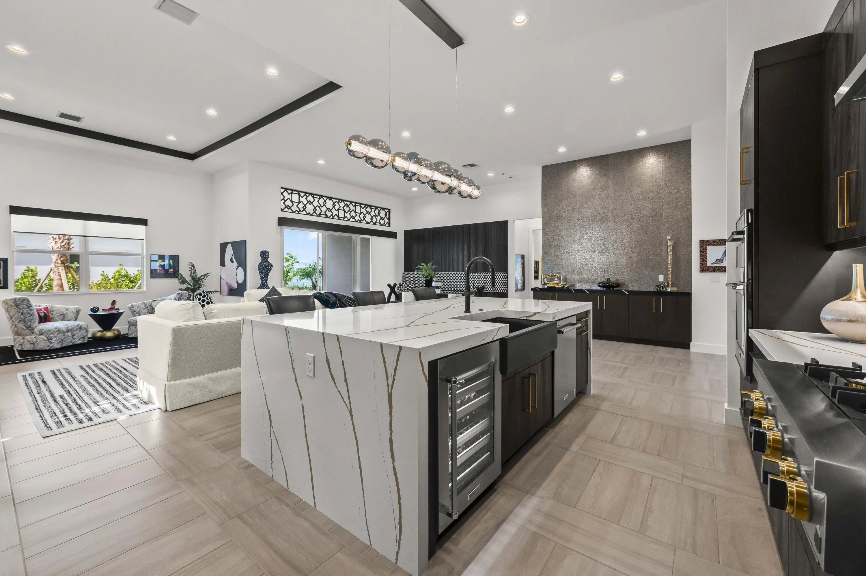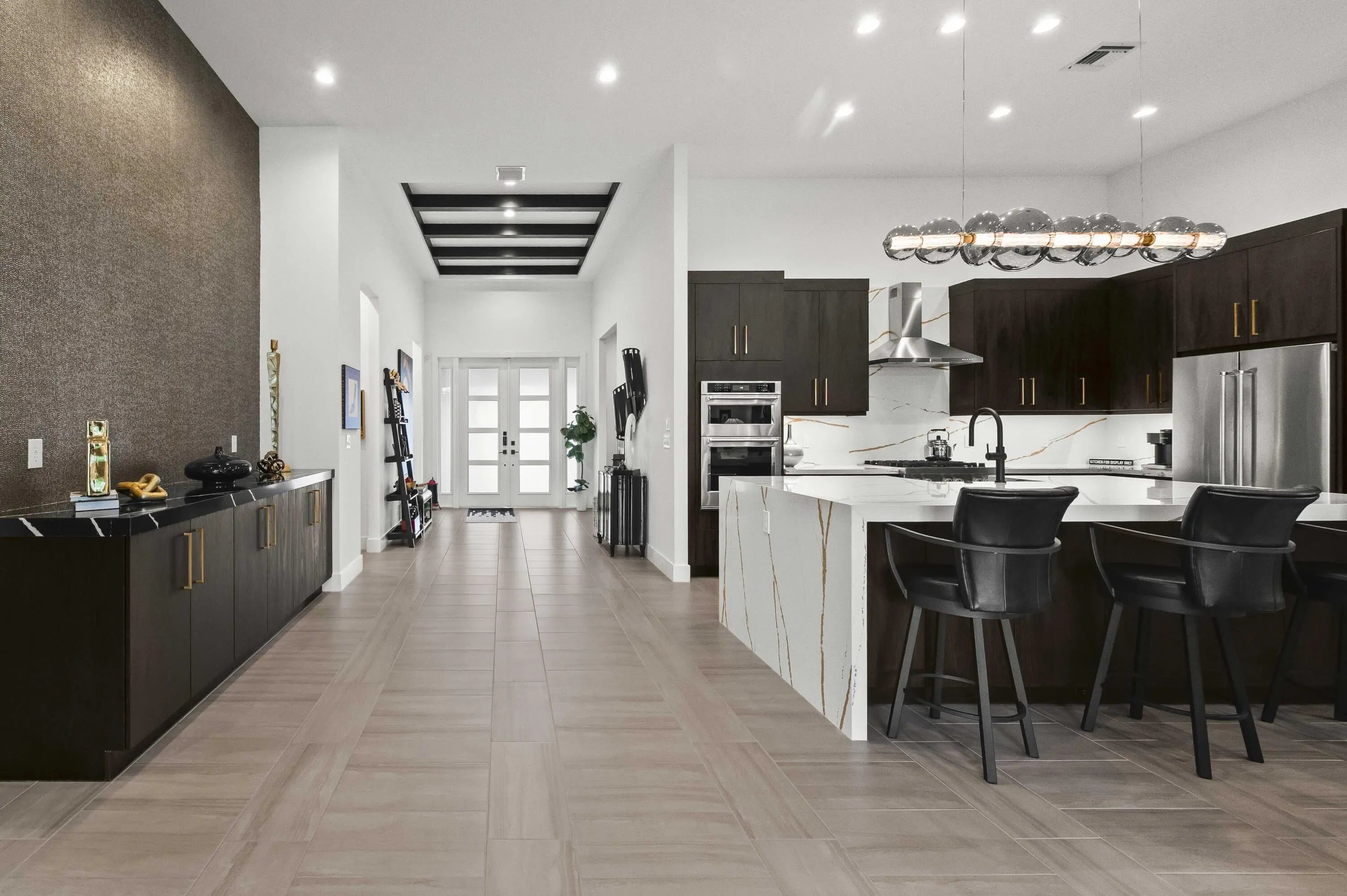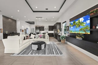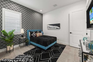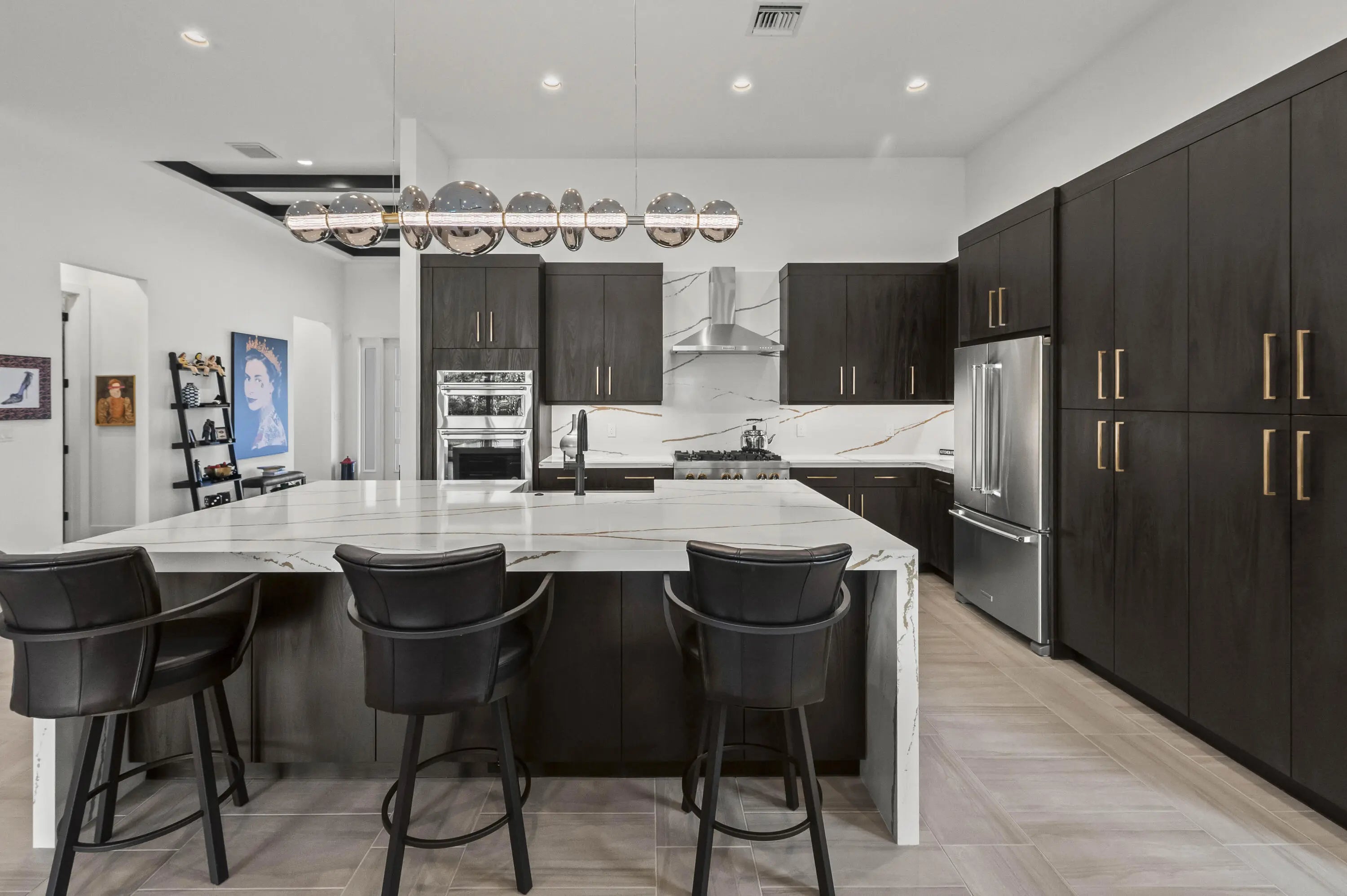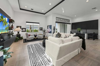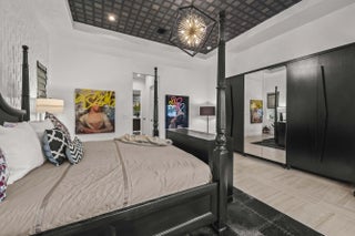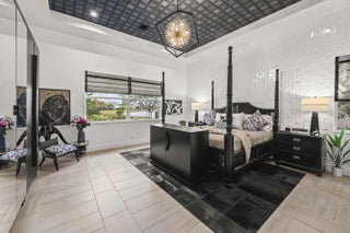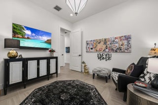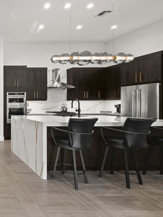 Experience the pinnacle of luxury living in this breathtaking residence, where upgraded double front doors welcome you into a world of sophisticated design and high-end finishes. The heart of the home is the expansive, extended great room, accentuated by striking ceiling beams, a custom built-in TV unit, and a beverage fridge that makes entertaining effortless. Culinary enthusiasts will adore the gourmet kitchen, showcasing a massive island with double waterfall edges and extra cabinetry, a farmhouse sink, and a chef-grade upgraded gas stove with a premium hood. An upgraded lighting package with numerous high hats illuminates the designer touches throughout, including unique feature walls and a chic designer banquette that adds flair to the dining space. Every room in this home has been thoughtfully curated for comfort and style. The dedicated den, which can easily be converted to a 4th bedroom, impresses with a custom-designed desk and wall unit, creating an inspiring workspace. Retreat to the primary suite, where relaxation awaits in a spa-inspired bathroom featuring extended ceramic tile and a luxurious freestanding oval tub. Attention to detail is evident in the customized closets and the premium window treatments found throughout the home, including custom plantation shutters, a unique transom window treatment, and motorized shades in the great room for ultimate convenience. Beyond the interior, the property offers exceptional functionality and curb appeal. The extended garage is a showstopper in itself, boasting a custom epoxy floor, electric car charger, overhead storage, and built-in shelving and cabinetry for superior organization. Step outside to enjoy the serene private lake view, enhanced by custom landscaping with professional front and backyard lighting that creates a magical ambiance at night. Located in a premier 55+ community with resort-style amenities, this home is a true masterpiece of modern design and convenience.