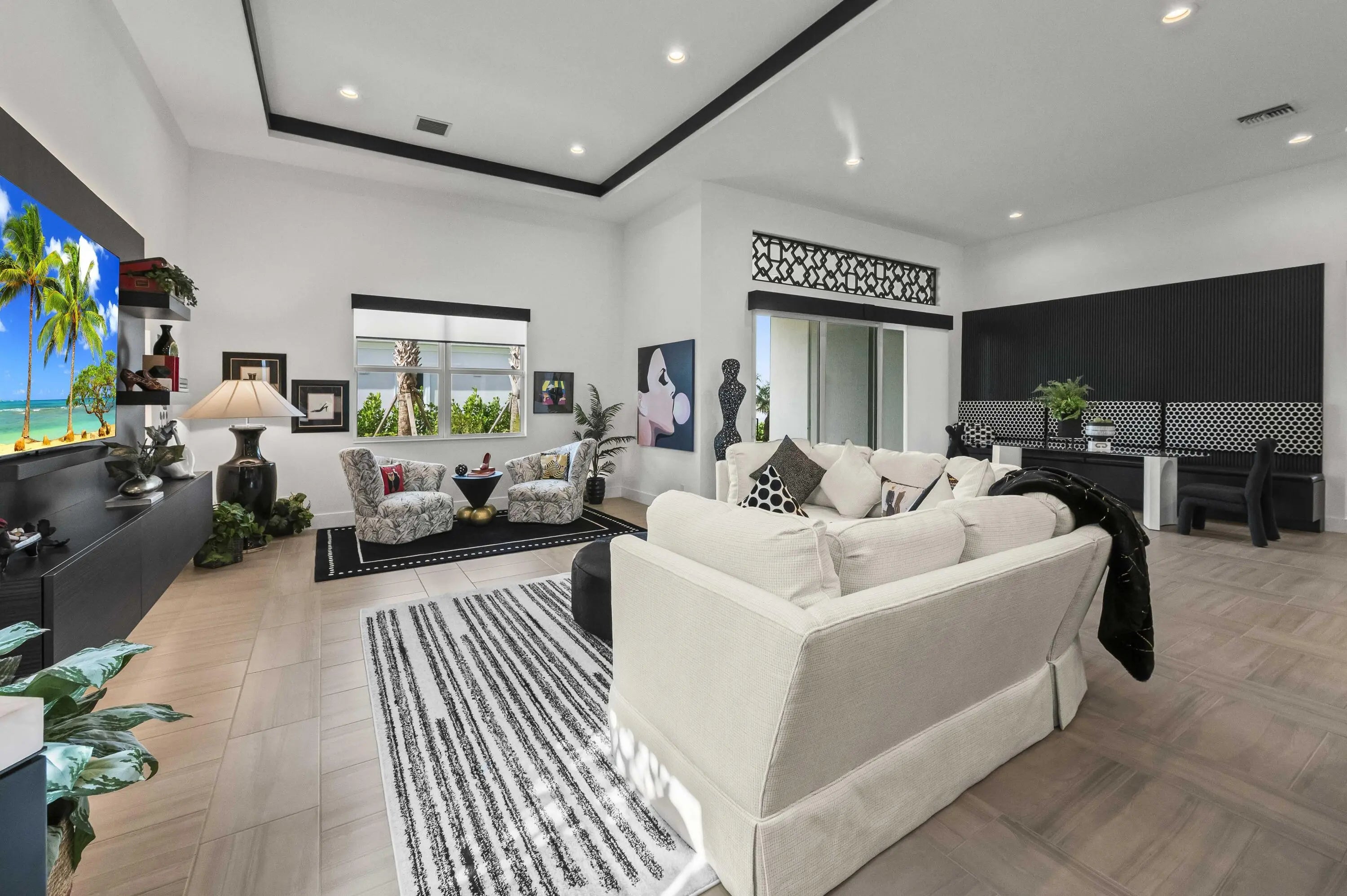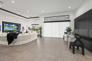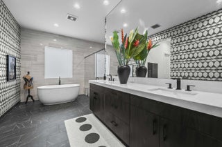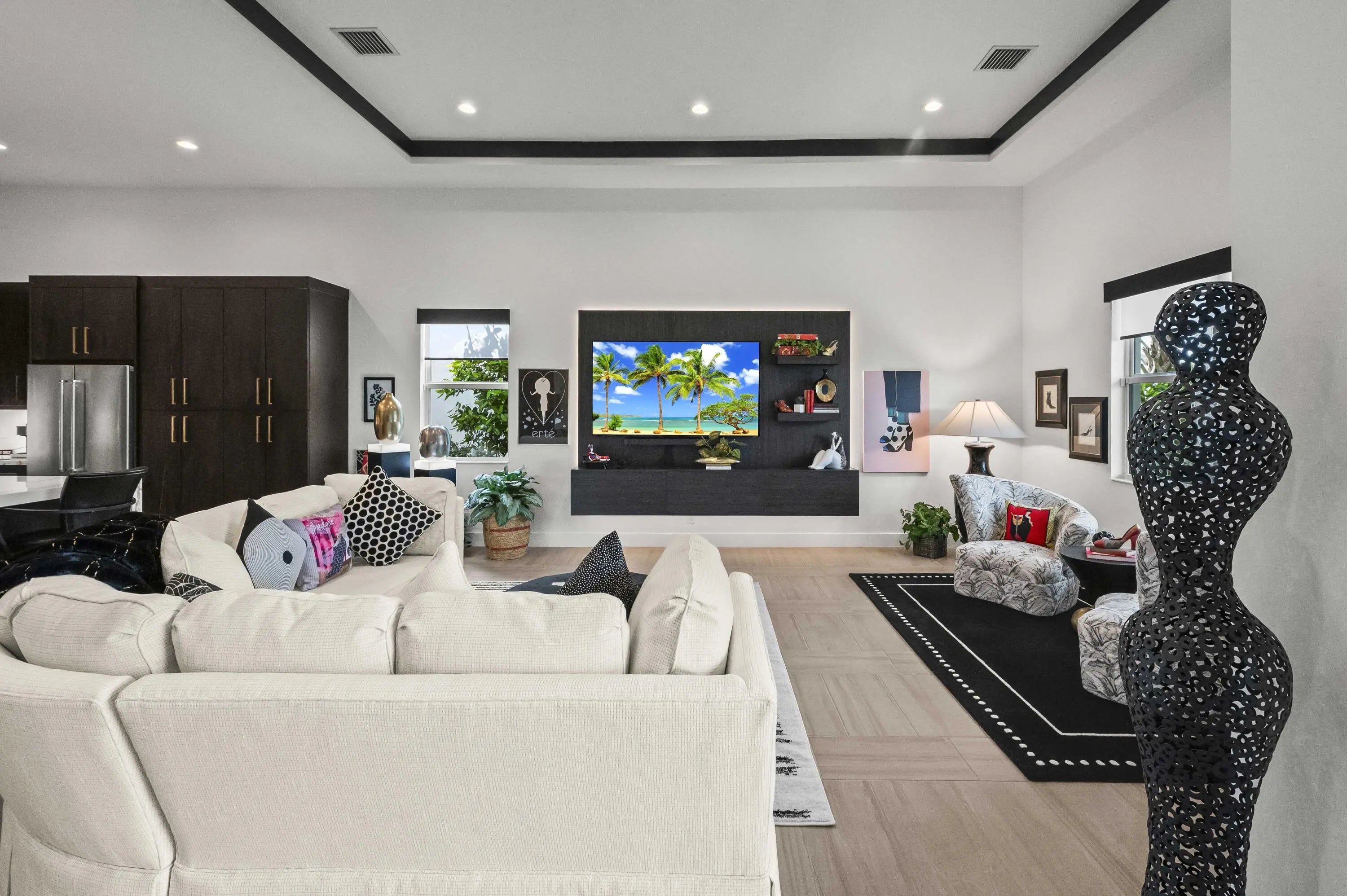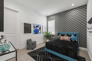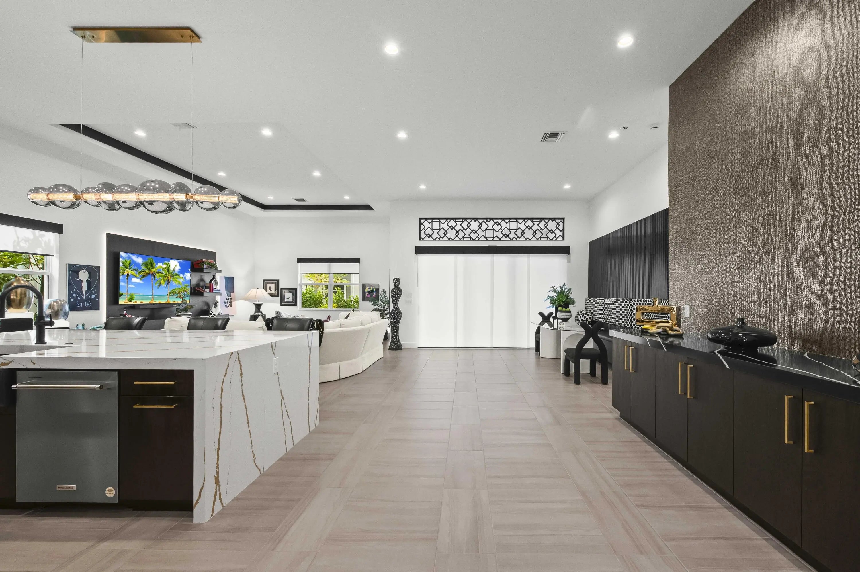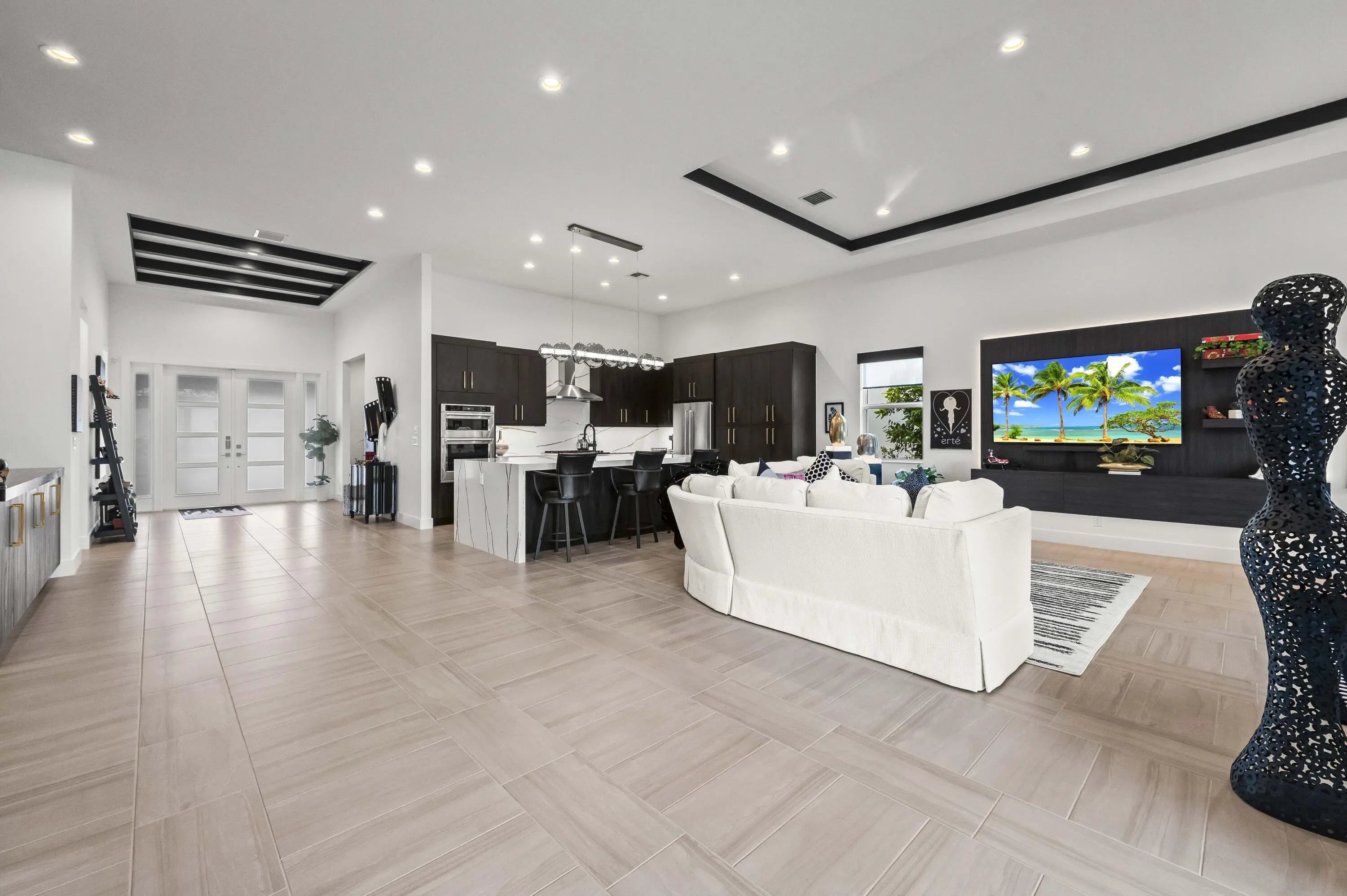 Experience the pinnacle of luxury living in this breathtaking residence, where upgraded double front doors welcome you into a world of sophisticated design and high-end finishes. The heart of the home is the expansive, extended great room, accentuated by striking ceiling beams, a custom built-in TV unit, and a beverage fridge that makes entertaining effortless. Culinary enthusiasts will adore the gourmet kitchen, showcasing a massive island with double waterfall edges and extra cabinetry, a farmhouse sink, and a chef-grade upgraded gas stove with a premium hood. An upgraded lighting package with numerous high hats illuminates the designer touches throughout, including unique feature walls and a chic designer banquette that adds flair to the dining space. Every room in this home has been thoughtfully curated for comfort and style. The dedicated den, which can easily be converted to a 4th bedroom, impresses with a custom-designed desk and wall unit, creating an inspiring workspace. Retreat to the primary suite, where relaxation awaits in a spa-inspired bathroom featuring extended ceramic tile and a luxurious freestanding oval tub. Attention to detail is evident in the customized closets and the premium window treatments found throughout the home, including custom plantation shutters, a unique transom window treatment, and motorized shades in the great room for ultimate convenience. Beyond the interior, the property offers exceptional functionality and curb appeal. The extended garage is a showstopper in itself, boasting a custom epoxy floor, electric car charger, overhead storage, and built-in shelving and cabinetry for superior organization. Step outside to enjoy the serene private lake view, enhanced by custom landscaping with professional front and backyard lighting that creates a magical ambiance at night. Located in a premier 55+ community with resort-style amenities, this home is a true masterpiece of modern design and convenience.