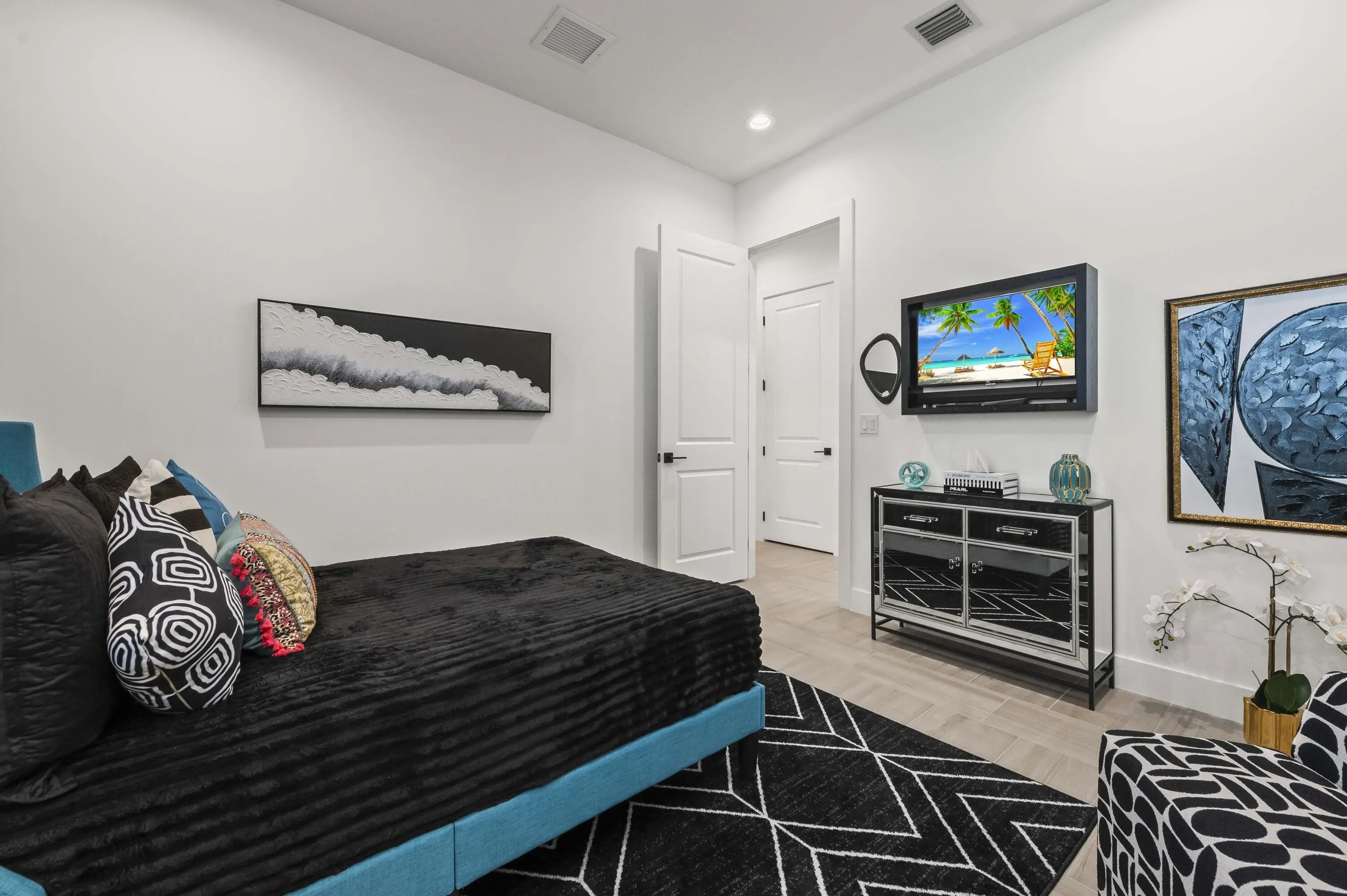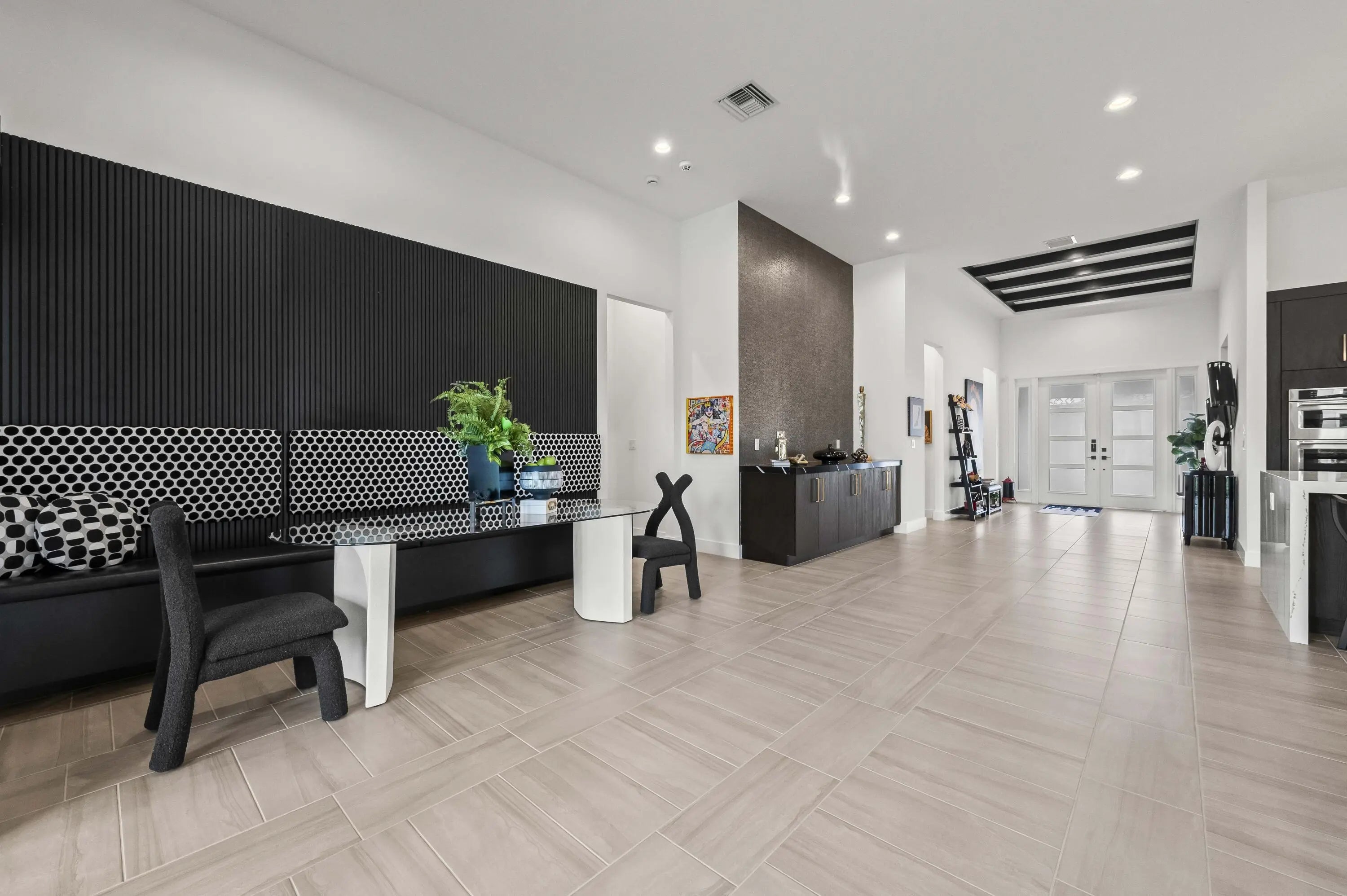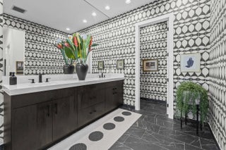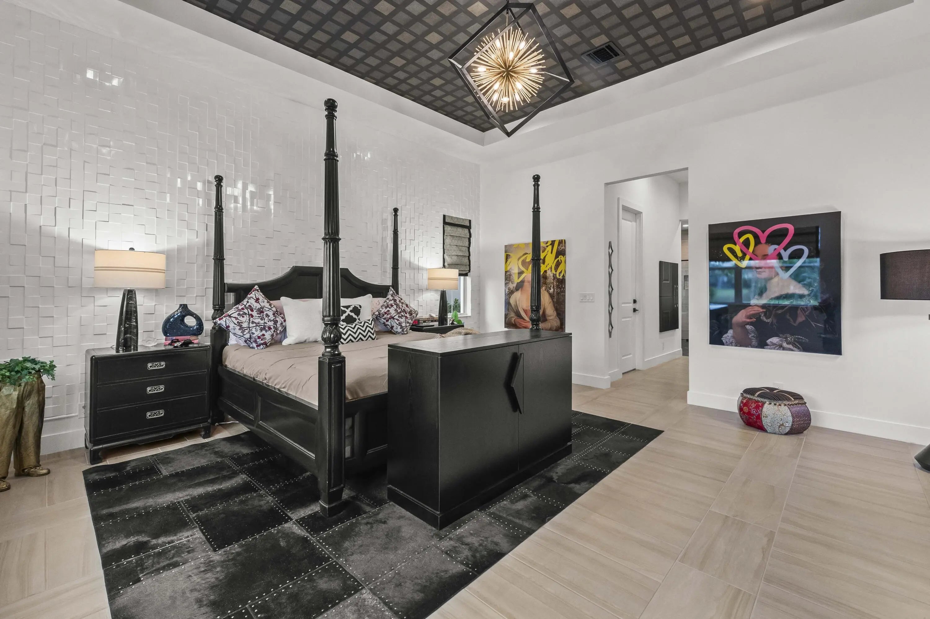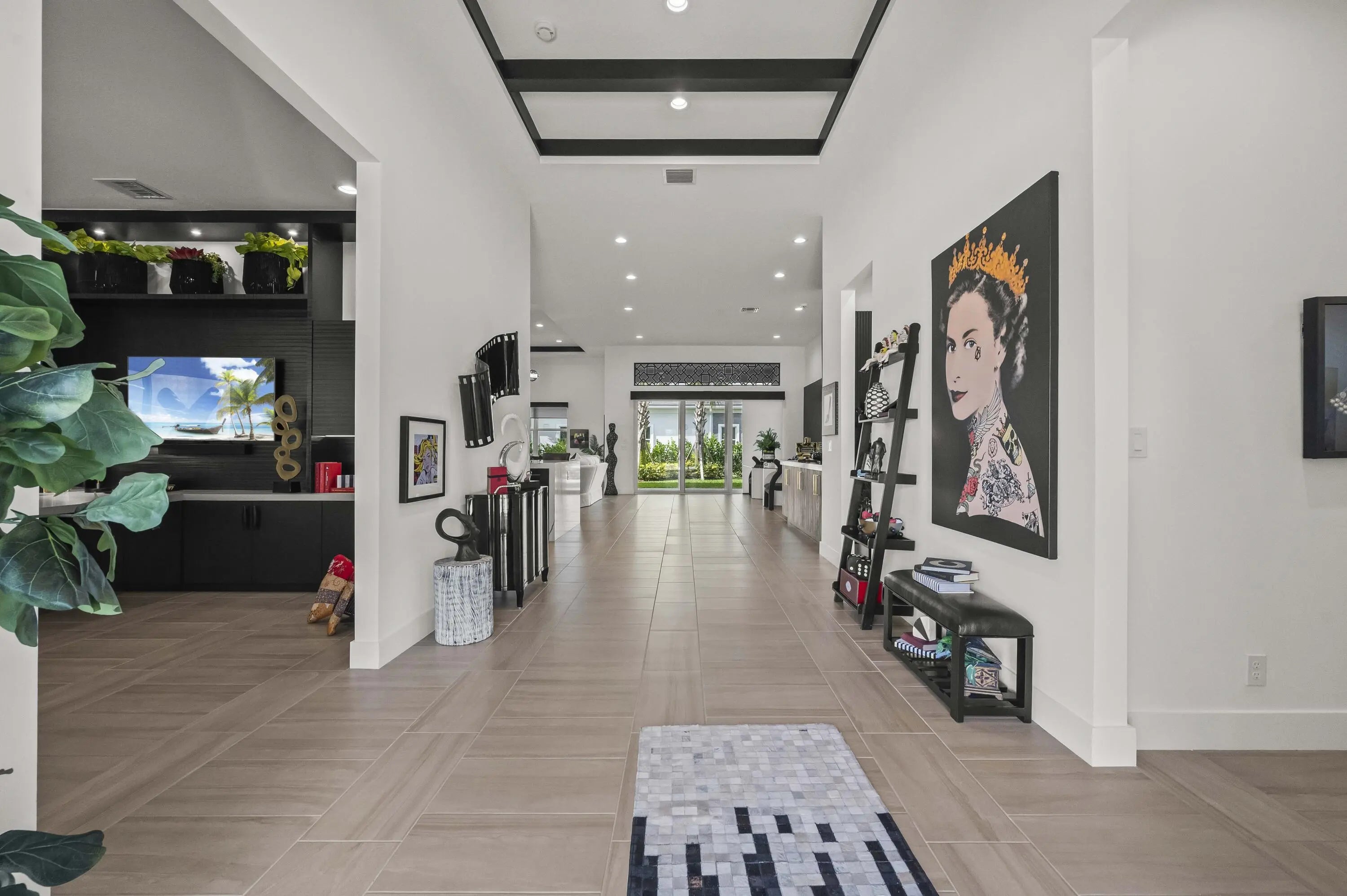 Experience the pinnacle of luxury living in this breathtaking residence, where upgraded double front doors welcome you into a world of sophisticated design and high-end finishes. The heart of the home is the expansive, extended great room, accentuated by striking ceiling beams, a custom built-in TV unit, and a beverage fridge that makes entertaining effortless. Culinary enthusiasts will adore the gourmet kitchen, showcasing a massive island with double waterfall edges and extra cabinetry, a farmhouse sink, and a chef-grade upgraded gas stove with a premium hood. An upgraded lighting package with numerous high hats illuminates the designer touches throughout, including unique feature walls and a chic designer banquette that adds flair to the dining space. Every room in this home has been thoughtfully curated for comfort and style. The dedicated den, which can easily be converted to a 4th bedroom, impresses with a custom-designed desk and wall unit, creating an inspiring workspace. Retreat to the primary suite, where relaxation awaits in a spa-inspired bathroom featuring extended ceramic tile and a luxurious freestanding oval tub. Attention to detail is evident in the customized closets and the premium window treatments found throughout the home, including custom plantation shutters, a unique transom window treatment, and motorized shades in the great room for ultimate convenience. Beyond the interior, the property offers exceptional functionality and curb appeal. The extended garage is a showstopper in itself, boasting a custom epoxy floor, electric car charger, overhead storage, and built-in shelving and cabinetry for superior organization. Step outside to enjoy the serene private lake view, enhanced by custom landscaping with professional front and backyard lighting that creates a magical ambiance at night. Located in a premier 55+ community with resort-style amenities, this home is a true masterpiece of modern design and convenience.