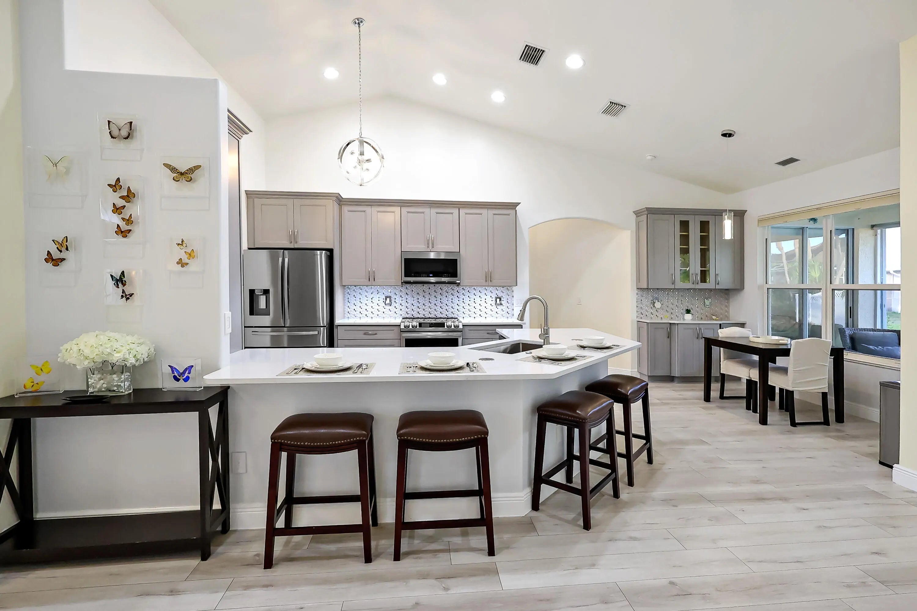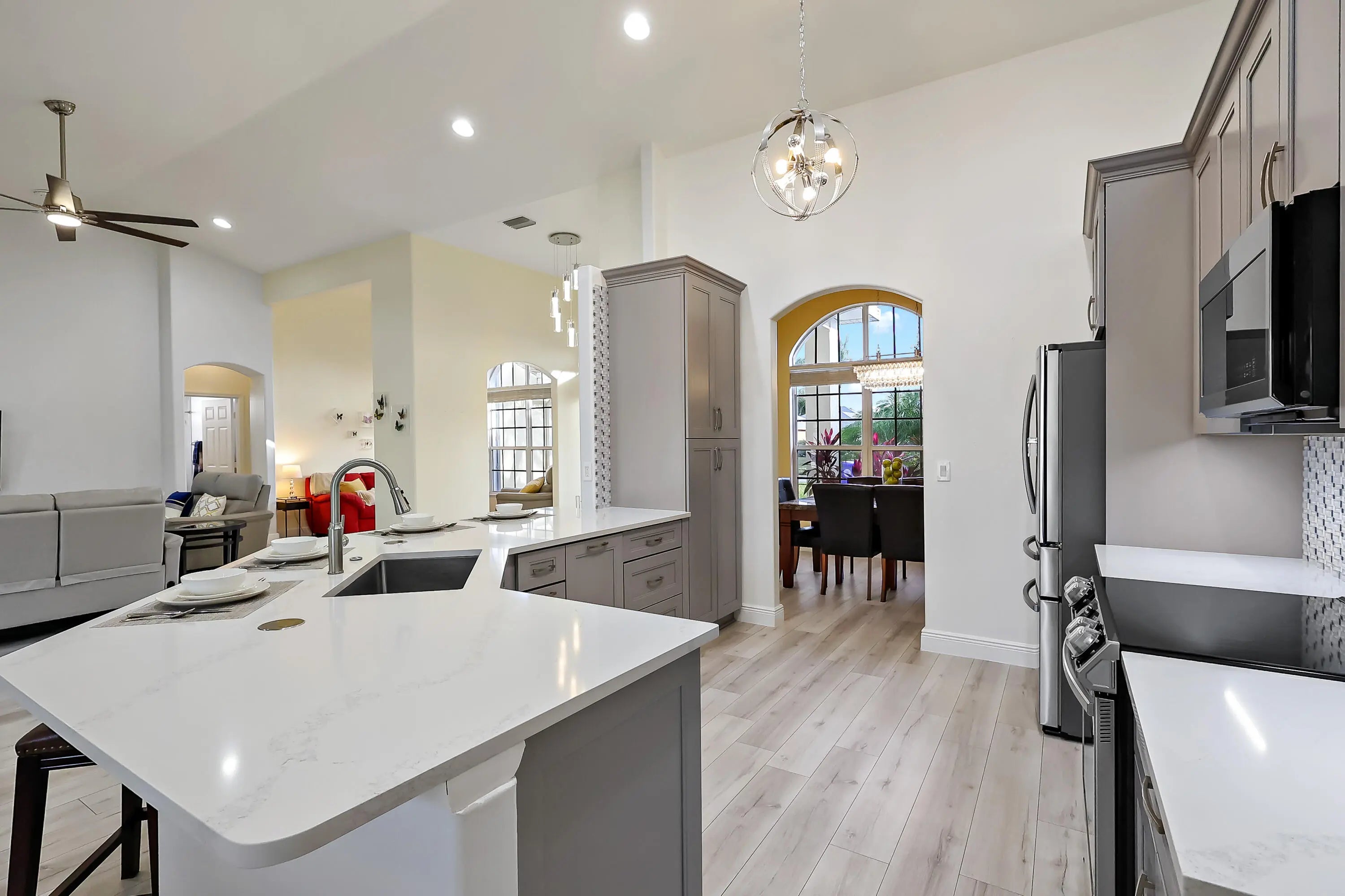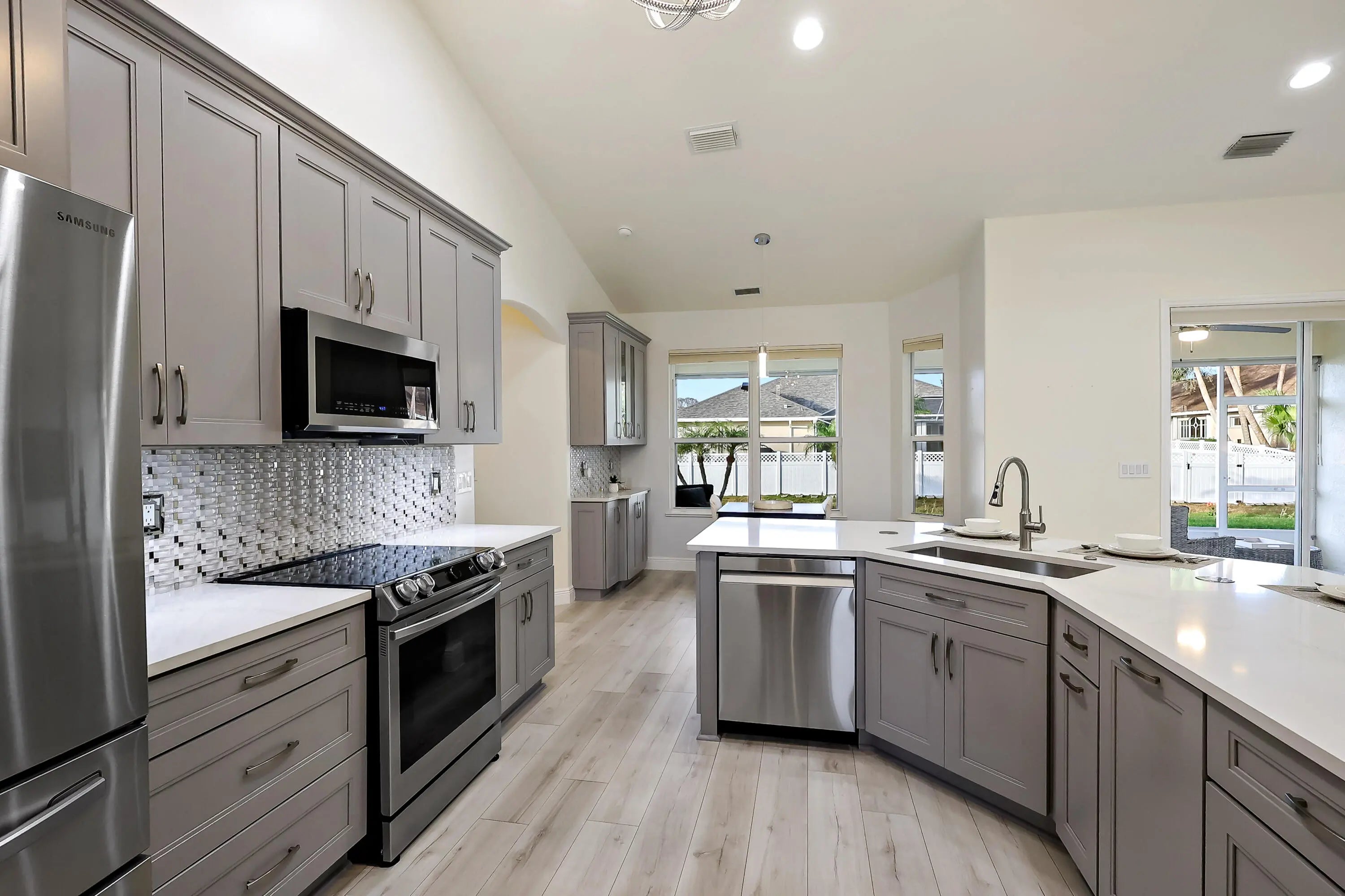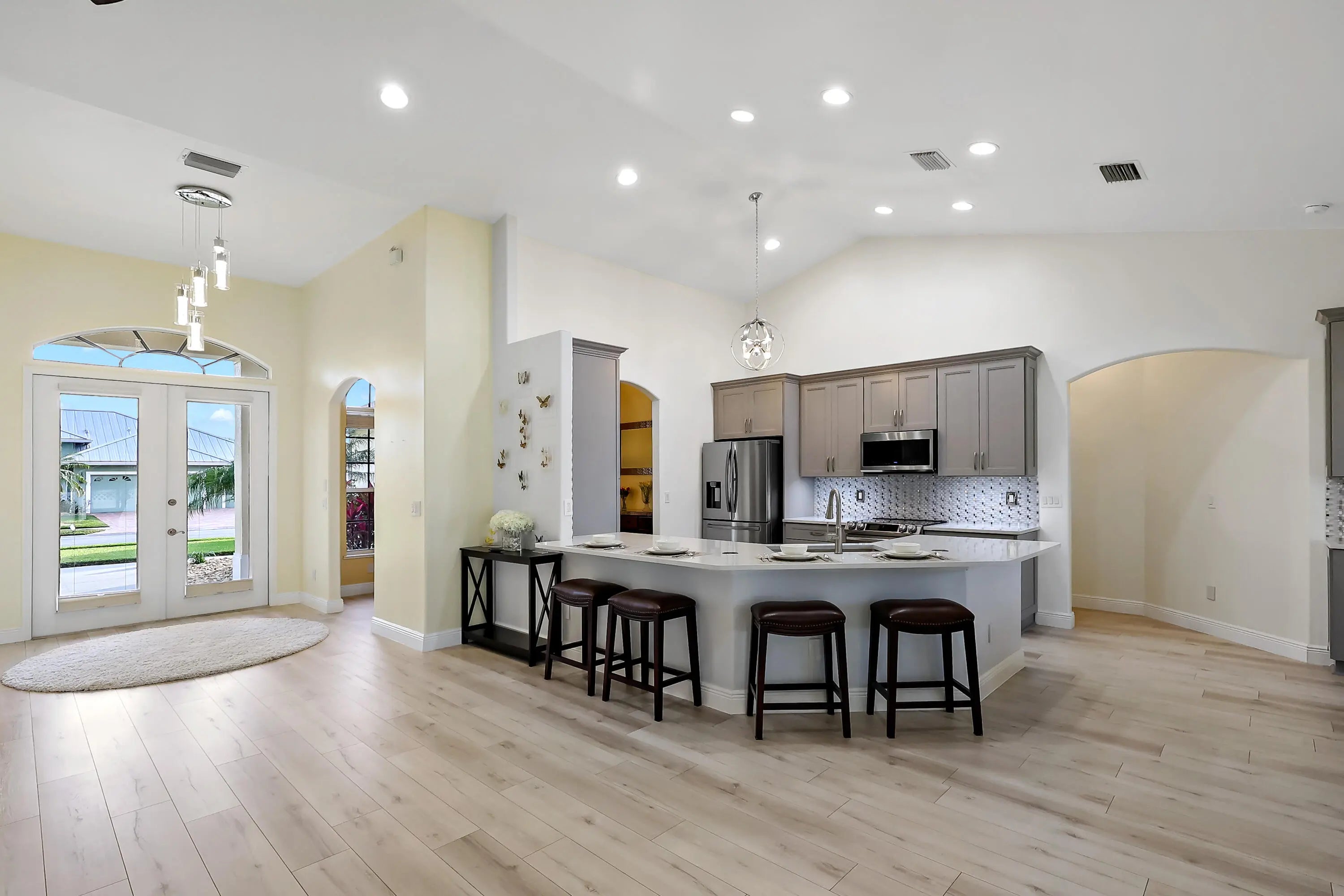 Tucked on a quiet cul-de-sac in the gated Oak Chase community in Vero Beach, this bright, modern home shines w/an open floor plan, soaring ceilings, & abundant natural light. The beautifully updated kitchen--featuring quartz counters, soft-close cabinetry, & stainless-steel appliances--will inspire any home chef. Double split 4BR/3BA layout offers space & privacy. Unwind in the spacious primary suite w/walk-out to lanai, walk-in closet, & spa-style wet room w/tandem panel showers. Enjoy year-round entertaining on the screened lanai. Extras: 2-CG w/epoxy floors & screen door, whole-home water purification, accordion shutters, & pre-wired for security system & portable generator. Centrally located.