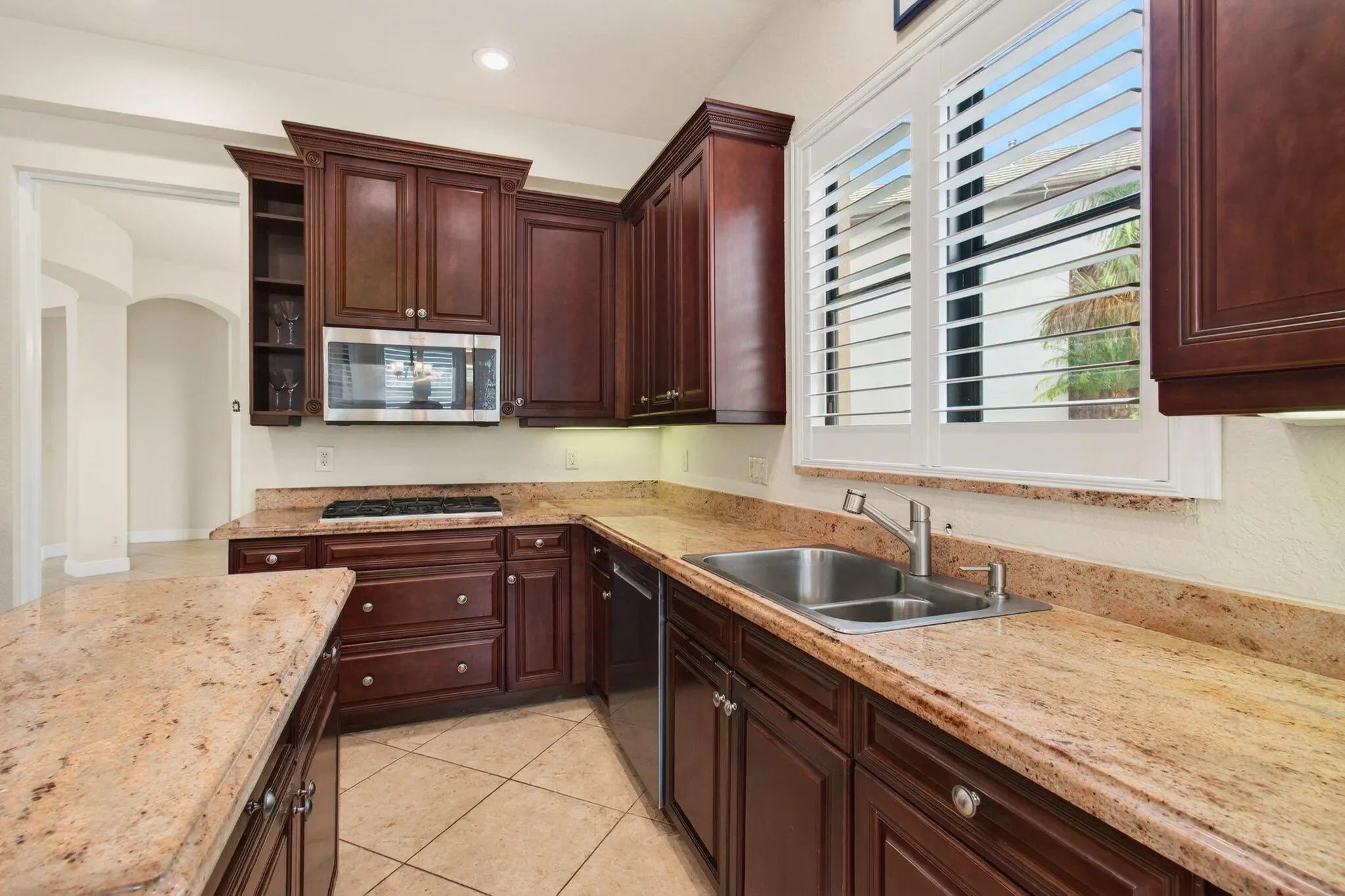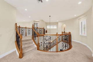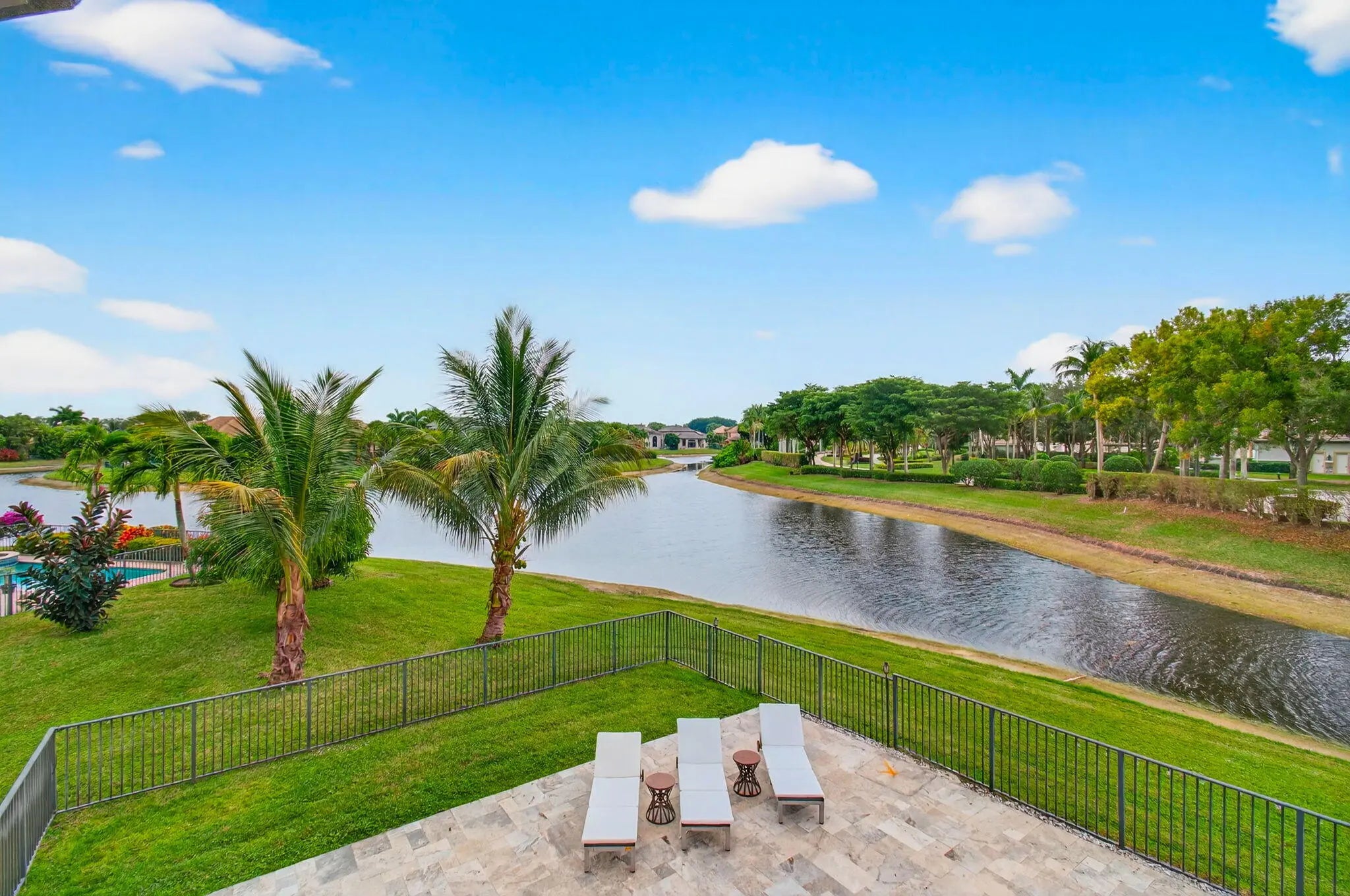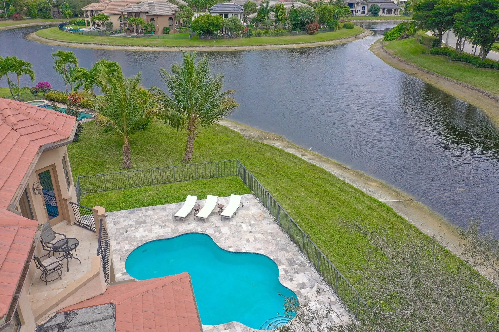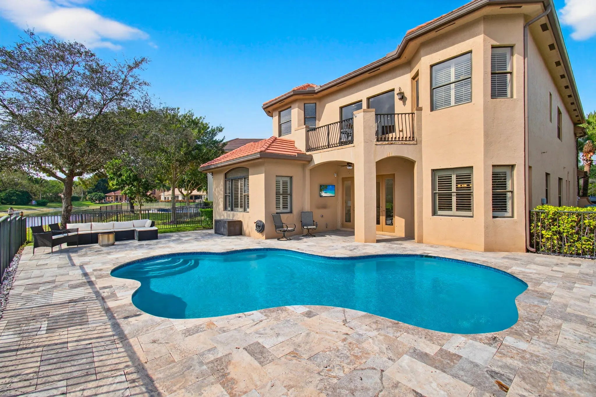 Step into an AWE-INSPIRING fenced backyard sanctuary on a quiet cul-de-sac, featuring a freeform pool, new extensive marble decking, tranquil meandering lake views, and expansive green space designed for both entertaining and everyday enjoyment. Inside, a grand rotunda entry with an upgraded staircase sets the tone. The bright front living room, currently showcasing a baby grand is ideal for gatherings, while the soaring family room displays high ceilings and transom windows overlooking the outdoor space. The kitchen offers natural gas cooking, wood cabinetry, granite countertops, a center island, stainless steel appliances with double ovens, and a breakfast area with stunning backyard views. The first-floor primary suite features luxury vinyl plank flooring, custom walk-in closets, and serene water views, complemented by a spa-like bath with dark wood cabinetry, granite countertops, and a large, jetted shower. Upstairs are three en-suite guest bedrooms, including one with a private lakeview balcony and another oversized suite ideal for a bonus or craft room, plus a versatile loft. Additional highlights include new interior paint, updated lighting, plantation shutters, upgraded flooring, attic storage, enhanced landscaping, new extended fencing, and a newly remodeled pool, gas range, dryer, and outdoor grill area. Versailles is a gated community offering a resort-style pool, kiddie pool, hot tub, playground, tennis, basketball, & fitness center. It is conveniently located near shopping, equestrian venues, A-rated schools, and dining. HOA includes lawn care front and back, hedge trimming, irrigation, cable package, high-speed internet, and security monitoring. You do not want to miss this one!