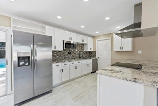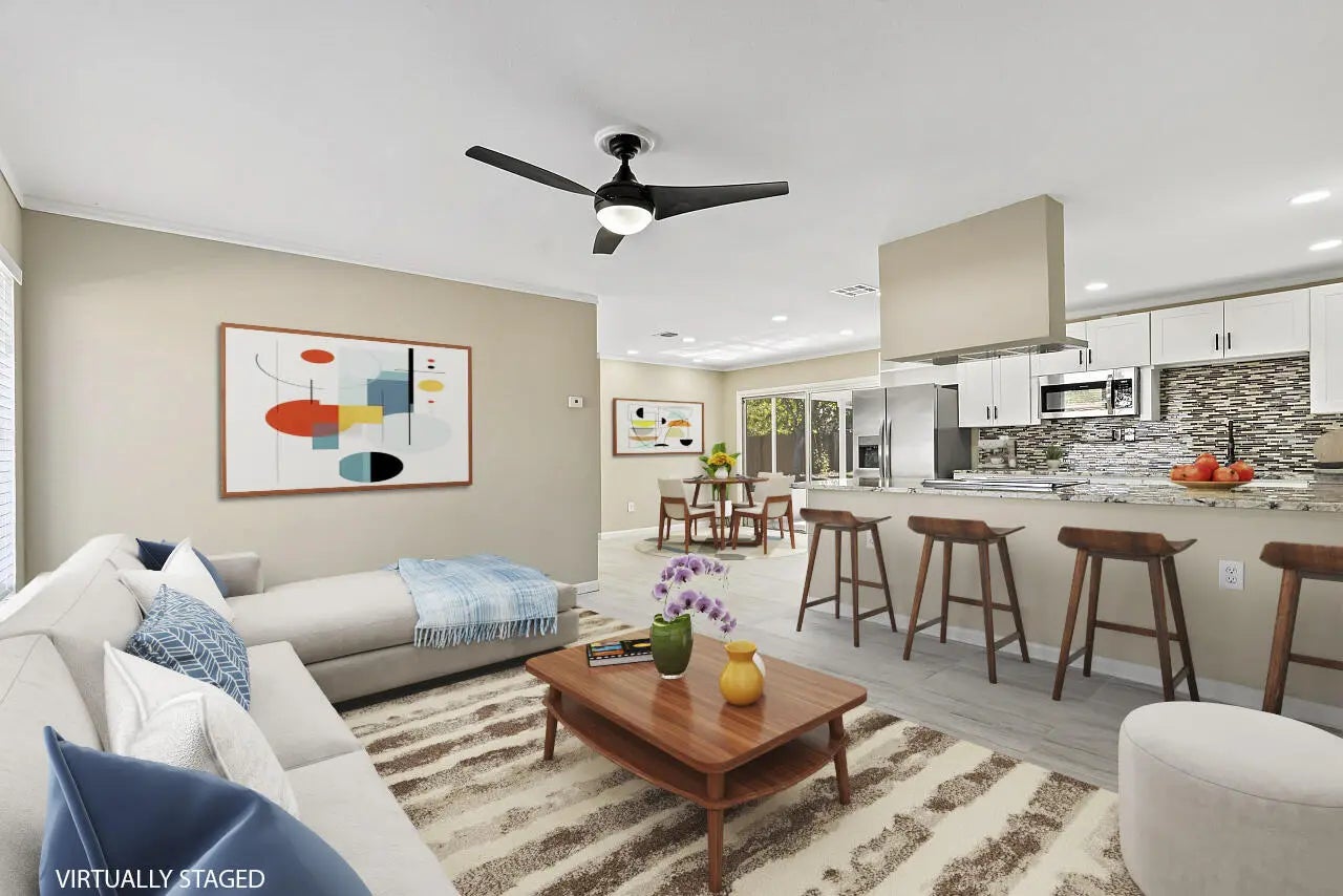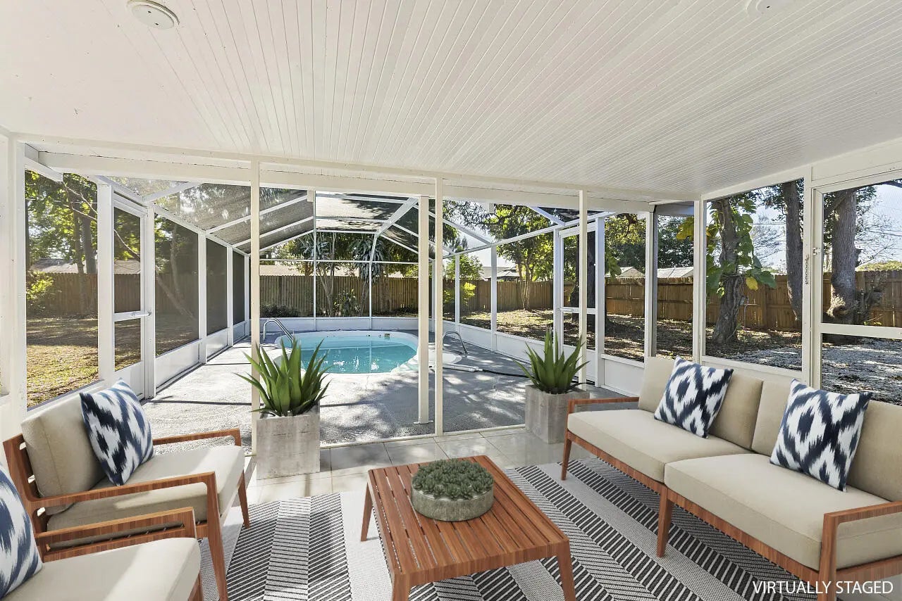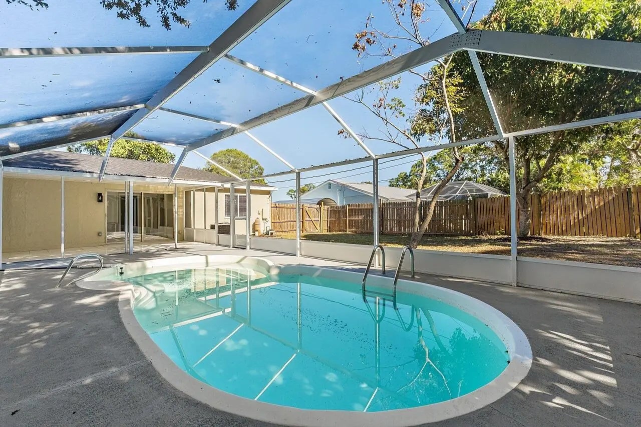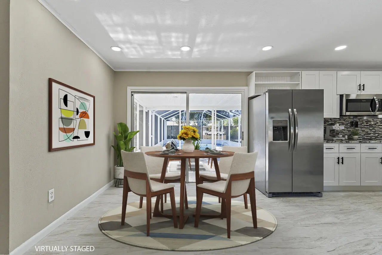 This beautiful pool home is all buttoned up & ready for you! As you enter you'll notice the oversized tile flooring, fresh paint, new ceiling fans & lighting. Next, your eyes will notice the gorgeous kitchen w/ exotic granite, white shaker cabinetry & SS appliances, including a vent hood. Off the dining area you'll find the covered & screened patio w/ tile flooring overlooking the screened private pool in the fully fenced backyard. Both bedrooms have fresh laminate flooring and new baseboards and the shared bathroom is complete with a tub/shower combo. 2024 Roof, 2021 Water Heater, 2019 AC.