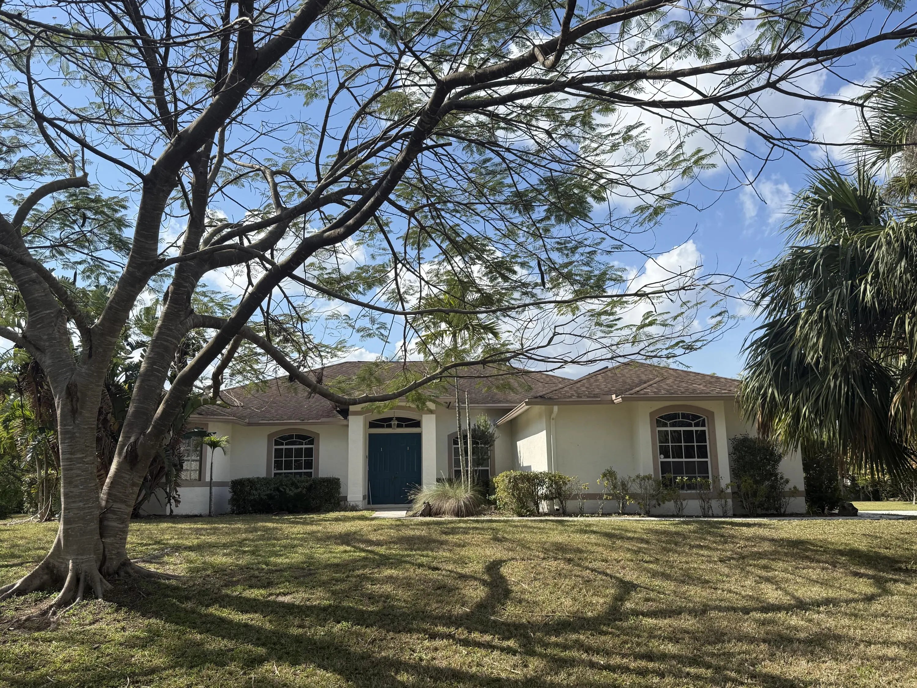 Highly desired Jupiter Farms CBS house with 5 bedrooms and 4 full baths, built in 2006. Private, fully cleared and fenced in square 1.5 acre lot. Dry, with no pond. Relax and enjoy year round the solar heated private salt pool. NO HOA, NO RESTRICTIONS. Bring your animals. Home offers high ceilings in bedrooms and vaulted ceilings in living and kitchen areas. Kitchen with granite counter tops and stainless steel appliance package. Home offers additional guest en suite. Fourth bathroom completely updated and is also a cabana bath.