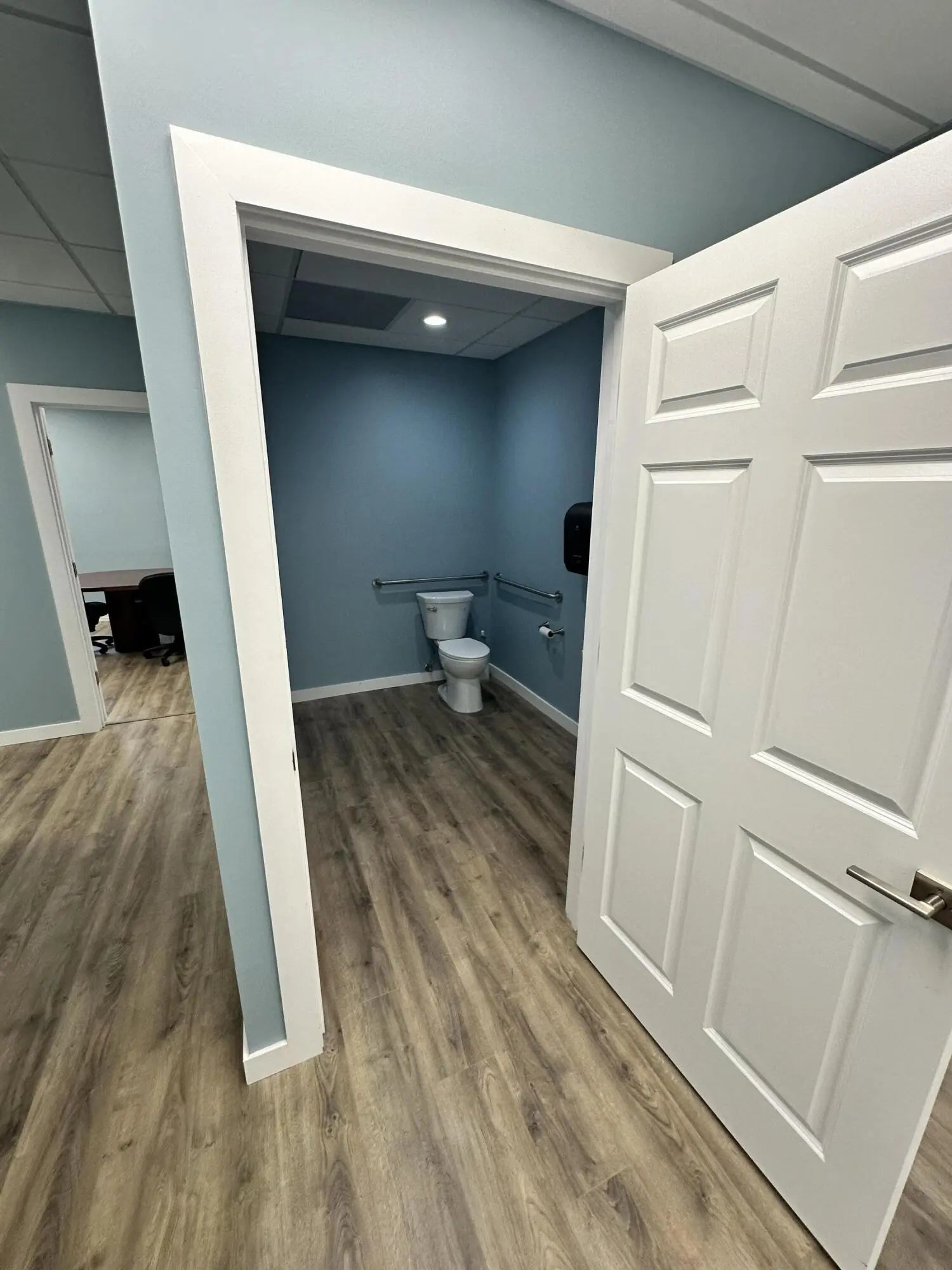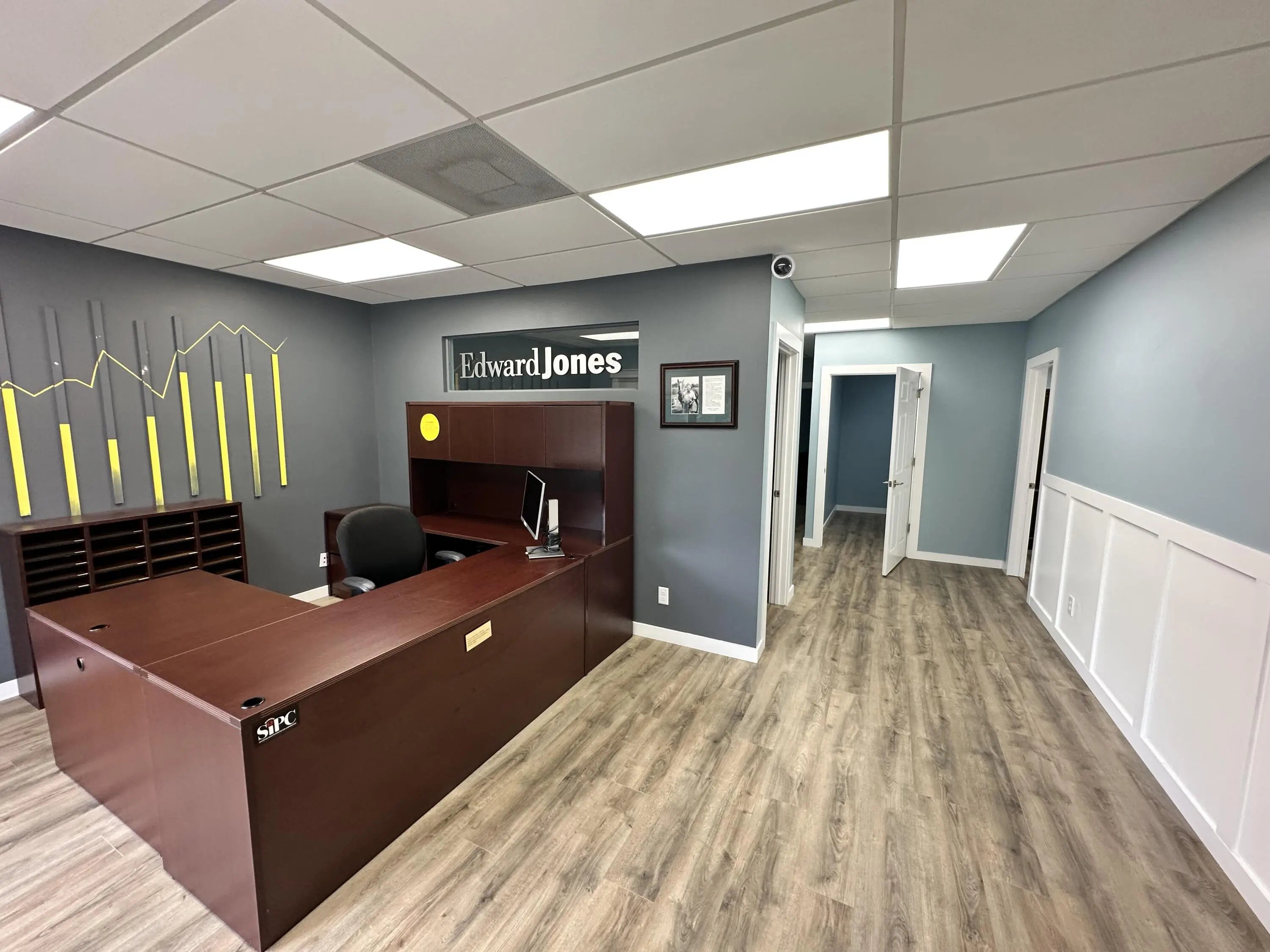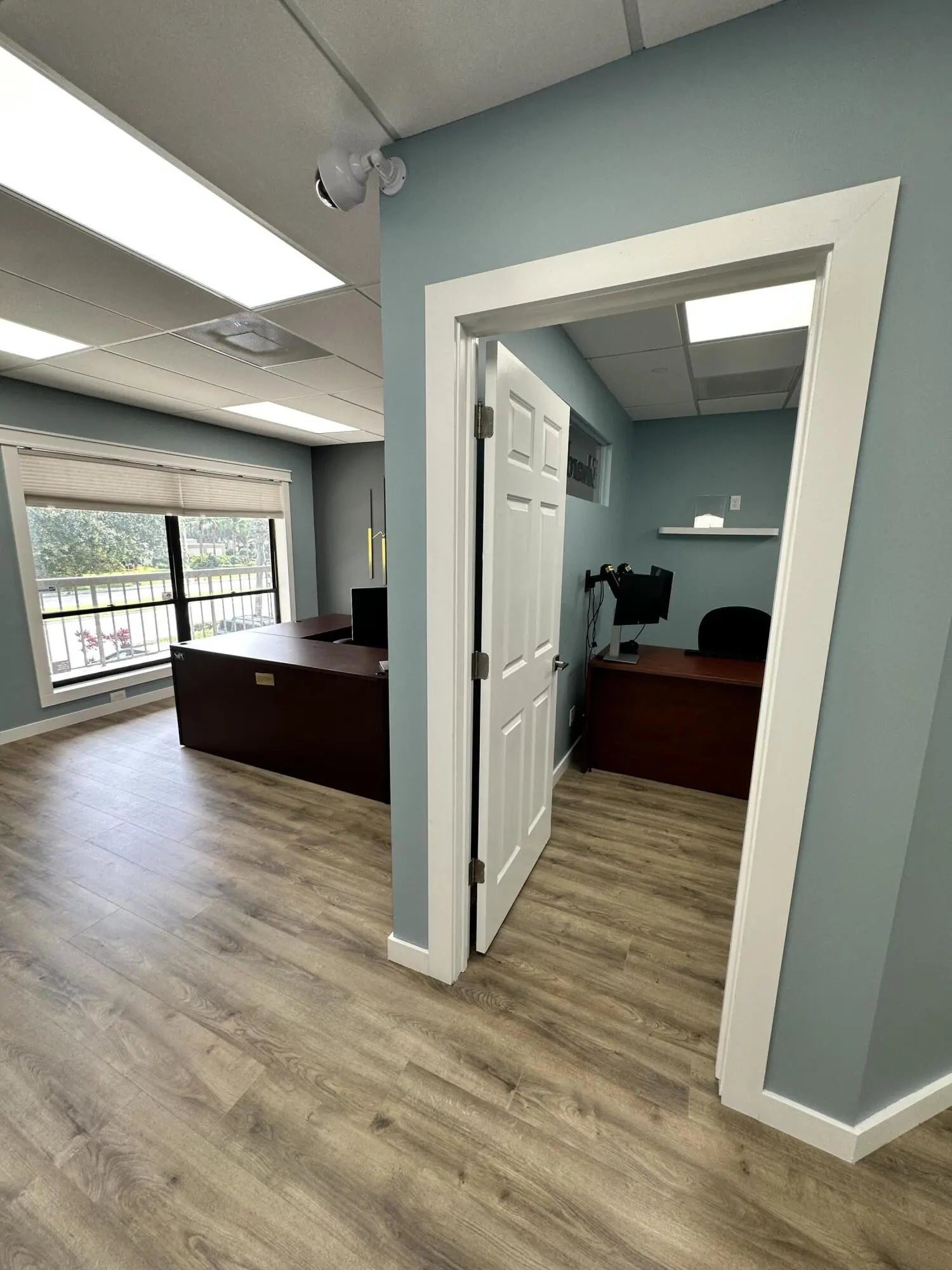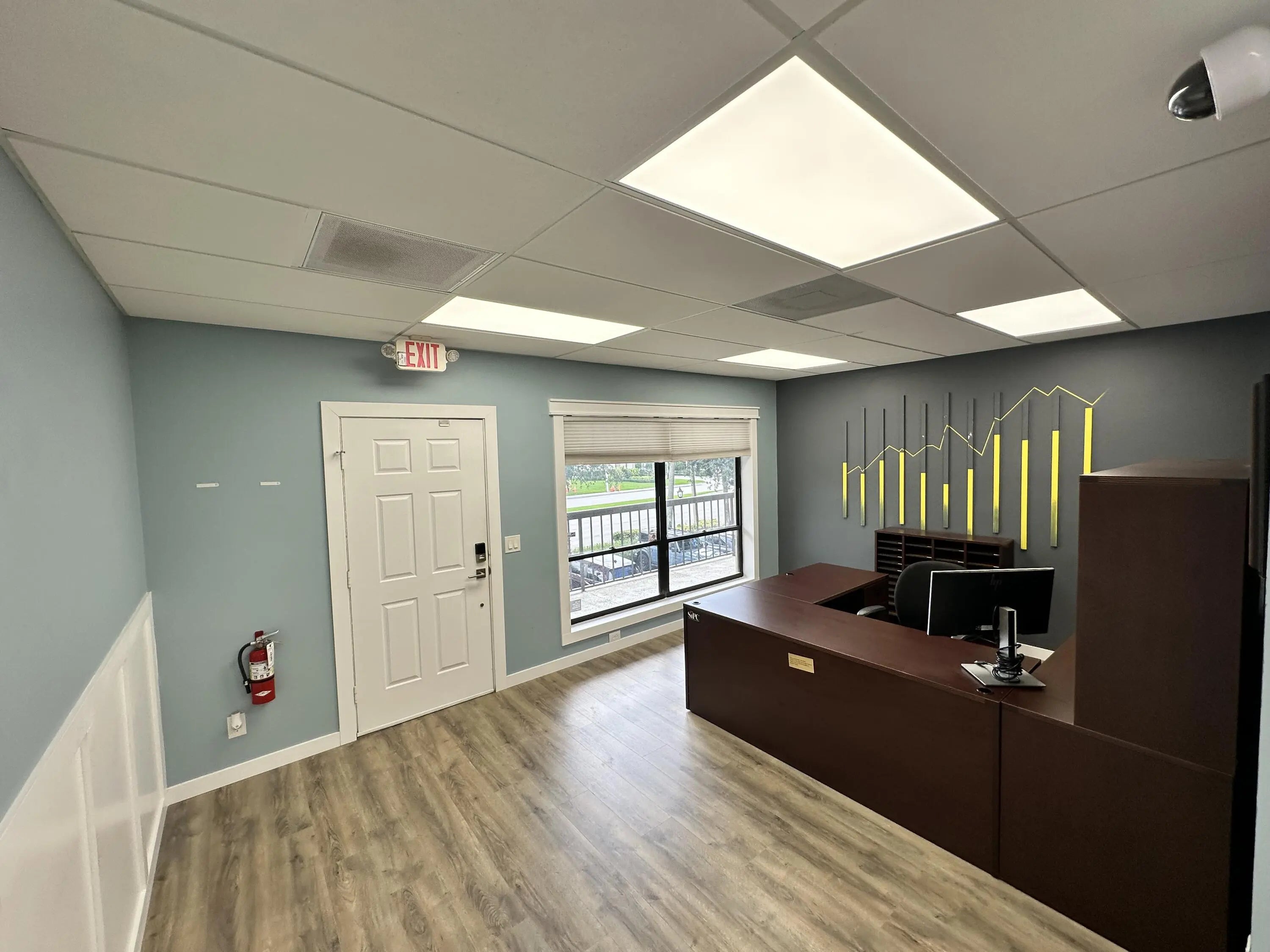 Renovated 2nd floor office unit with canal view offering reception area, two offices, breakroom and bathroom.