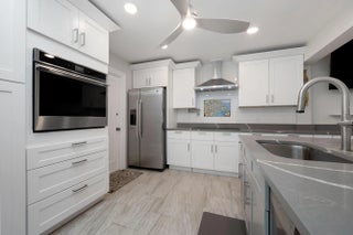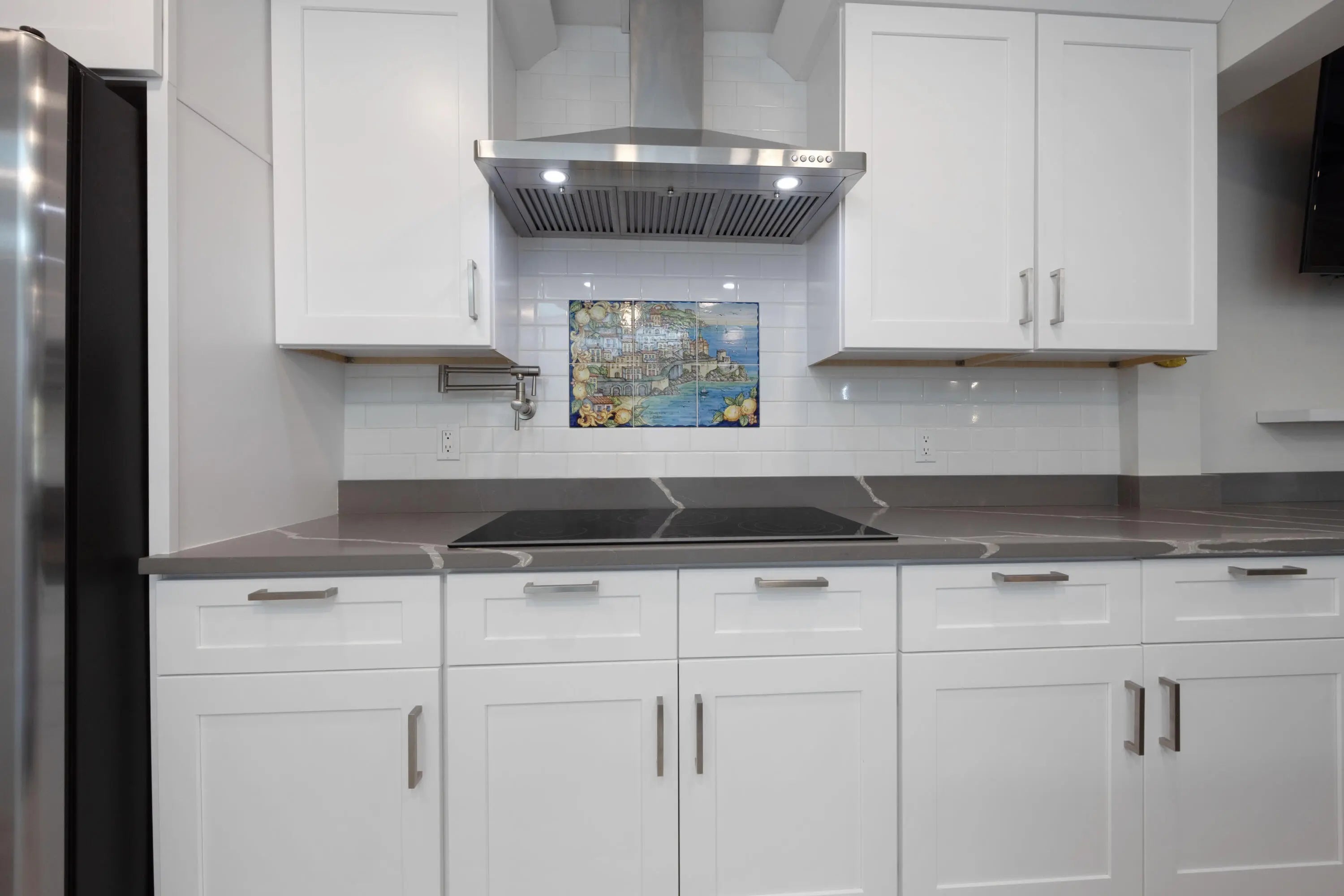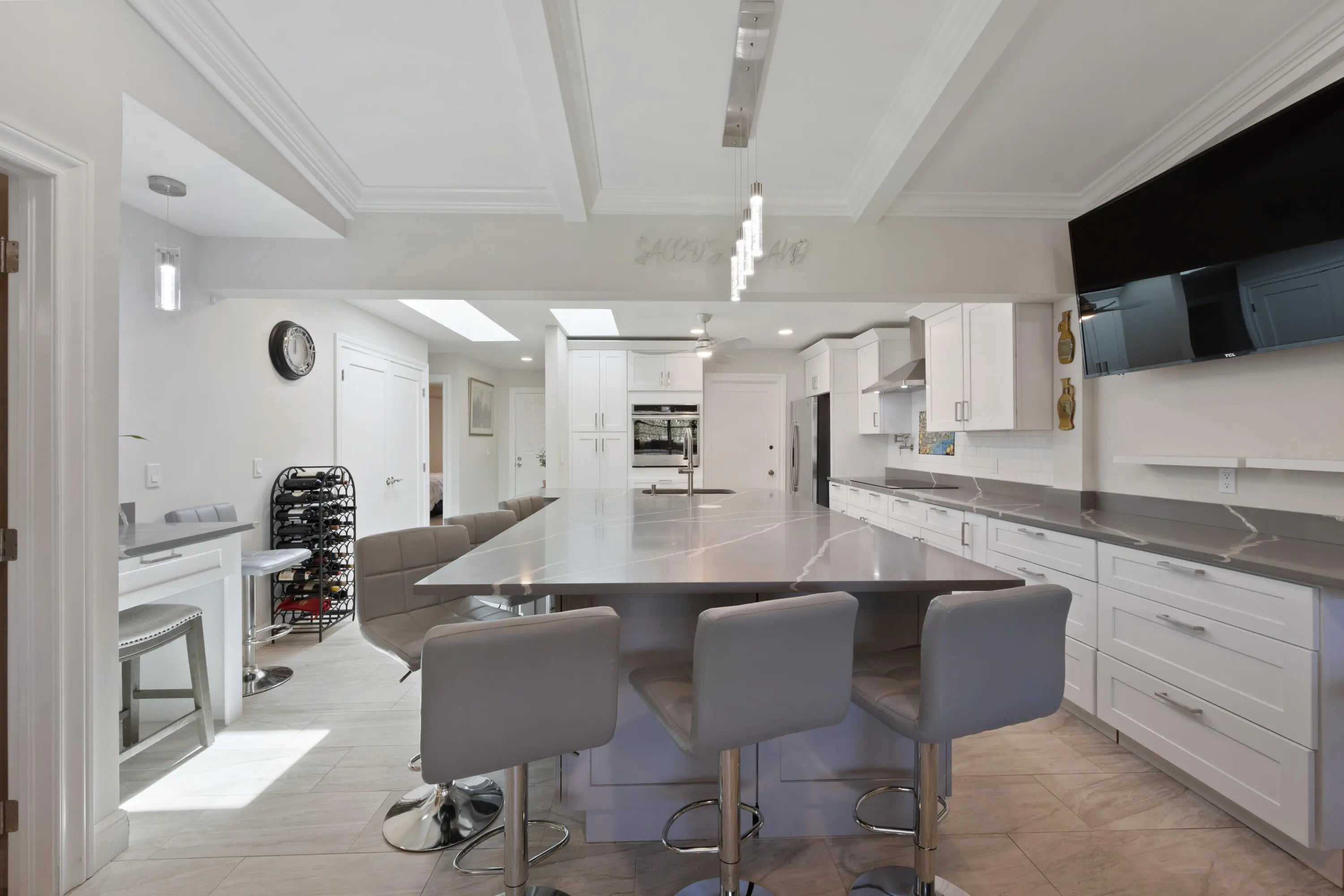 Exquisitely reimagined villa in the boutique community of Ridge Pointe Woods Villas! This open-concept residence showcases 12'' x 24'' porcelain tile throughout & a custom-designed chef's kitchen anchored by a 10' x 5' quartz island w/seating for 7, seamless slab finish, pop-up electrical outlet, soft-close cabinetry, and extensive additional storage. Kitchen additionally features a pot filler at the cooktop, stainless steel appliances, a smart wall oven with mobile connectivity, and a custom hood featuring hand-selected authentic Amalfi Coast tile. Living area is highlighted by elegant custom ceiling beams with crown molding, a smooth refinished ceiling, and a curated lighting including recessed and pendant fixtures, plus upgraded outlets and switches. Guest bathroom has been fully redesigned with floor-to-ceiling porcelain tile, offering a spa-like experience. Primary suite features a luxurious bath with a walk-in shower, multiple shower heads, bench seating, built-in shelving, dual vanities, and a private water closet. Throughout the home are shaker-style interior doors with substantial 3.5" casing and 5.5" baseboards, ceiling fans, and skylights that flood the space with natural light. Flex/Den room provides the ideal space for a home office, studio, or additional living area and opens to a private 12' x 18' paver patio with no rear neighbors. Ridge Pointe Woods Villas is a boutique community of approximately 100 villas located in east Boynton Beach, just minutes from beaches, shopping, dining, major roadways, and medical facilities. The HOA provides exceptional value, covering cable, internet, landscaping, roof maintenance, building insurance, water, sewer, and recreational amenities. Roofs were replaced in 2019. HVAC 2025.
