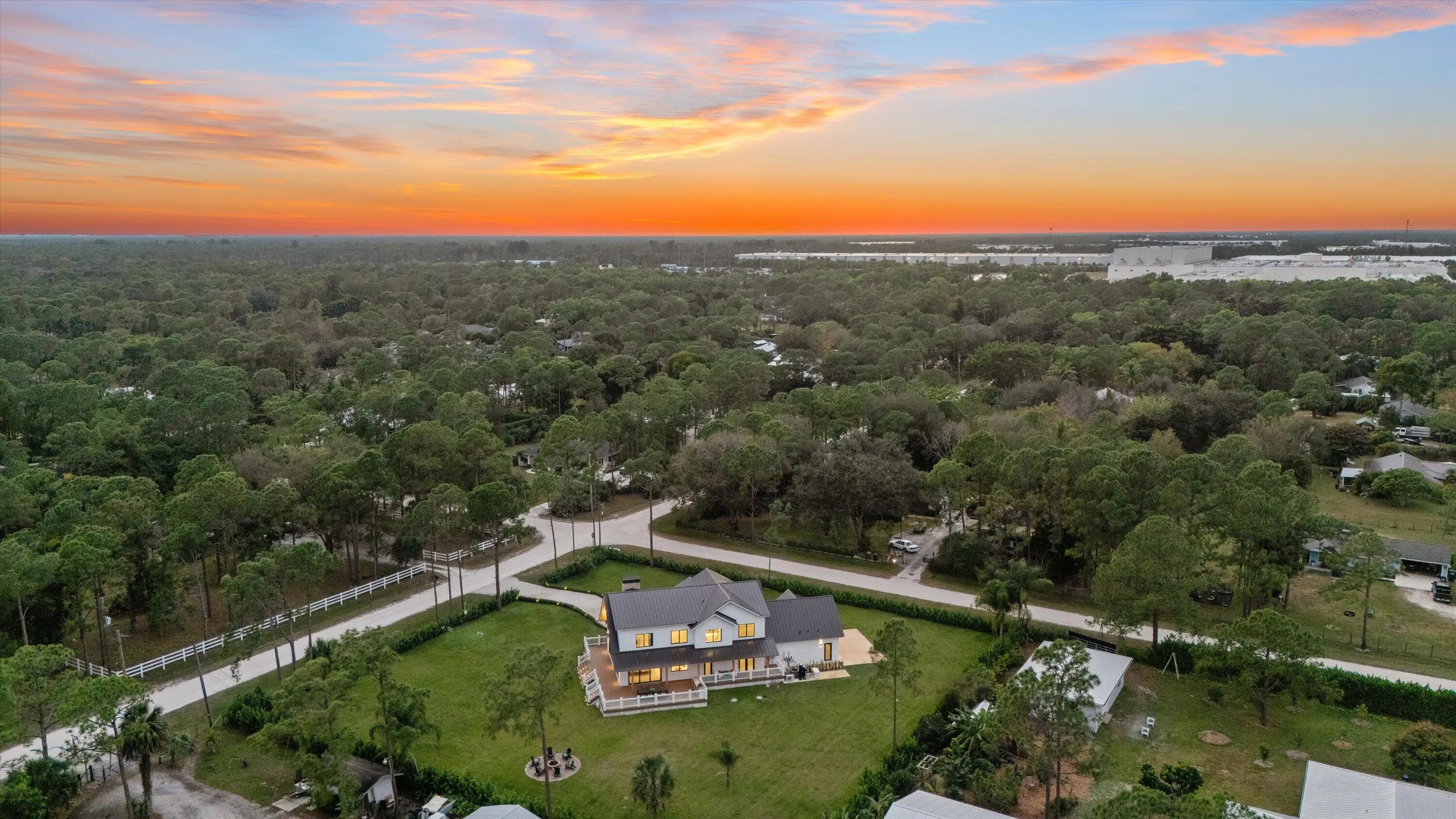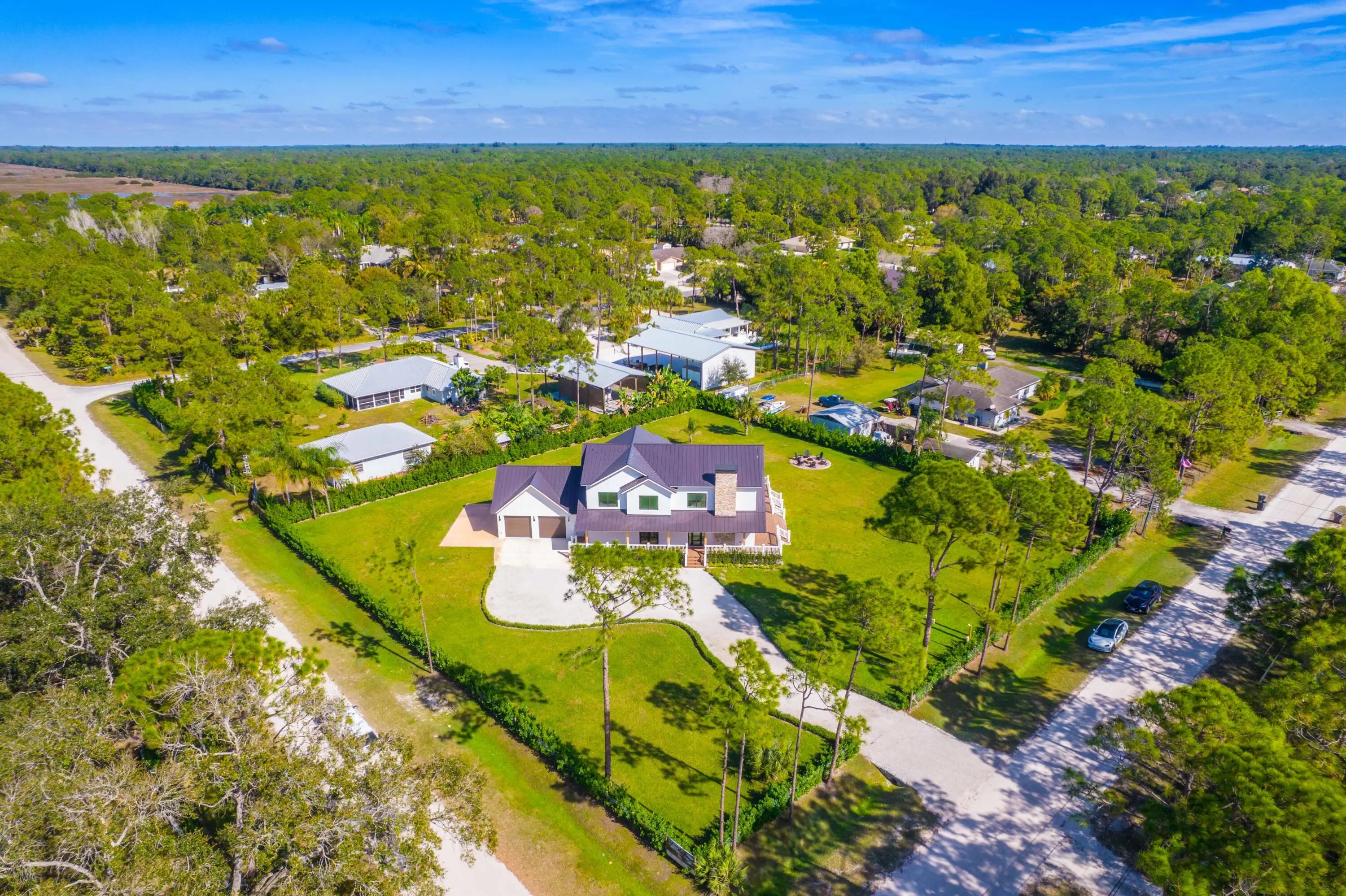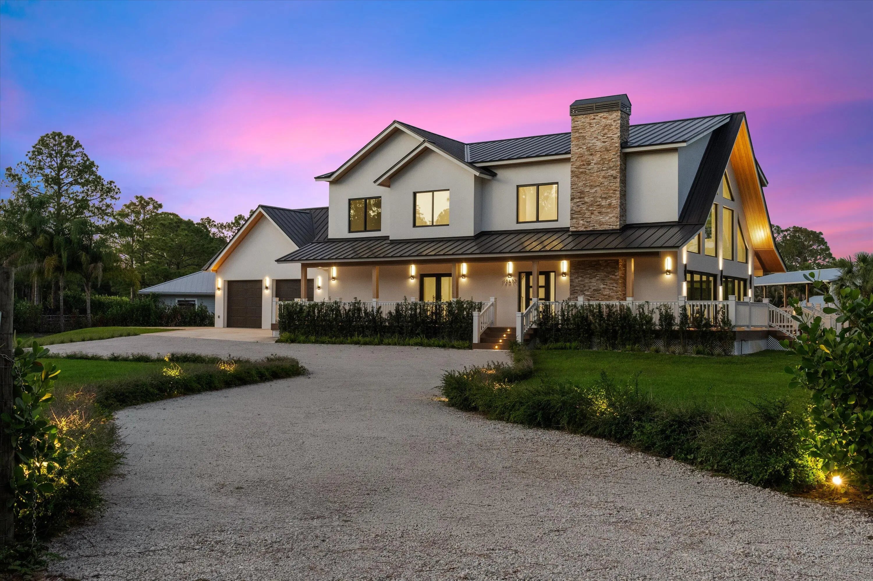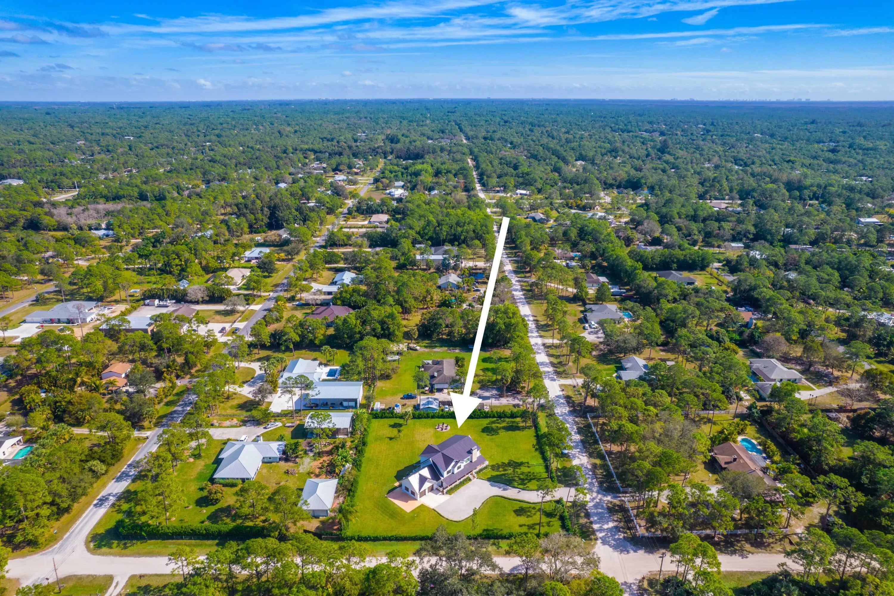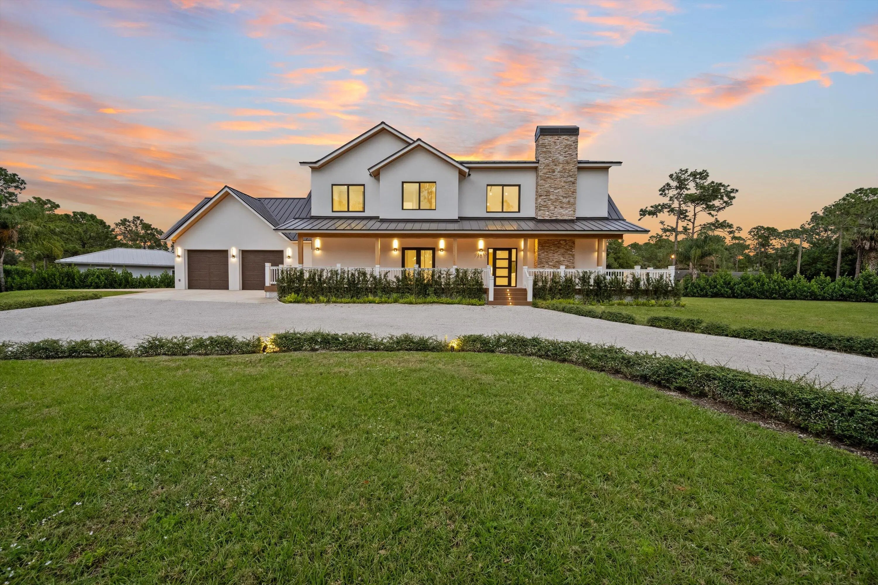 This exceptional new construction estate offers a refined blend of modern luxury and farmhouse-inspired design with an expansive and luxurious Primary Suite overlooking the beautifully landscaped 1.31- Acre lot with no HOA in the heart of Jupiter Farms. Designed by award-winning 'Wandrian Studios' in collaboration with the owner, this two-story concrete block residence was thoughtfully designed with custom features reflecting superior craftsmanship and high-quality finishes throughout. Extending to almost 3600 square feet, the home delivers elevated design, durability, and a seamless indoor-outdoor lifestyle. The interior features four bedrooms, four full bathrooms, and a versatile loft. Monolithic, Bellevue porcelain tile flows throughout the home, creating a sleek & cohesive aesthetic. The Italian-inspired chef's kitchen is outfitted with premium Bosch appliances and opens to a dramatic living space anchored by a striking two-story A-frame window that floods the home with natural light and creates a strong connection to the outdoors. Designed for both everyday living and entertaining, the home includes smart lighting by 'Lutron Caseta', dual laundry area, and a climate-controlled garage converted into a playroom with a bar, kegerator, and side-by-side refrigerator. Outdoors, an expansive 1,800-square-foot wraparound covered porch with cypress wood accents and a summer kitchen provides the ideal setting for year-round entertaining. The builder offers customization for a future pool and outdoor living area, allowing buyers to tailor the design to their dream vision. Built for longevity and peace of mind, the home features elevated slab construction, hurricane-impact windows and doors, a titanium roof with double wrap trusses, spray-in insulation for energy efficiency, and a 26kW 'Generac' standby generator with 400- amp service and a 1,000-gallon underground propane tank. An additional 18x34 concrete slab offers space for a detached shop or RV, boat, or recreational vehicle parking. Set in one of Palm Beach County's most desirable locations in Jupiter Farms, this property is only 10 minutes from premier shopping, dining, and leading medical facilities, with seamless access to I-95, the Florida Turnpike, and major airports, delivering refined convenience without sacrificing privacy or tranquility.