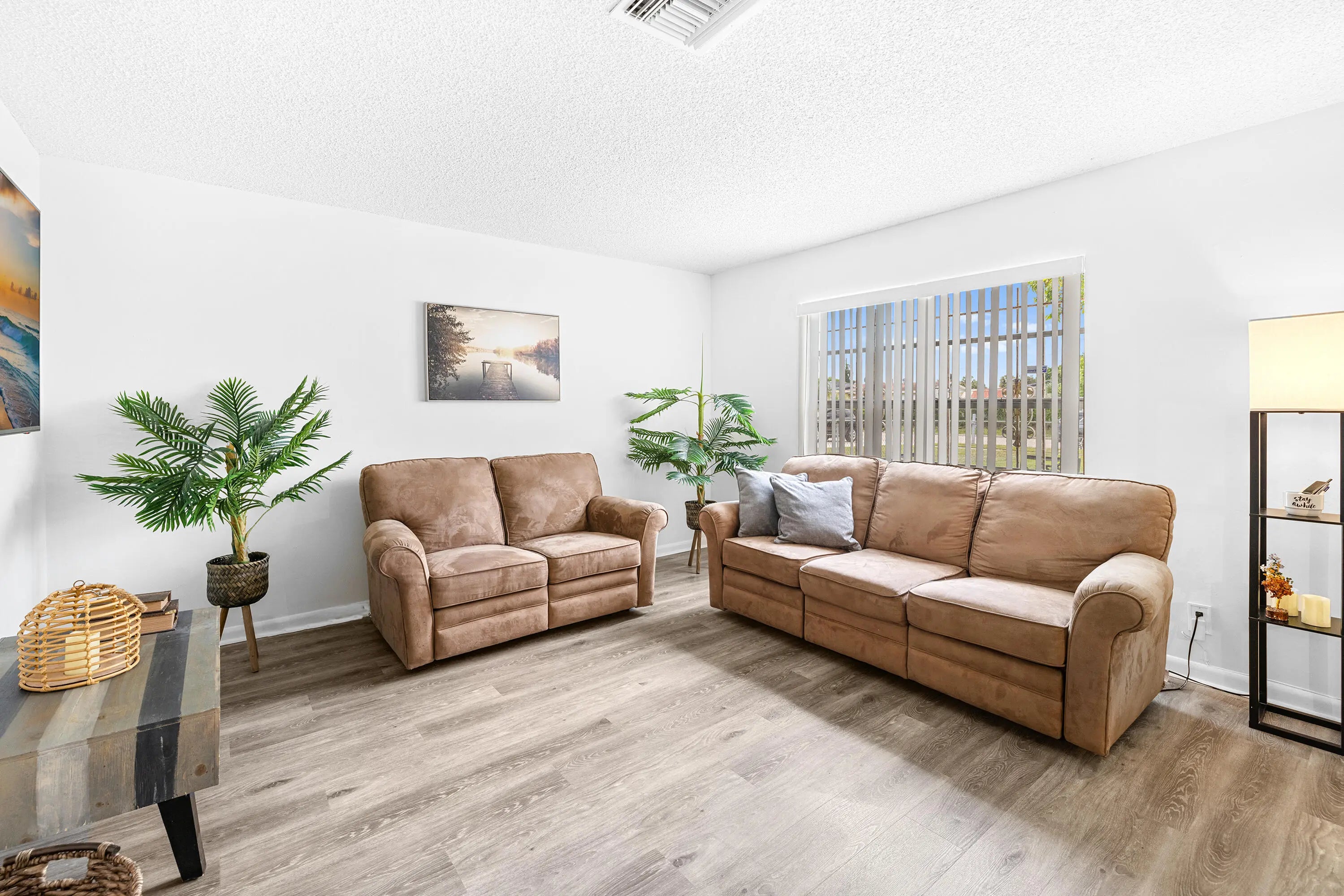 Spacious 3 bedroom plus oversized DEN, 2 bathroom, CBS home on a private 0.18 acre lot, NO HOA! There is BRAND NEW ROOF (2026), new LVP flooring in the living room and kitchen (2025), and tile flooring in bedrooms and den. The kitchen was renovated and it is equipped with granite counter tops, low profile microwave, gas stove and shaker cabinets. Notable features include new fire rated impact front and side doors (2025), painted exterior (2024), newer electrical panel (2022), no popcorn, newer toilets and vanities, and tankless water heater (2023). Washer and dryer are inside. Head out to enjoy a fenced-in backyard with plenty of room for a pool. The home is equipped with an alarm and security cameras. The garage was converted into living space. The home is just a short ride away from gorgeous Singer Island beach, shopping plazas, Palm Beach Gardens downtown and midtown, and fun downtown West Palm Beach. It is approximately 15 minutes from PBI airport. All measurements are approximate. Take a look at the 3D virtual walk through.
