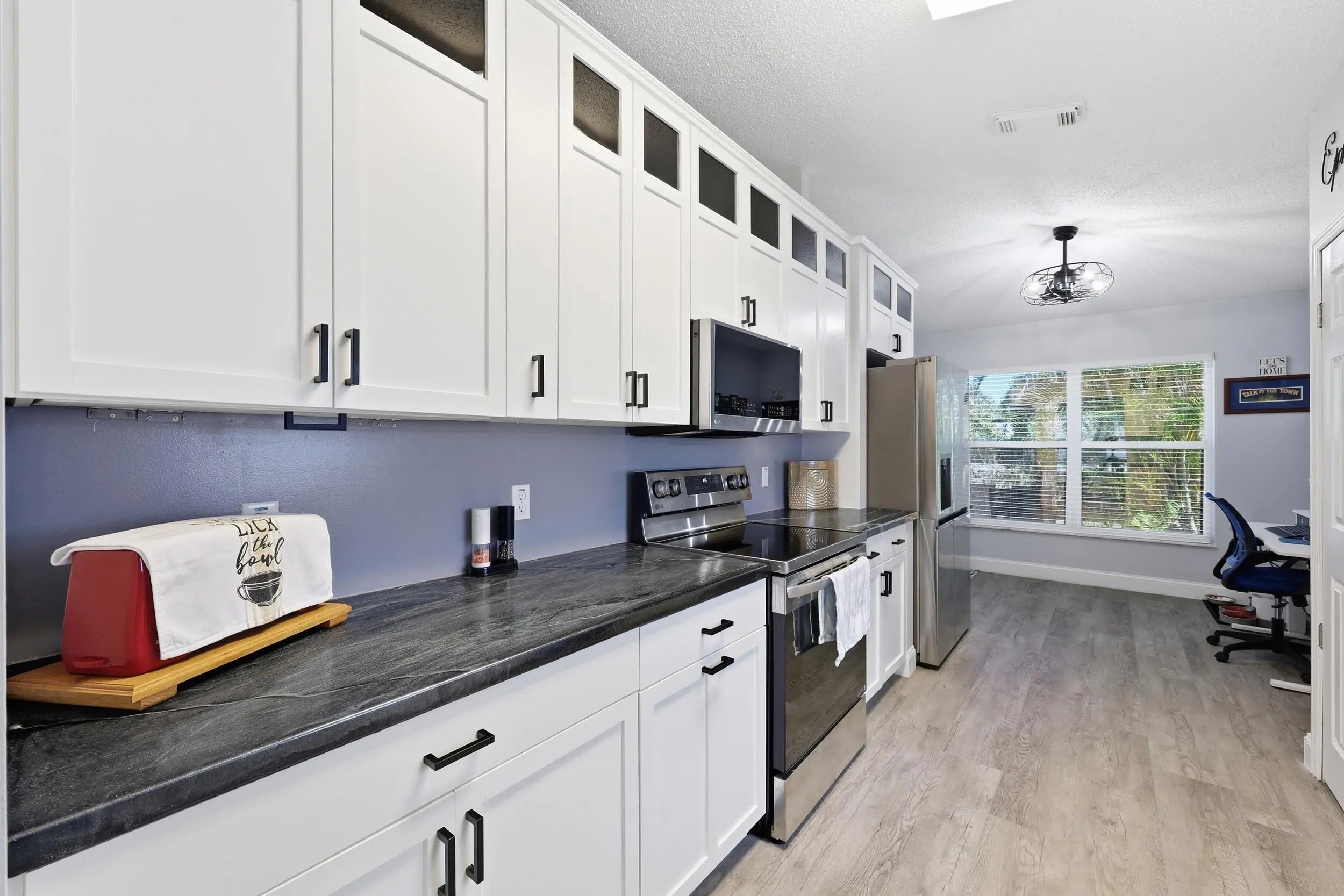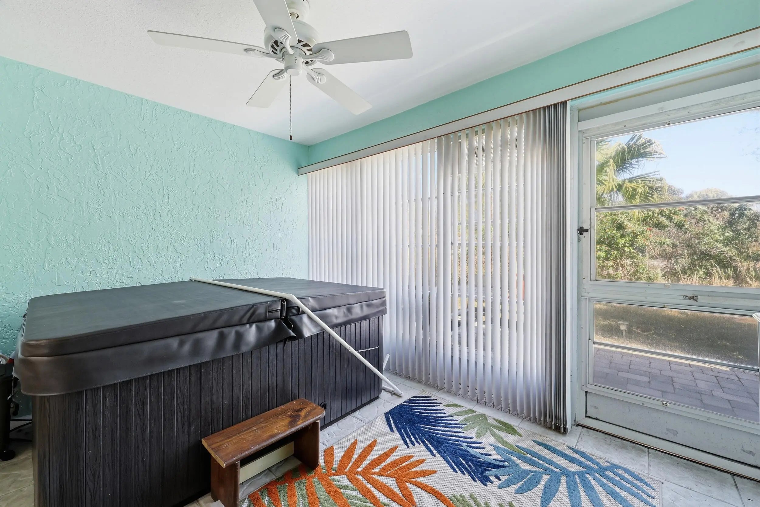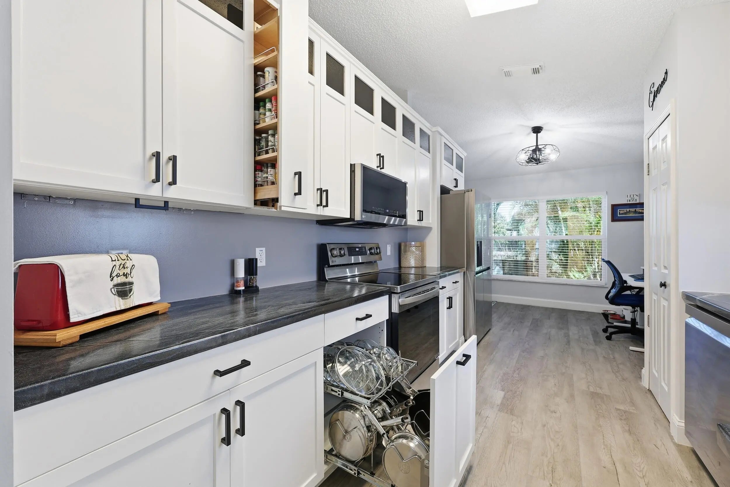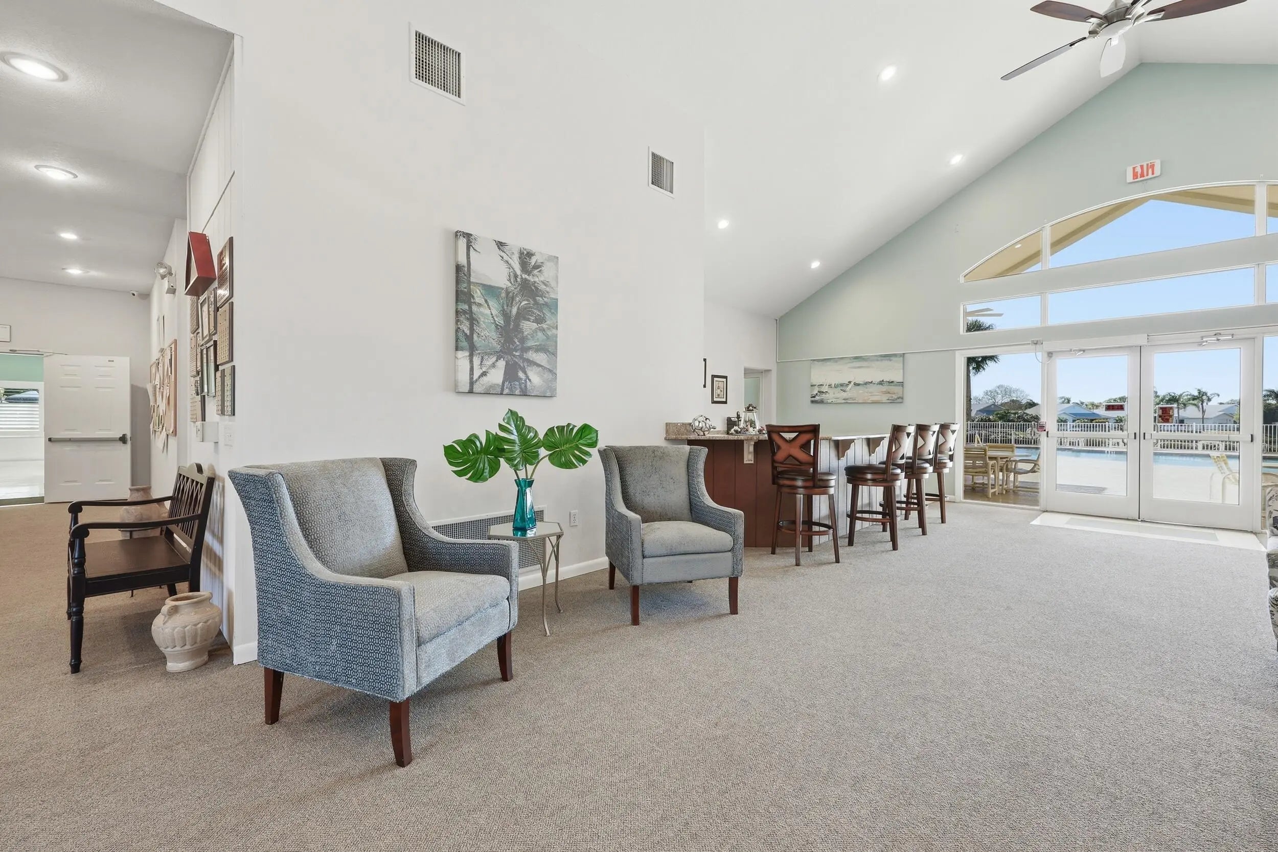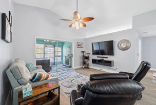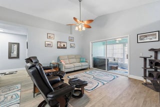 Beautifully Updated Single Family Concrete Home with extended driveway for 2-3 cars plus 1 car garage! Open living area with vaulted ceilings, beautiful chefs kitchen, 1 year old stainless appliances, pull out drawers, custom spice & knife storage, large stainless sink, BONUS room off kitchen, PLUS 2 spacious bedrooms, master has walk in closet, 2 remodeled bathrooms, enclosed private patio with hot tub. Freshly painted inside and out. Come live in resort style Palm Grove, an active 55+ community with low HOA covering: Water, Sewer, Cable, Internet, Lawn, 24/7 manned gate security, luxurious clubhouse, heated pool, exercise room, tennis, pickleball, bocce ball, shuffleboard, a variety of social clubs and events.. NO LOT RENT YOU OWN THE LAND - LOW COUNTY ONLY TAXES! MOVE IN READY