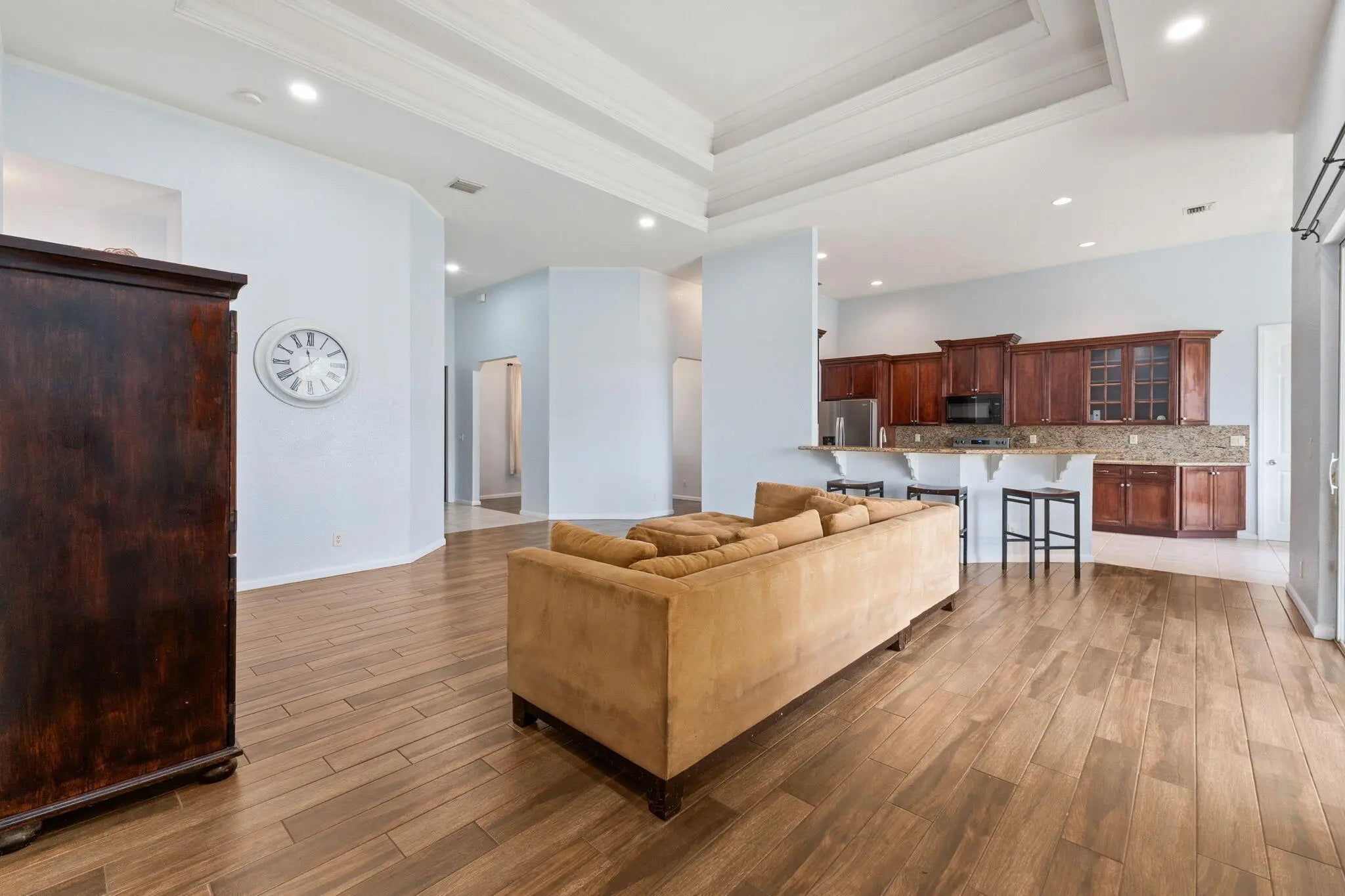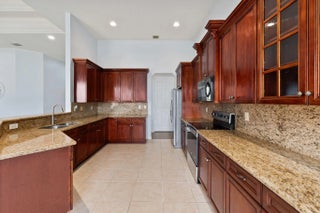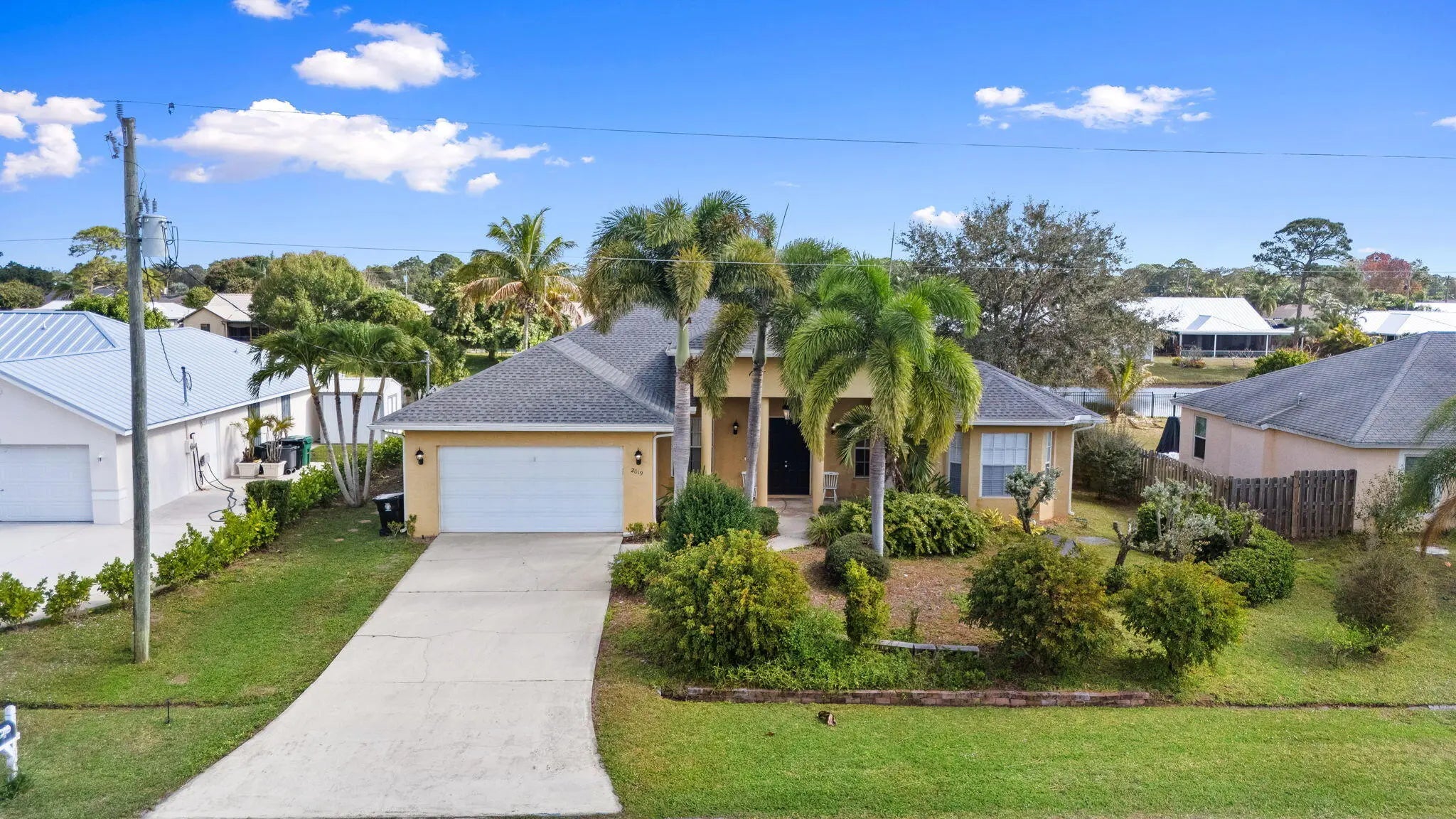 Welcome to this well-maintained home offering 5 bedrooms, 3 bathrooms, and 2-car garage with big water views, all arranged in a highly desirable split floor plan that provides privacy and flexibility. High decorative ceilings and abundant natural light create a bright, open atmosphere throughout. The kitchen is both stylish and functional, featuring all new appliances and a convenient eat-at bar, perfect for casual meals or entertaining guests. Enjoy the added convenience of a cabana bath along with a backyard that offers room for a pool with lush landscaping and coconut palms. Additional features include: water softener, full metal fencing and storage shed. Major updates: 2023 roof, 2023 water heater (10 year warranty). This move-in-ready home is ready to be called yours!