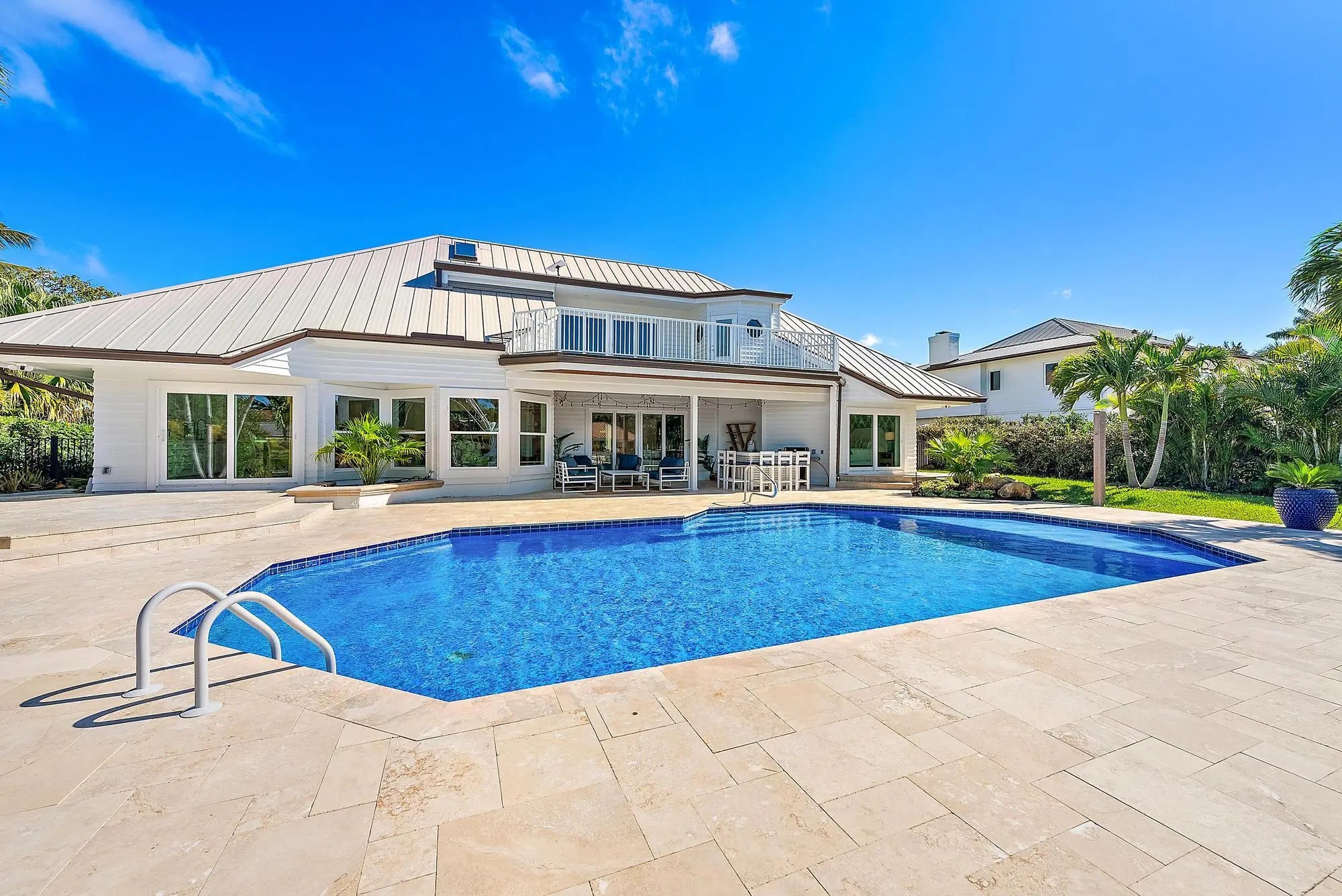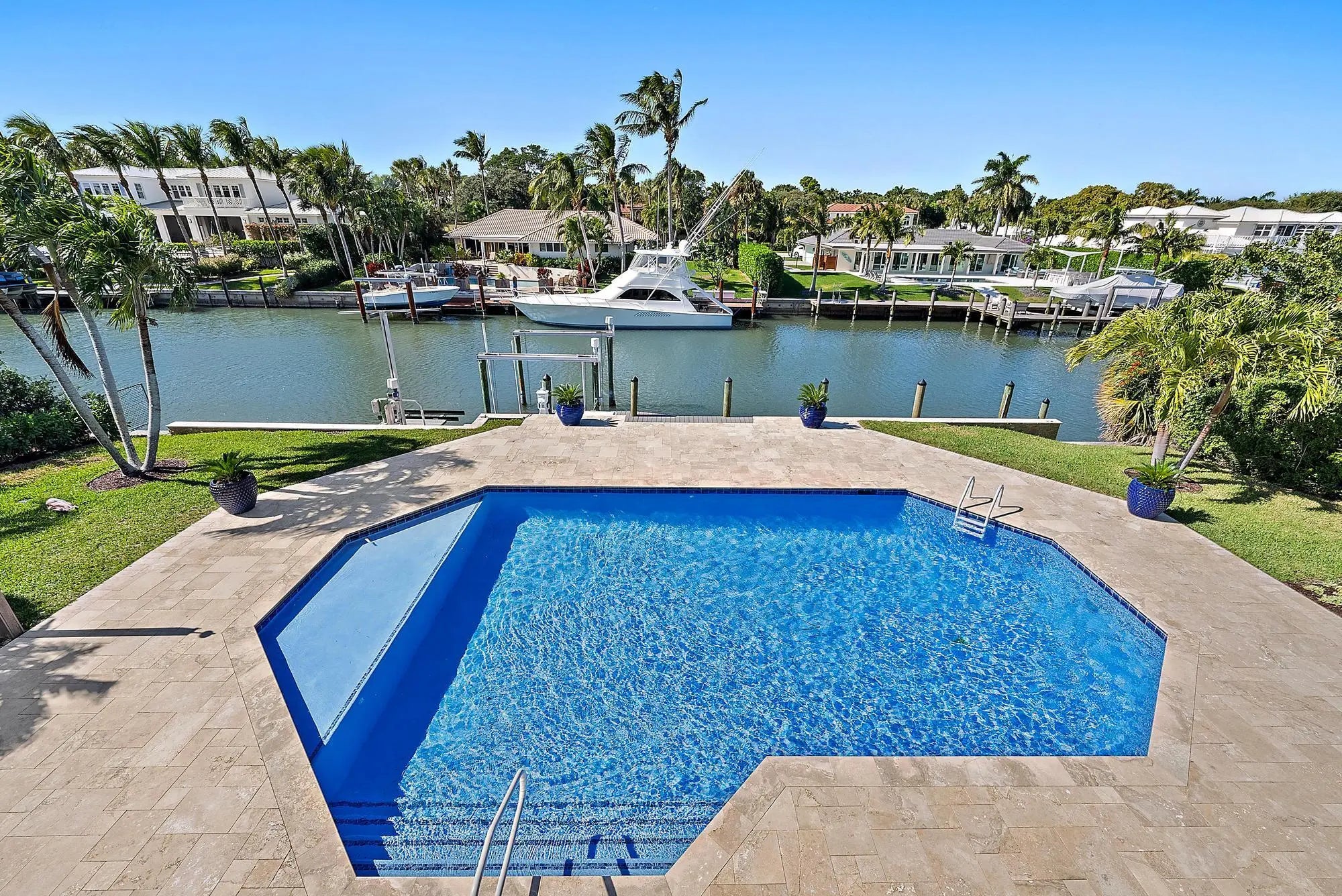 One-of-a-kind waterfront residence in the exclusive High Point Island enclave off Sewall's Point, set along a rare blue-water canal with deep-water access, completely rebuilt in 2024 to the highest standards and professionally designed. The well planned layout includes 4 spacious bedrooms, 4 1/2 baths, a den/office and the rare convenience of laundry rooms on both the main and upper levels. The gourmet kitchen features custom inset cabinetry, an impressive 10 1/2 foot island, and professional-grade Thermador appliances with a Sub-Zero refrigerator, ideal for both everyday living and entertaining. The primary suite is a private retreat offering a balcony, dual walk-in closets, a separate water closet, a soaking tub, and an oversized spa-style shower. Outdoor living is exceptional, with a custom heated pool and sun shelf, covered patio, a new 55 foot dock, 100 feet of water frontage, two boat lifts, and no fixed bridges, offering effortless access for larger vessels. Additional highlights include a 2021 metal roof, 2025 impact glass, whole-house generator, EV-ready garage, circular driveway, ample storage, and an oversized air conditioned garage with 12 foot ceilings and 30 foot depth ideal for an RV, car lift, or specialty vehicles. A rare opportunity to own a fully customized waterfront residence in one of the Treasure Coast's most desirable island communities.