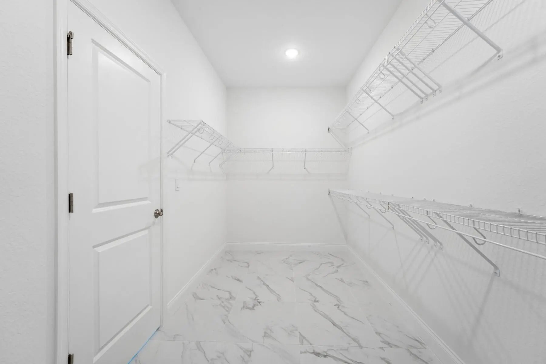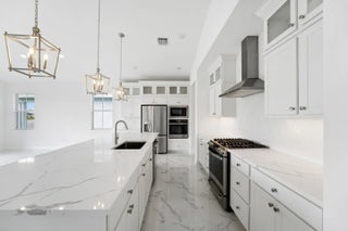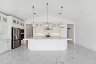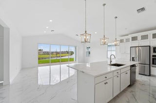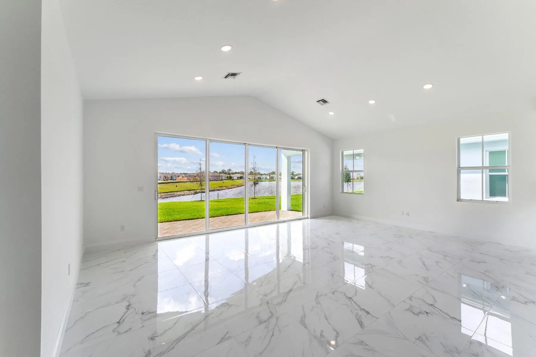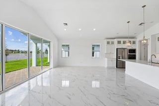 This elegantly designed Stanwyck home showcases expansive lake views, enhanced by a dramatic 16-foot multi-slide door that seamlessly connects the dining and great room to the covered patio, creating exceptional indoor-outdoor living. This home features 24 x 24-inch Artsy polished tile throughout and a chef's kitchen with crisp white cabinetry and Statuary Classique quartz countertops. The kitchen, great room, and dining area share a vaulted ceiling for an open, airy feel, while glass-front upper cabinets add timeless charm to the kitchen. A quiet home office provides a functional workspace, and the covered patio continues the vaulted ceiling for a seamless outdoor experience. The primary suite includes a private bath with dual freestanding vanities and elegant finishes, completing this exceptional lakefront residence.