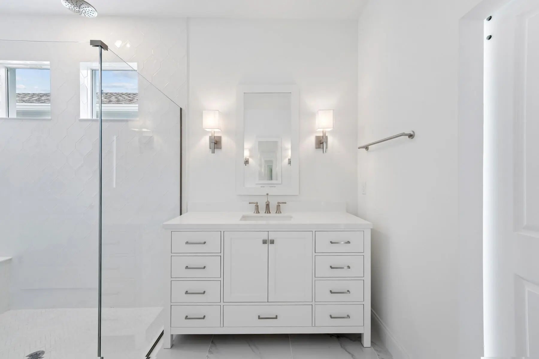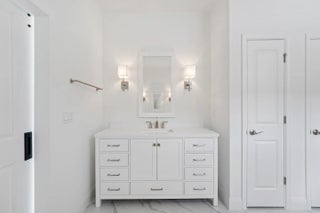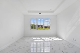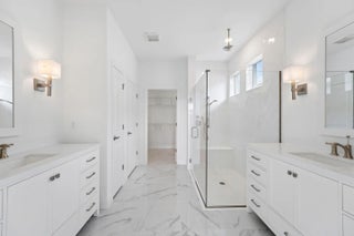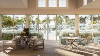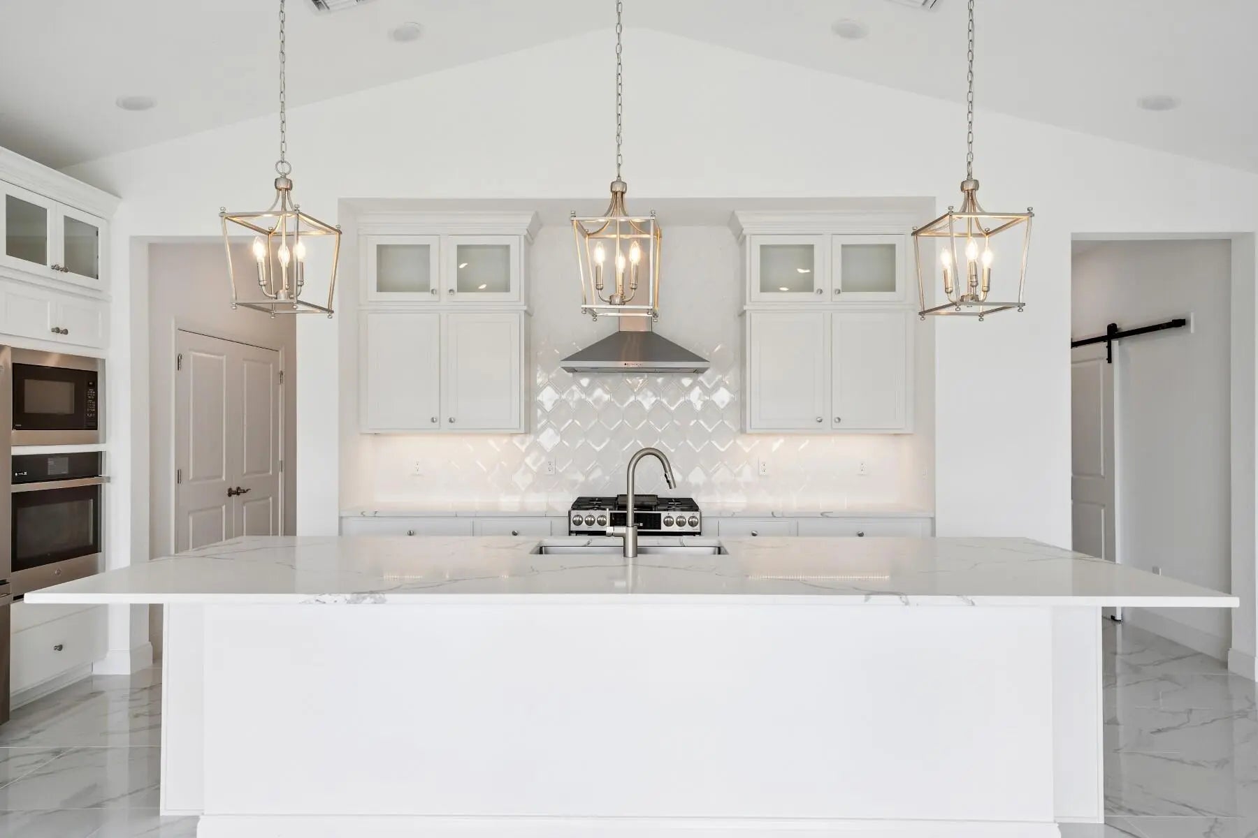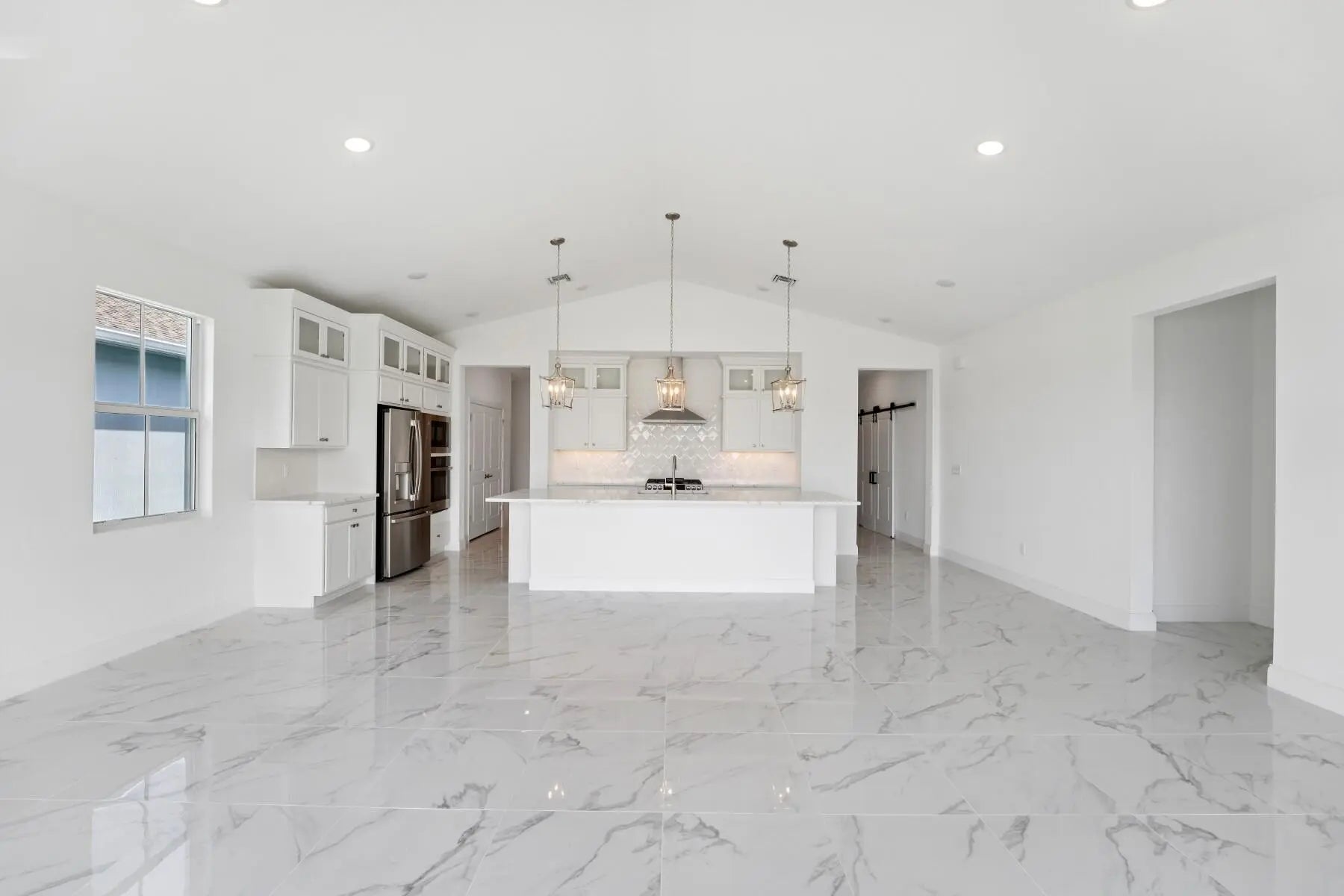 This elegantly designed Stanwyck home showcases expansive lake views, enhanced by a dramatic 16-foot multi-slide door that seamlessly connects the dining and great room to the covered patio, creating exceptional indoor-outdoor living. This home features 24 x 24-inch Artsy polished tile throughout and a chef's kitchen with crisp white cabinetry and Statuary Classique quartz countertops. The kitchen, great room, and dining area share a vaulted ceiling for an open, airy feel, while glass-front upper cabinets add timeless charm to the kitchen. A quiet home office provides a functional workspace, and the covered patio continues the vaulted ceiling for a seamless outdoor experience. The primary suite includes a private bath with dual freestanding vanities and elegant finishes, completing this exceptional lakefront residence.