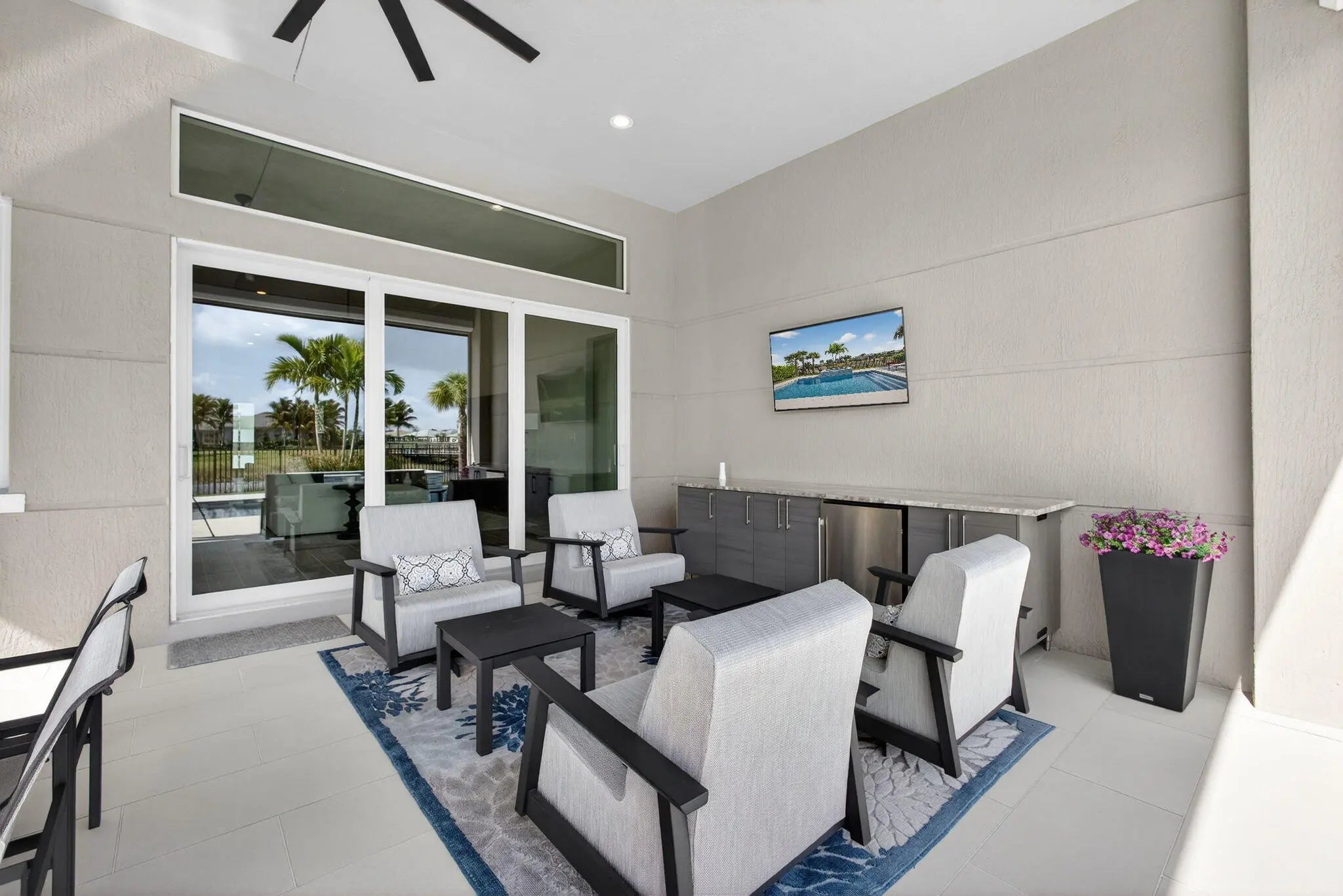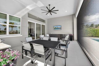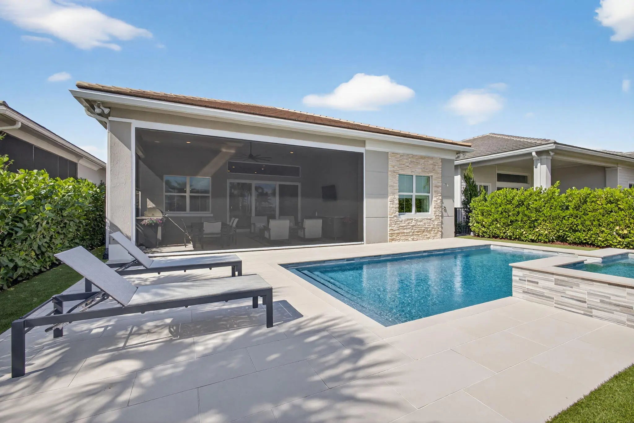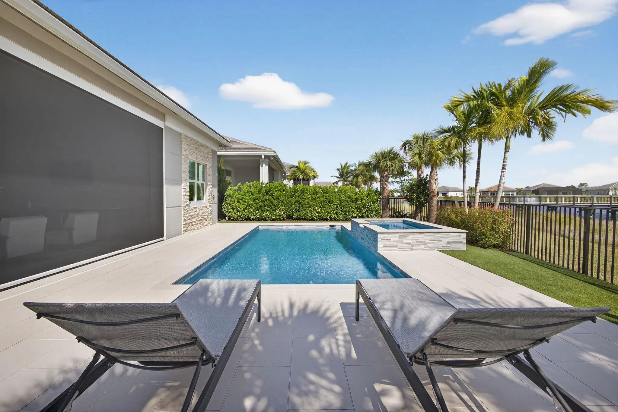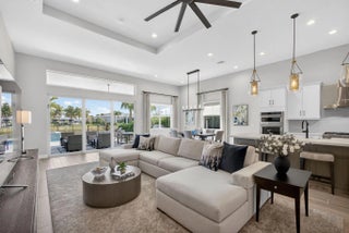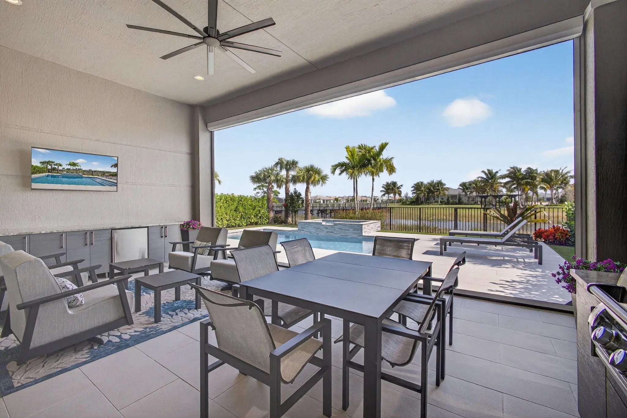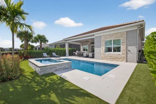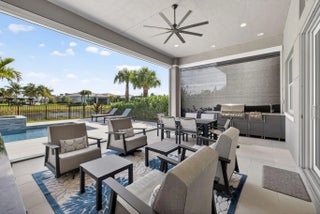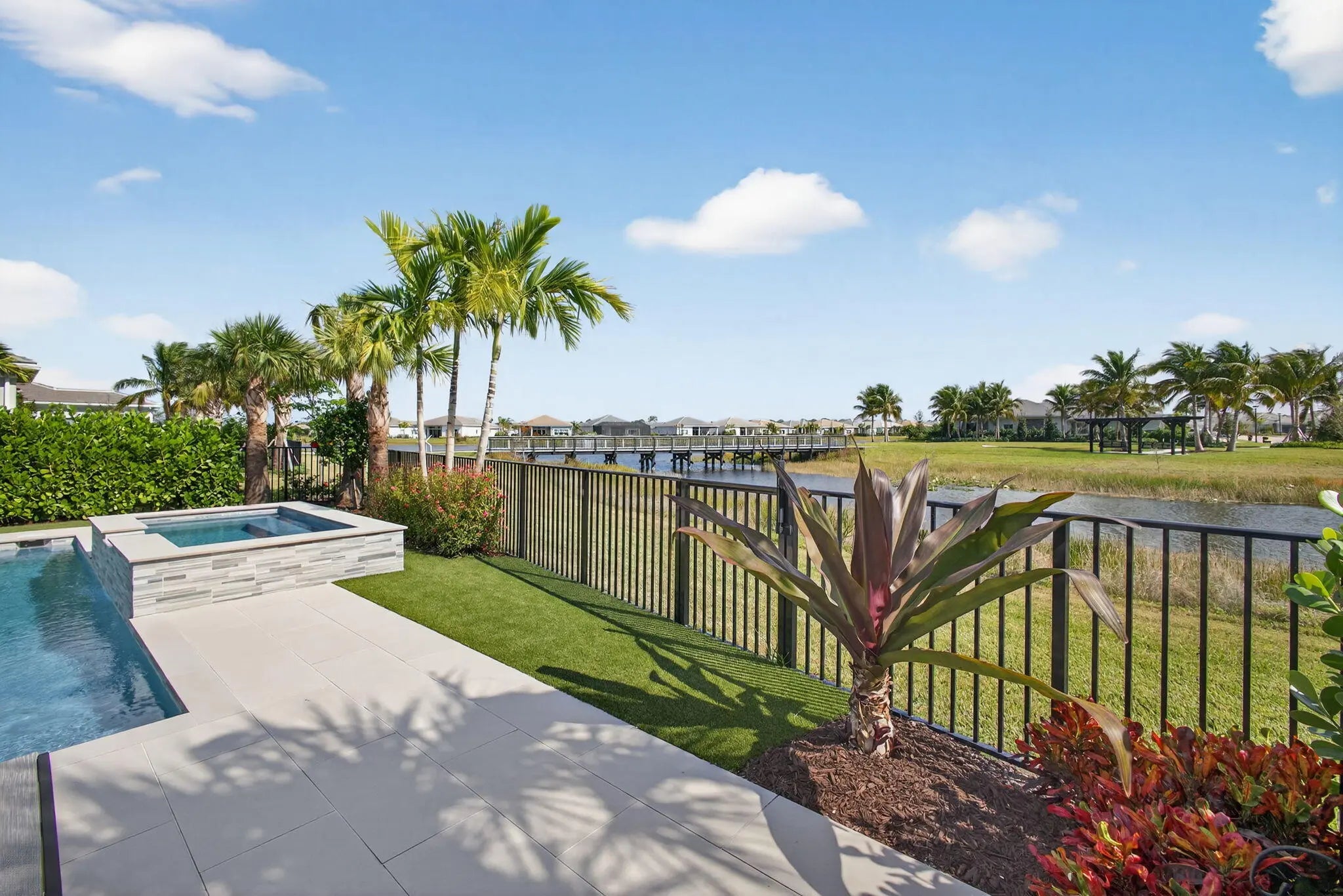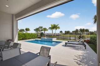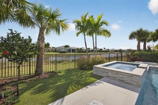 This beautifully appointed three-bedroom plus office, three-bath residence offers an open, light-filled floor plan with a refined Luxury aesthetic and breathtaking lake views. Enjoy magnificent sunrises from the oversized lanai patio, creating an idyllic setting for both entertaining and peaceful relaxation by the water. The tropical-inspired backyard is a private retreat, featuring a custom upgraded heated pool and spa, astro turf, lush enhanced landscaping, an outdoor shower, upgraded designer pavers, and remote-controlled patio screens that allow for year-round comfort and seamless indoor-outdoor living. This home reflects thoughtful custom design and extensive upgrades throughout, including custom built-ins in the office and hallway niche, designer lighting fixtures, ceiling fans, built-in closets, and custom Hunter Douglas blinds and drapery on all windows. Additional enhancements include a whole-house RFG air purification system, electrical upgrades, a whole-house water filtration system, and a custom outdoor kitchen with cabinetry. Extended Great room, Dining room, Primary Suite and garage. This exceptional home blends luxury, comfort, and modern functionality, offering an elevated lifestyle in a tranquil waterfront setting. Experience private, resort-style living at its finest in this vibrant Regency Avenir community. Located in the sought-after Palm Beach Gardens, this community blends contemporary home designs with exceptional amenities, all set in a relaxed and inviting atmosphere. Residents of Regency at Avenir in sought after Palm Beach Gardens enjoy exclusive access to The Pearl, the community's 22,000 sqft private clubhouse offering an onsite activities director, a wide array of special interest clubs, activities, and events. Amenities at The Pearl include a picturesque resort-style pool, spa, pickleball, tennis, two fitness centers, wine storage, card and game rooms, ball room, indoor/outdoor lounge, a golf simulator, outdoor amphitheater, outdoor game area and much more. Conveniently located near Sand Hill Crane Golf Club an 18-hole championship course, The new Nest Par 3 Course and various dining options. Across the street is PGA National's Estate Course, with membership options available. Minutes away from shopping, dining, the Airport, Palm Beach and so much more.