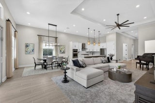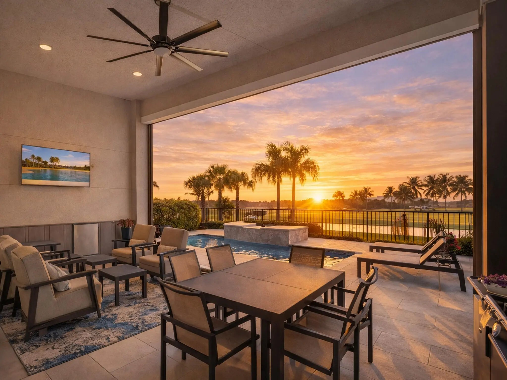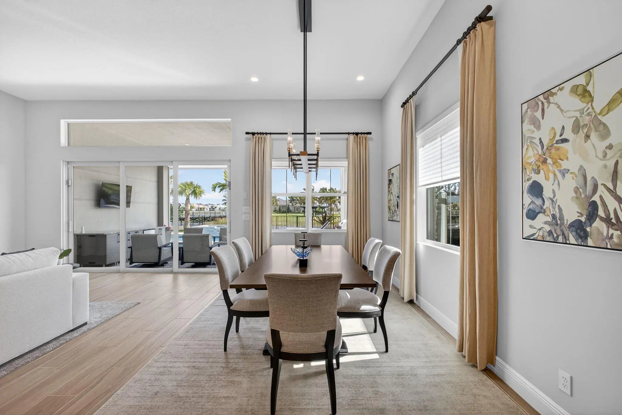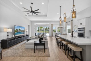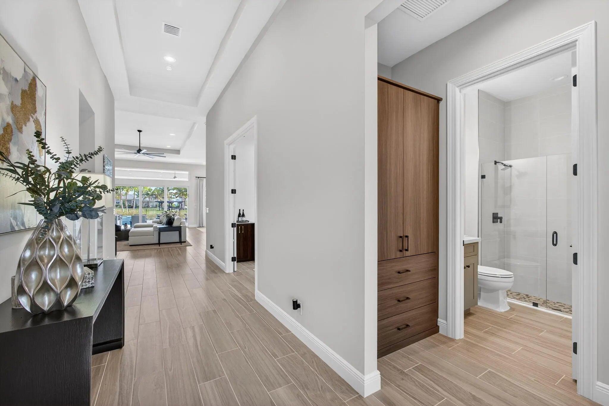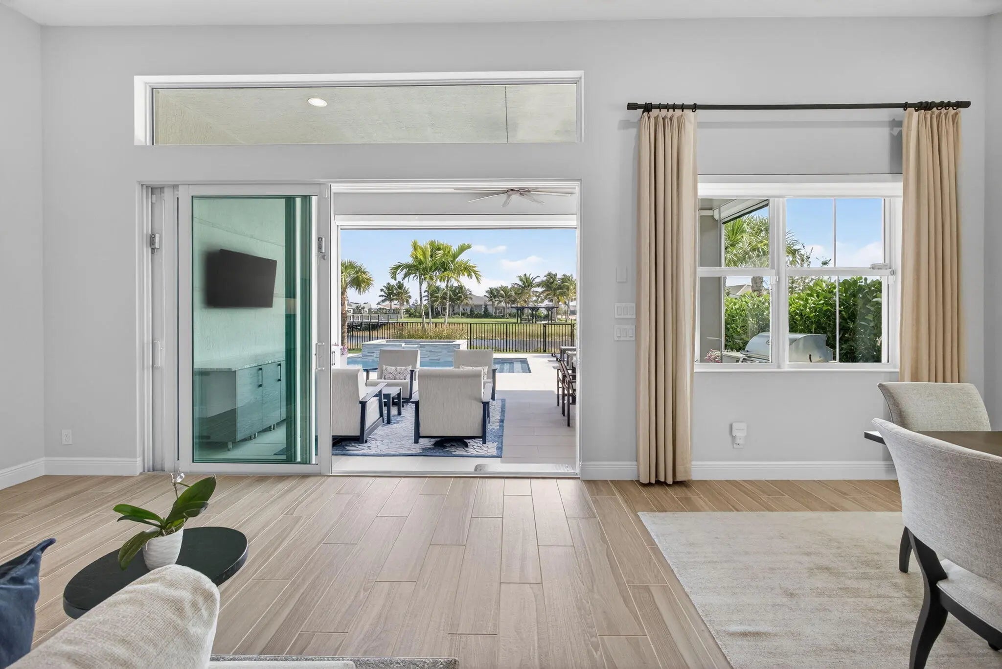 This beautifully appointed three-bedroom plus office, three-bath residence offers an open, light-filled floor plan with a refined Luxury aesthetic and breathtaking lake views. Enjoy magnificent sunrises from the oversized lanai patio, creating an idyllic setting for both entertaining and peaceful relaxation by the water. The tropical-inspired backyard is a private retreat, featuring a custom upgraded heated pool and spa, astro turf, lush enhanced landscaping, an outdoor shower, upgraded designer pavers, and remote-controlled patio screens that allow for year-round comfort and seamless indoor-outdoor living. This home reflects thoughtful custom design and extensive upgrades throughout, including custom built-ins in the office and hallway niche, designer lighting fixtures, ceiling fans, built-in closets, and custom Hunter Douglas blinds and drapery on all windows. Additional enhancements include a whole-house RFG air purification system, electrical upgrades, a whole-house water filtration system, and a custom outdoor kitchen with cabinetry. Extended Great room, Dining room, Primary Suite and garage. This exceptional home blends luxury, comfort, and modern functionality, offering an elevated lifestyle in a tranquil waterfront setting. Experience private, resort-style living at its finest in this vibrant Regency Avenir community. Located in the sought-after Palm Beach Gardens, this community blends contemporary home designs with exceptional amenities, all set in a relaxed and inviting atmosphere. Residents of Regency at Avenir in sought after Palm Beach Gardens enjoy exclusive access to The Pearl, the community's 22,000 sqft private clubhouse offering an onsite activities director, a wide array of special interest clubs, activities, and events. Amenities at The Pearl include a picturesque resort-style pool, spa, pickleball, tennis, two fitness centers, wine storage, card and game rooms, ball room, indoor/outdoor lounge, a golf simulator, outdoor amphitheater, outdoor game area and much more. Conveniently located near Sand Hill Crane Golf Club an 18-hole championship course, The new Nest Par 3 Course and various dining options. Across the street is PGA National's Estate Course, with membership options available. Minutes away from shopping, dining, the Airport, Palm Beach and so much more.