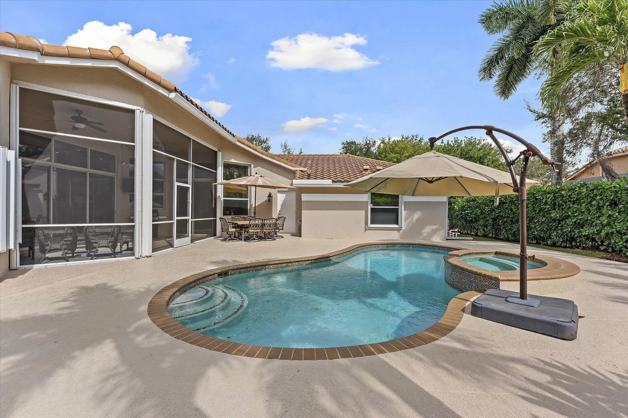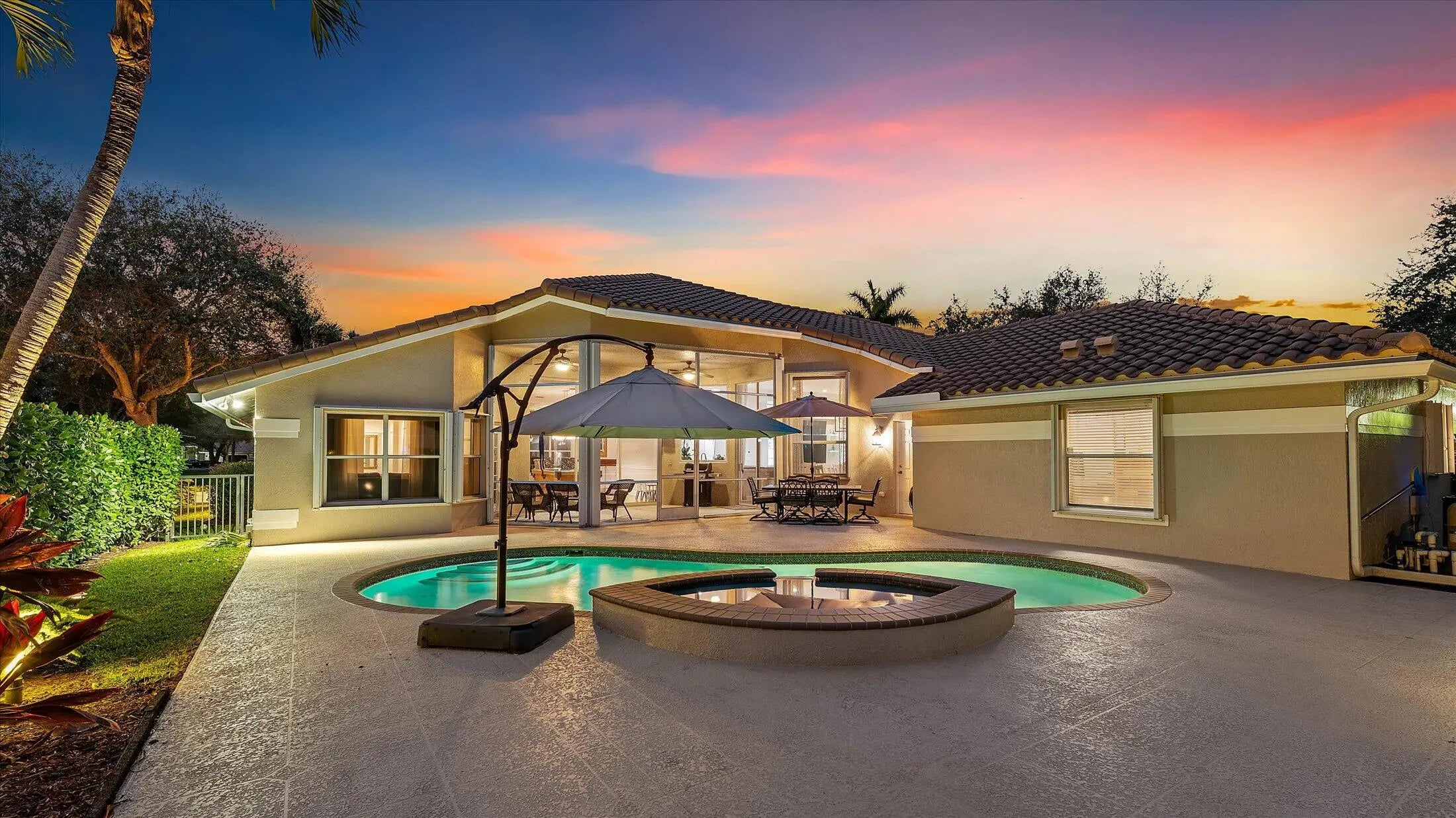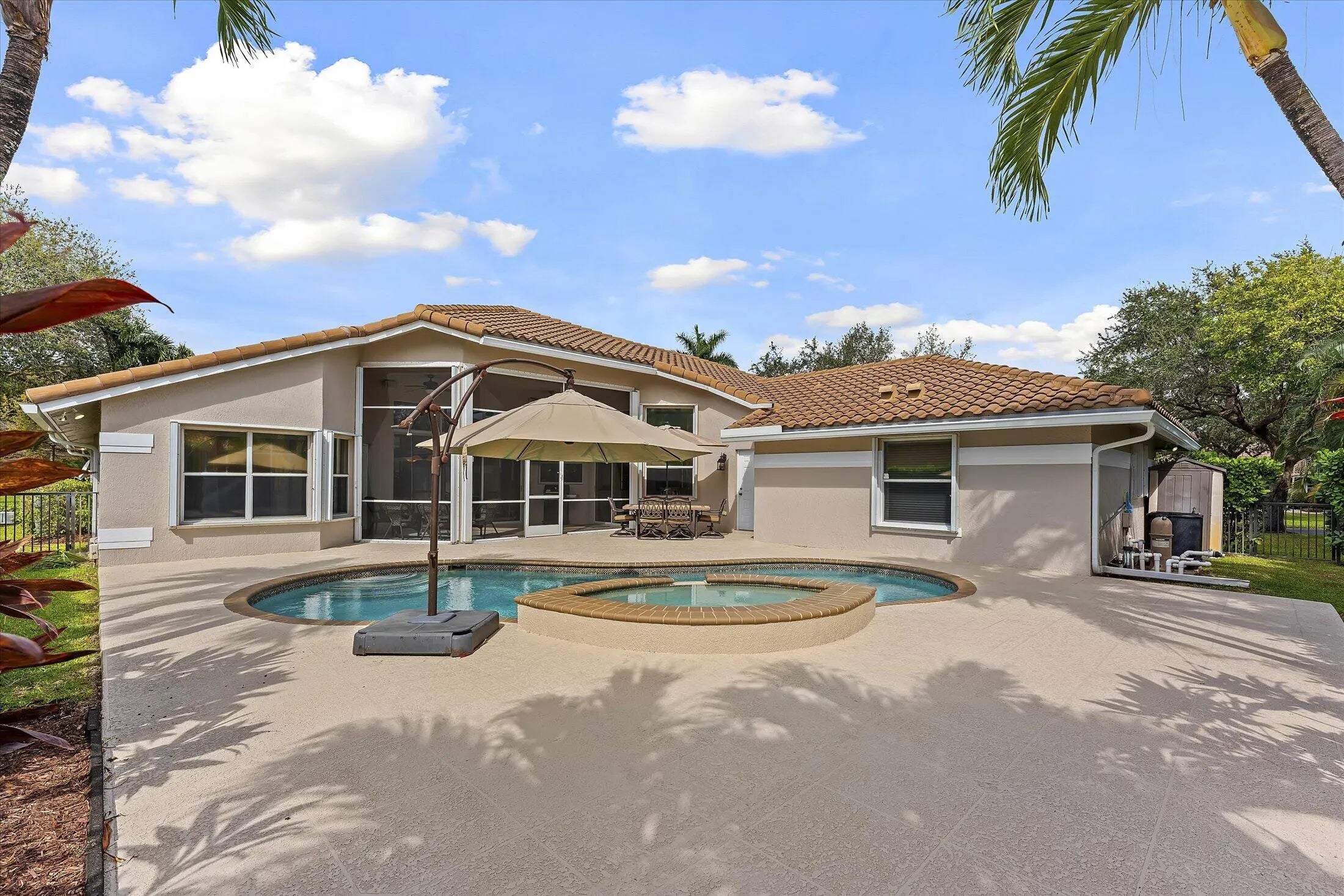 SPACIOUS & quiet, this single-owner 4-bed, 3.5-bath home is perfectly positioned on a corner lot on a double cul-de-sac. The large kitchen layout and family room create a great area for everyday living and entertaining. Gorgeous new wall unit with 3 TVs will keep everyone entertained! Storage and space is abundant throughout: 3 walk-in closets in the primary suite and 2 pantry closets in the kitchen. The oversized 3-car garage provides extra room for large vehicles, storage, or hobbies. Major upgrades include a 2020 ROOF, full accordion hurricane shutters, and impact-rated front & garage doors. Outdoors, relax on your front porch and in the backyard, enjoy a partial screened-in patio & a heated pool & spa, completely fenced-in. Gated community. Walk to A-rated schools!
