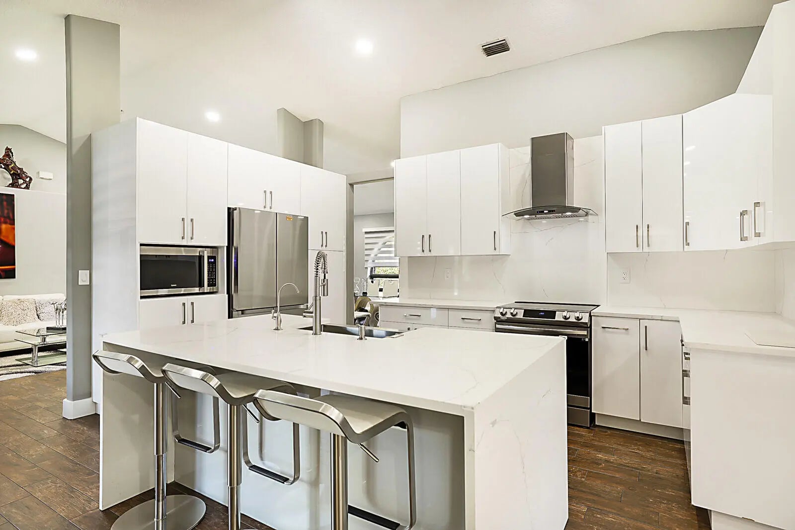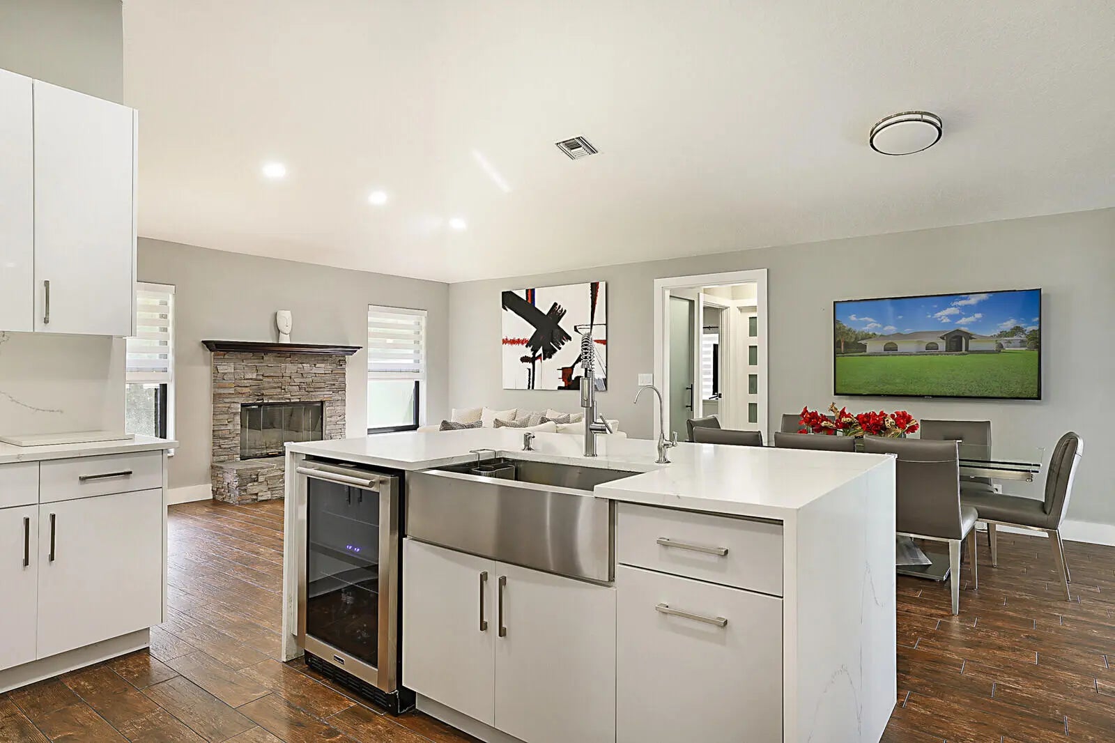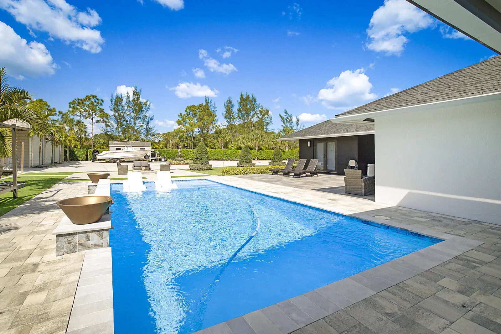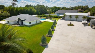 SPECIALTY PROPERTY! ONE-OF-A-KIND POOL HOME on a spacious 1.7-acre lot offers the perfect blend of indoor comfort and outdoor living. This 3-bedroom, 2-bathroom home features a 2024 roof, impact windows and doors, and an open-concept layout with vaulted ceilings. The modern kitchen includes quartz waterfall countertops, updated appliances, ample cabinetry, and recessed lighting. Both bathrooms have been tastefully updated with contemporary finishes. Step outside to a private oasis with a heated saltwater pool (2021), expansive pool deck, and designated entertainment area. There is an attached 2-car garage PLUS there is a detached 3-car garage ideal for boats, RVs, motorcycles, more storage and flex space. The extra poured concrete extends the driveway throughout the property. So MUCH MORE